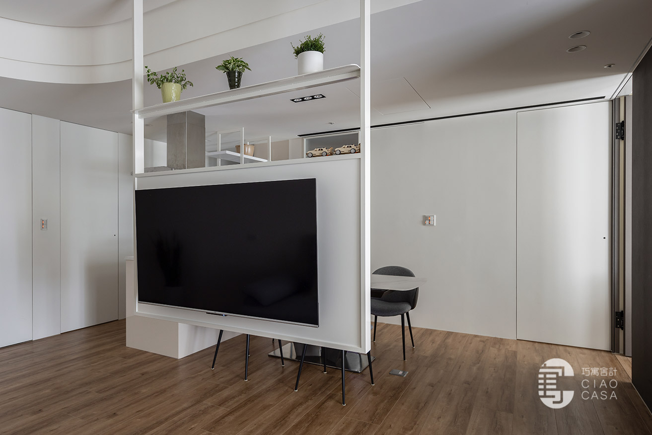 對設計師而言,能與人互動的空間,才是真正有價值的空間。以鏤空鐵件構築的電視牆,由上而下將場域溫柔對分,不僅在平面佈局中呈現立體構圖,也定錨了場域的軸心,當孩子繞轉著追逐奔跑,所形成動態的圓,便構成家的生命力所在,圓滿了一種超越形式的情感共鳴。