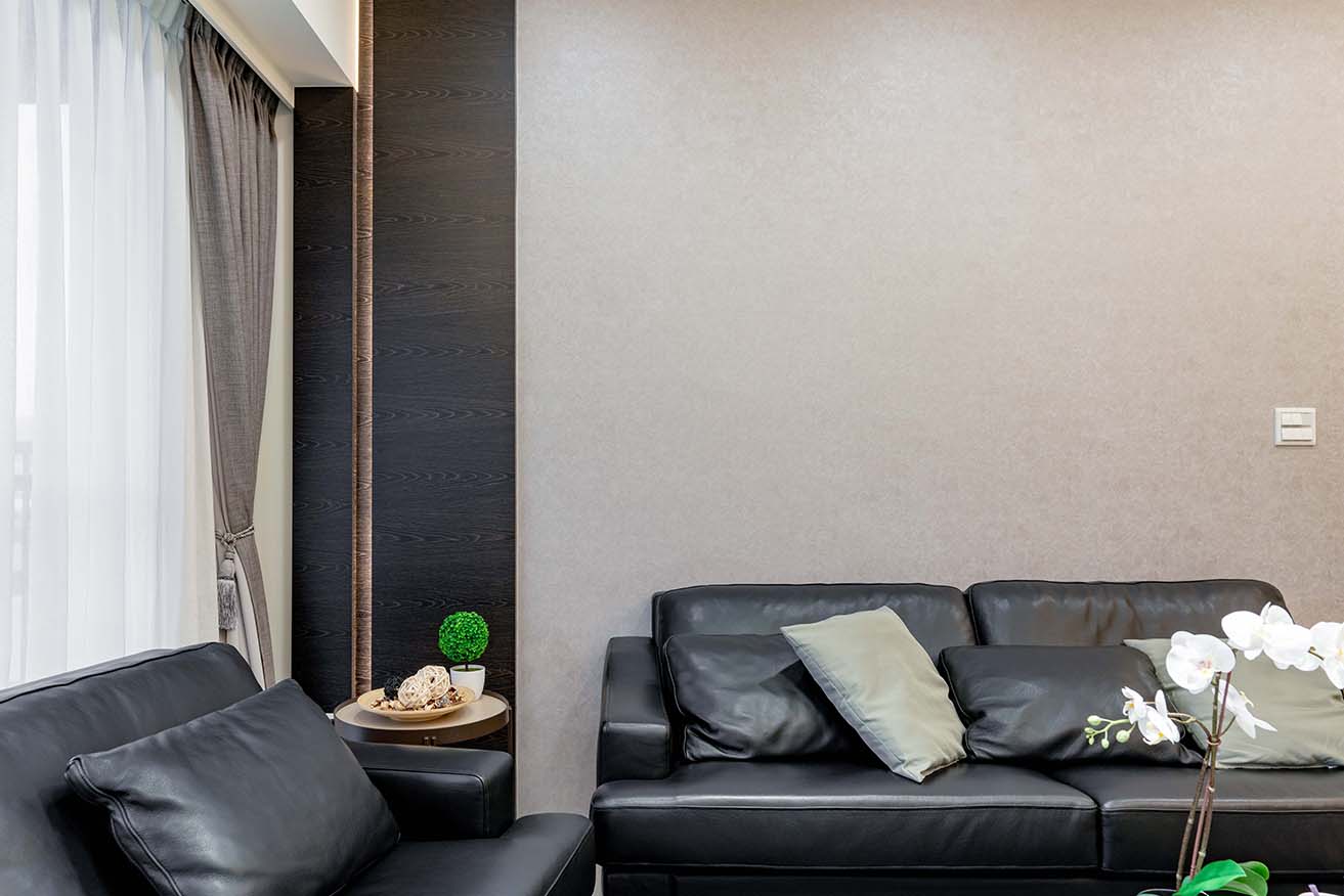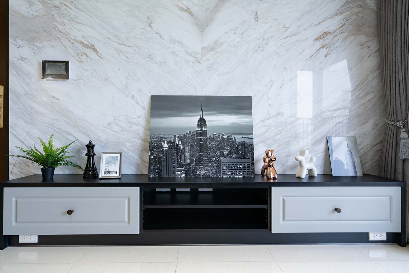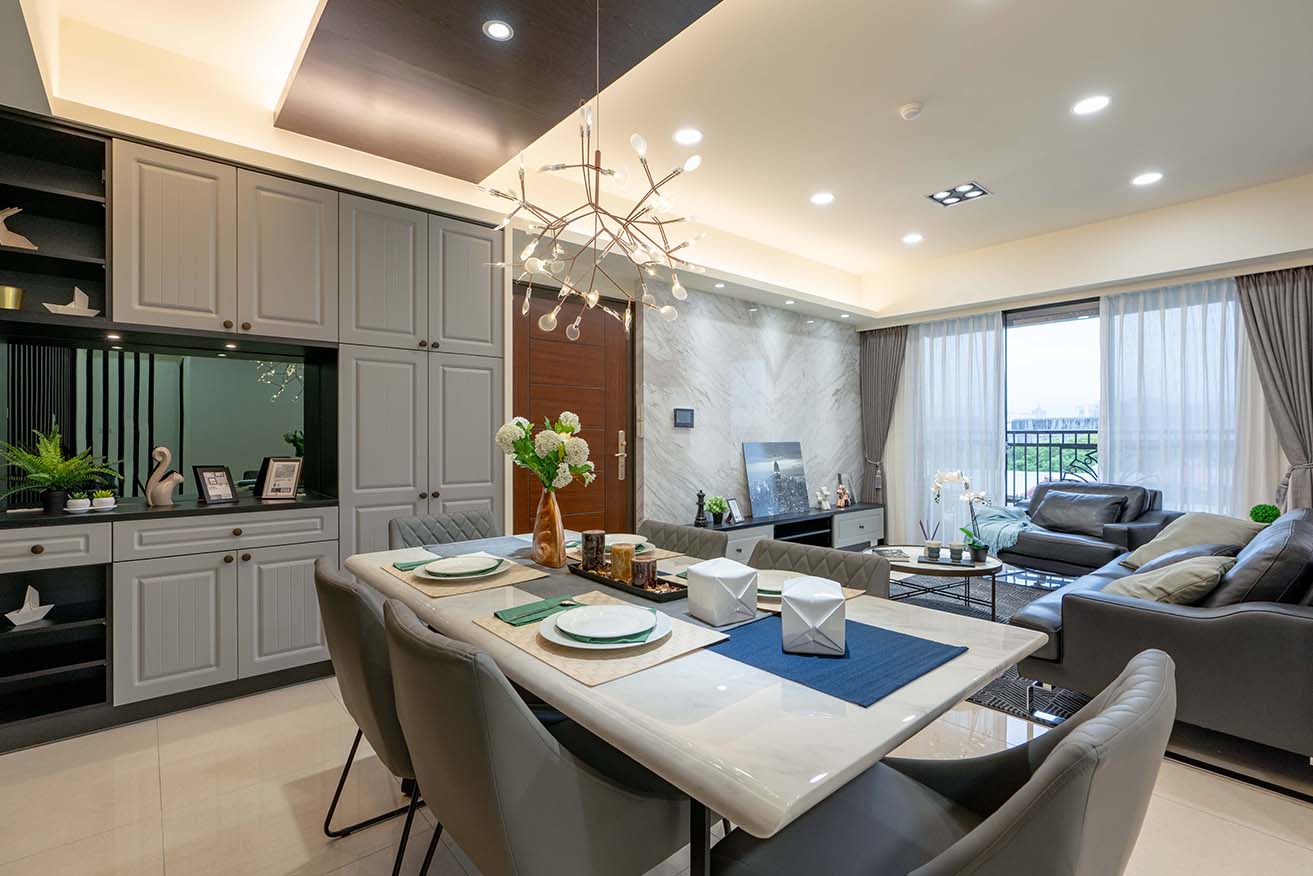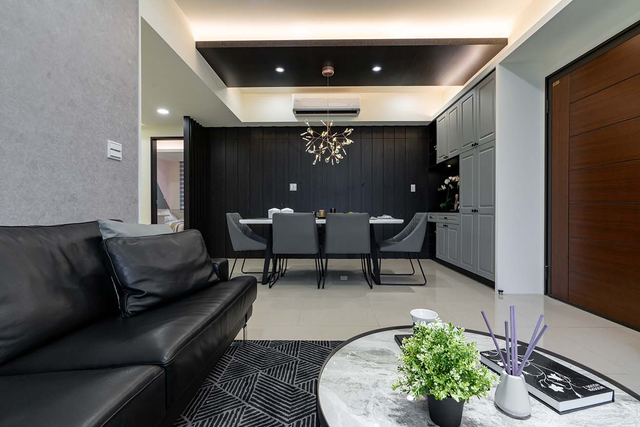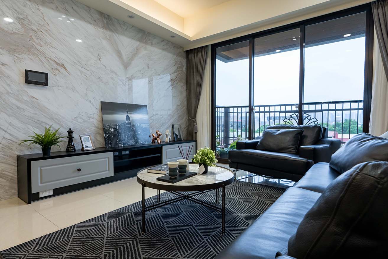 以「沉穩」為設計主軸,在公領域使用瑰麗大理石牆面及桌面,表現恢弘壯麗氣韻,並縮短牆面長度加強空間開闊性,讓景深無限放大。並在沙發背牆後的設置多功能室及書房,讓屋主得以在此閱讀休憩等。而扮演收納要角的系統櫃,則以黑色為主脈,仿皮質面板包裝,訴說卓越非凡的精緻語彙。