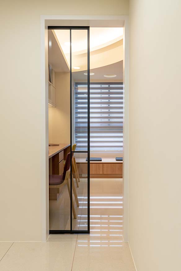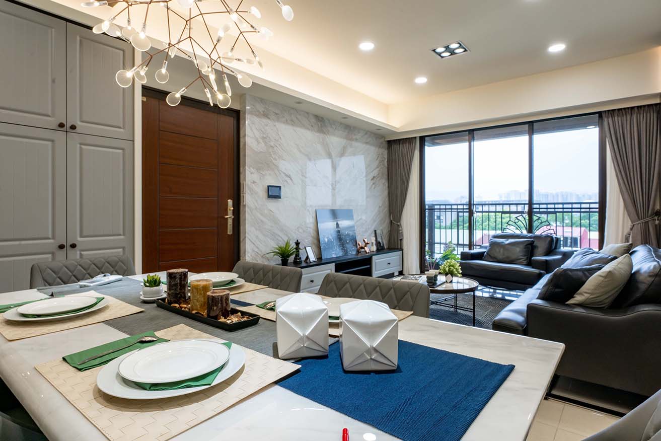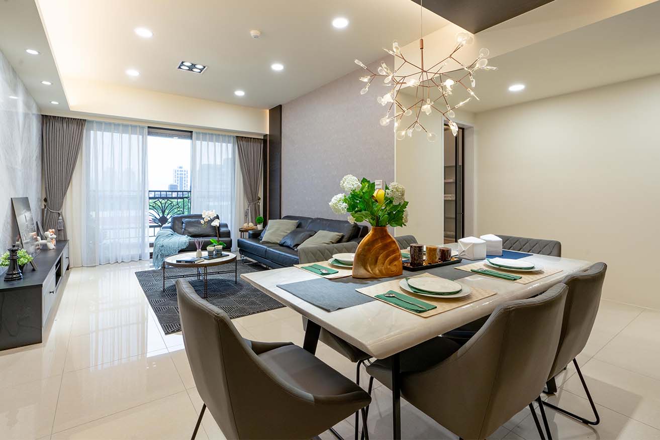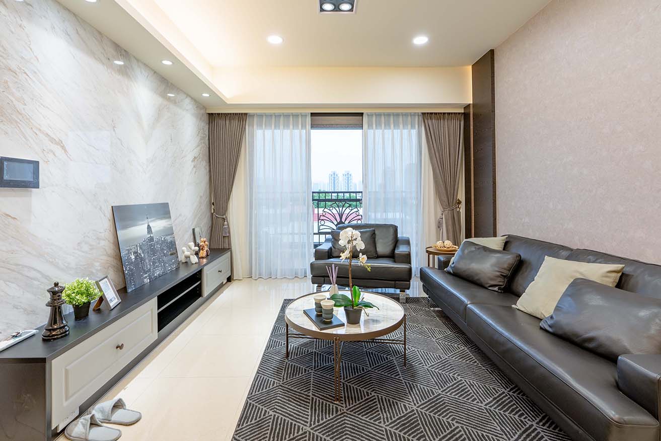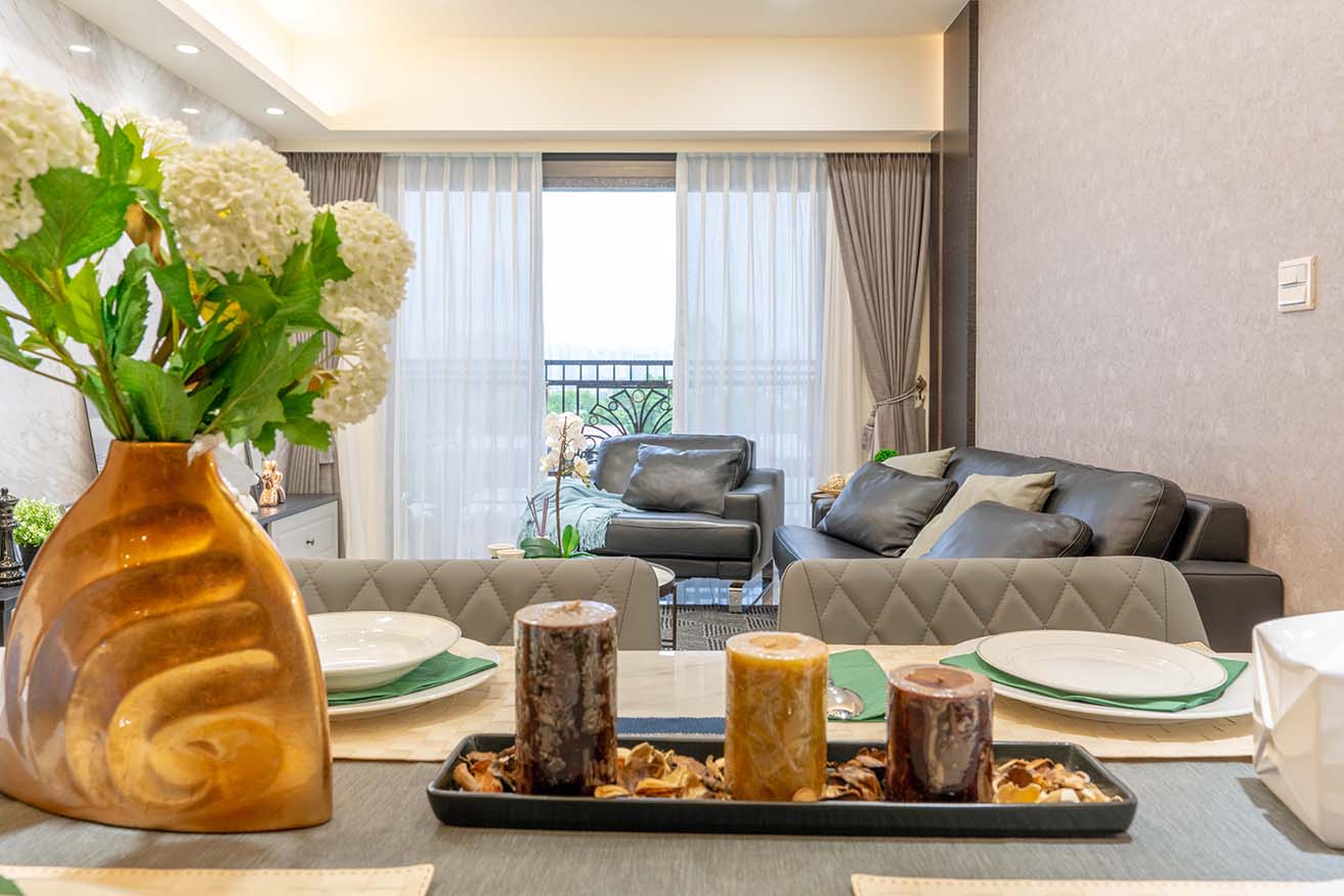 以「沉穩」為設計主軸,在公領域使用瑰麗大理石牆面及桌面,表現恢弘壯麗氣韻,並縮短牆面長度加強空間開闊性,讓景深無限放大。並在沙發背牆後的設置多功能室及書房,讓屋主得以在此閱讀休憩等。而扮演收納要角的系統櫃,則以黑色為主脈,仿皮質面板包裝,訴說卓越非凡的精緻語彙。