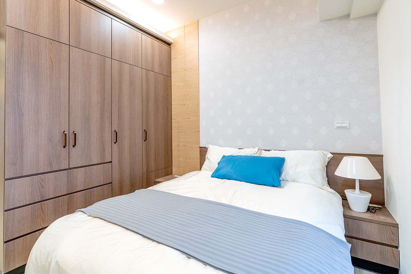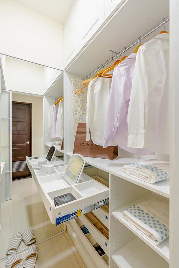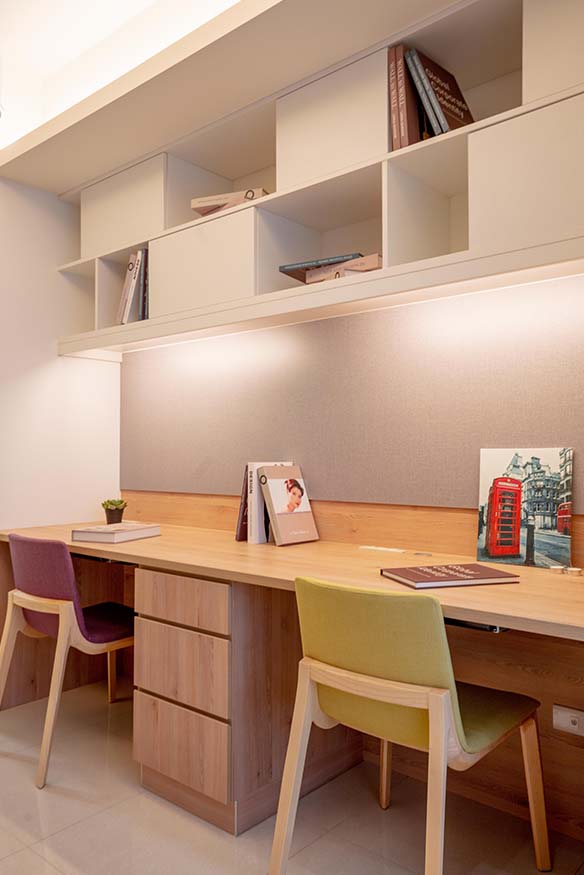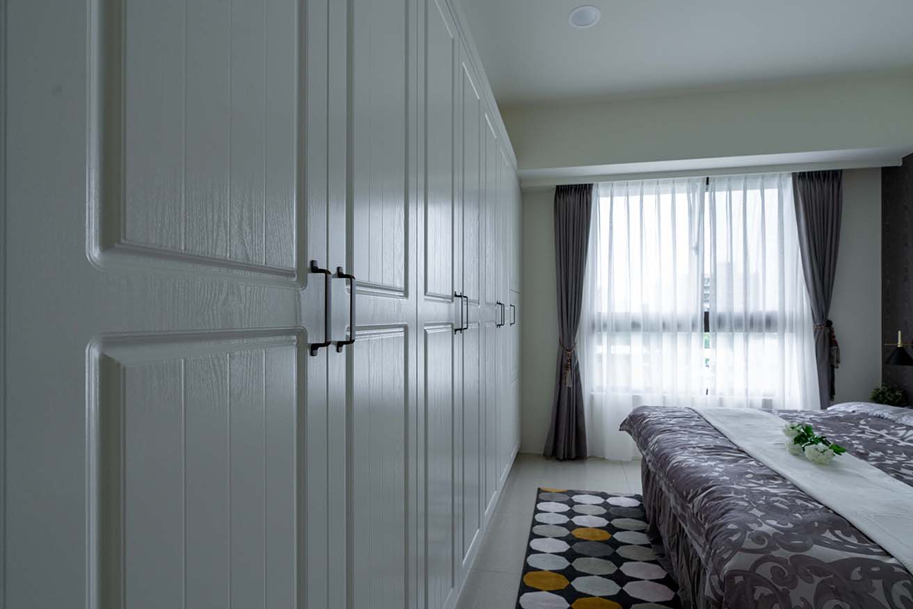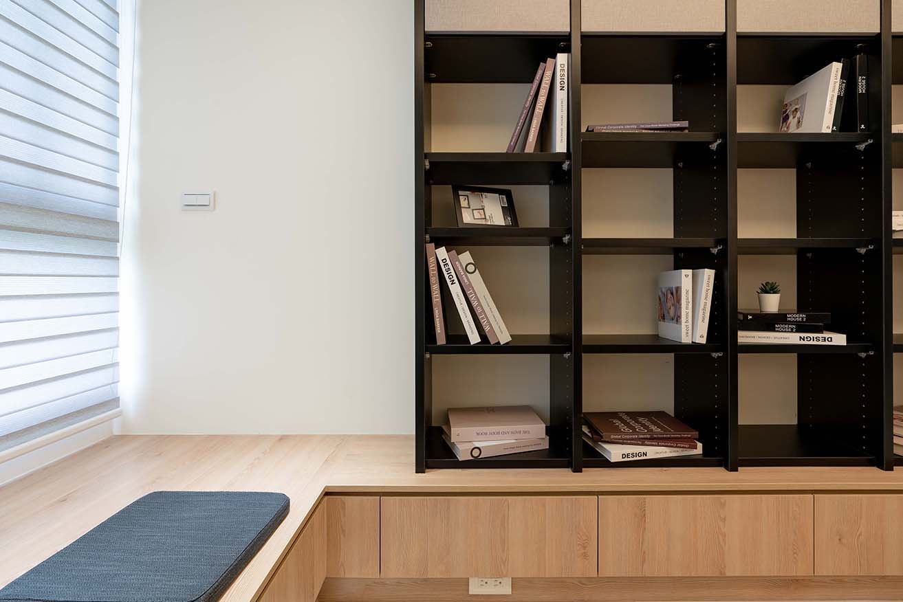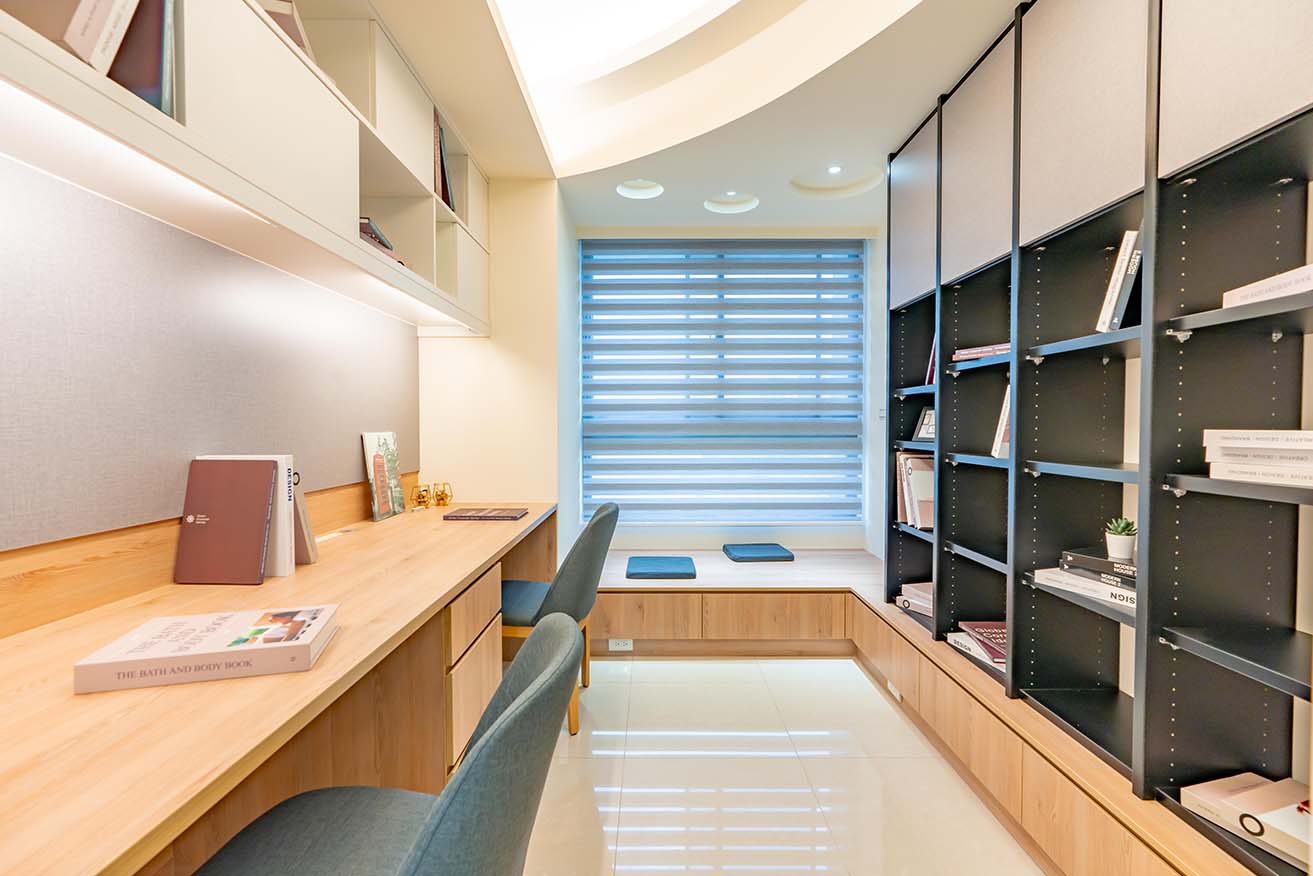 以「沉穩」為設計主軸,在公領域使用瑰麗大理石牆面及桌面,表現恢弘壯麗氣韻,並縮短牆面長度加強空間開闊性,讓景深無限放大。並在沙發背牆後的設置多功能室及書房,讓屋主得以在此閱讀休憩等。而扮演收納要角的系統櫃,則以黑色為主脈,仿皮質面板包裝,訴說卓越非凡的精緻語彙。