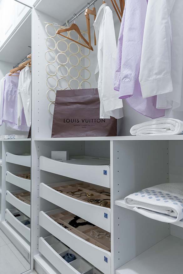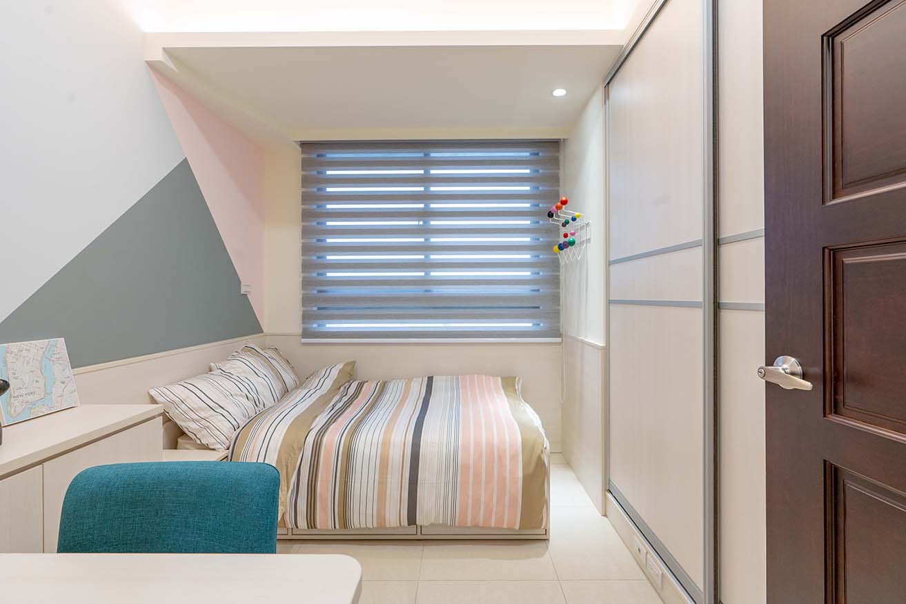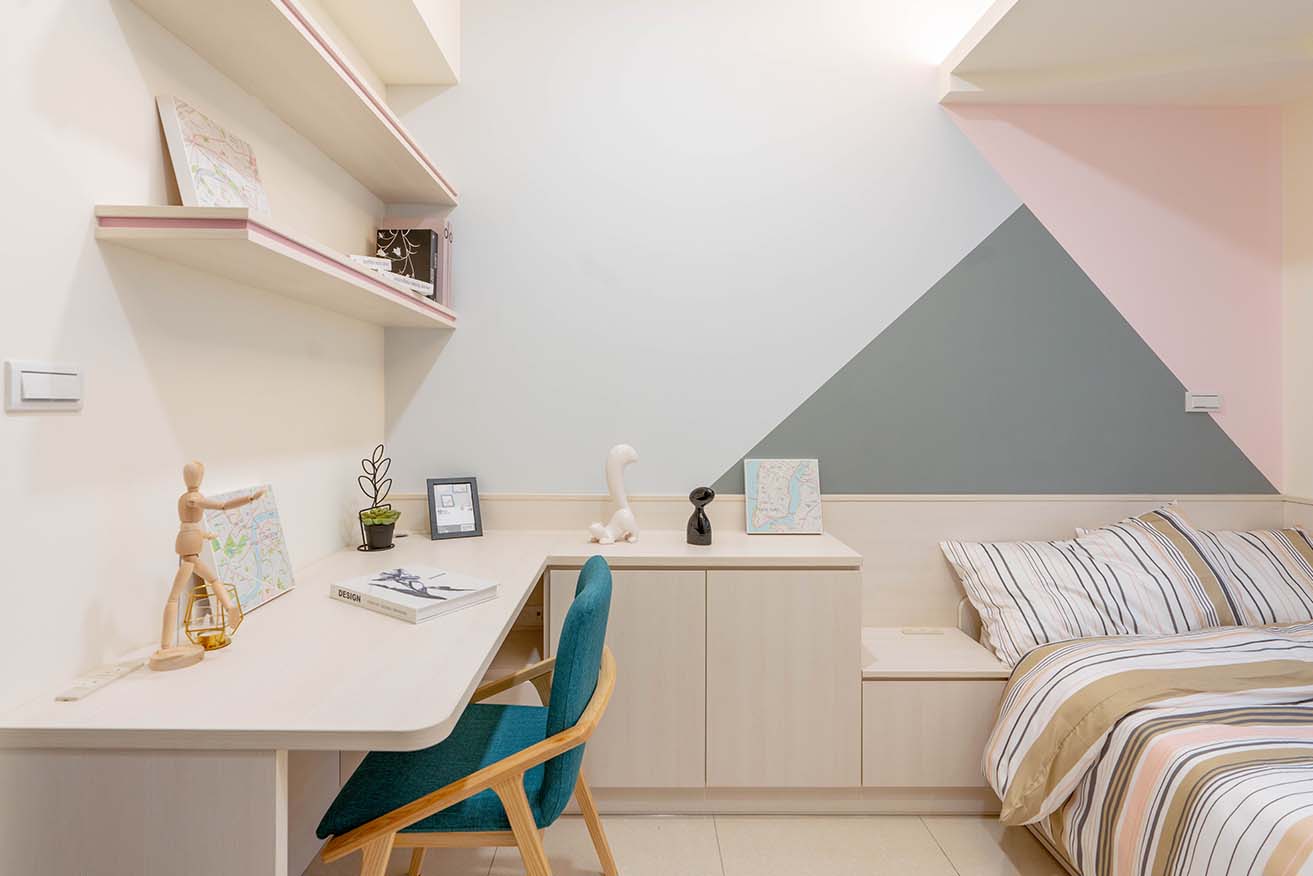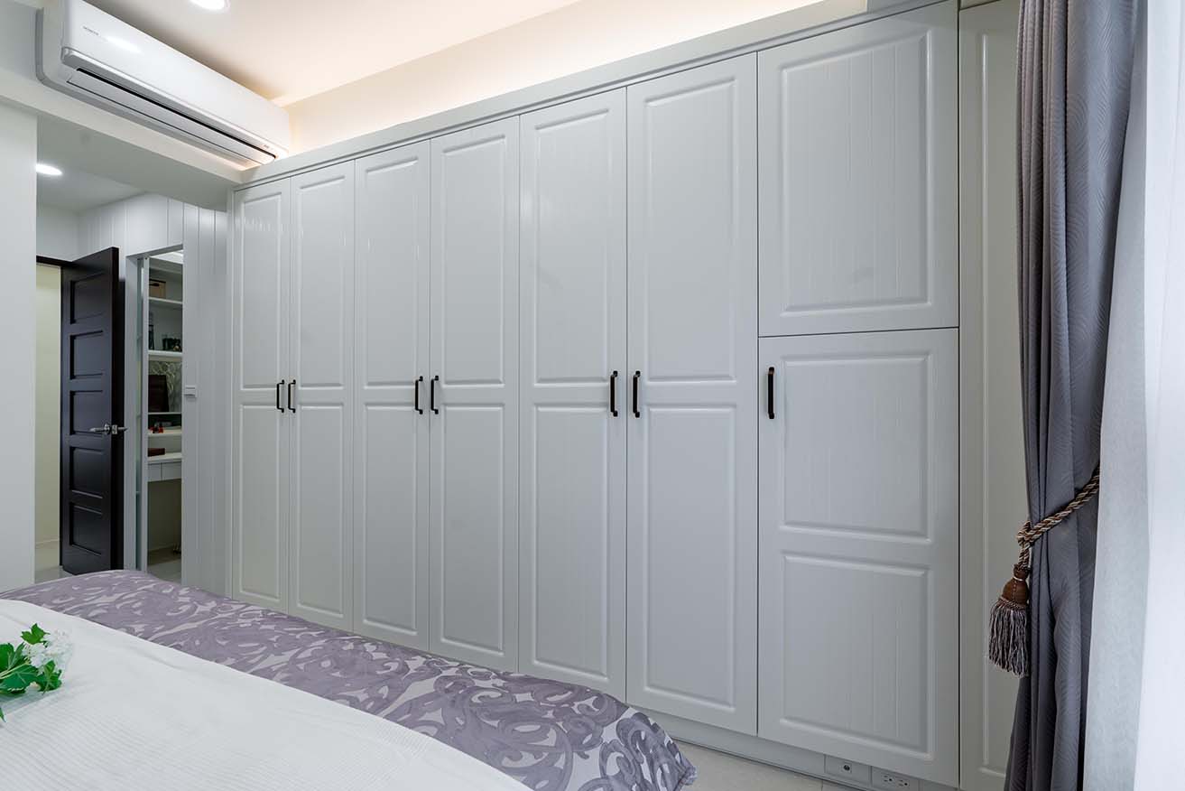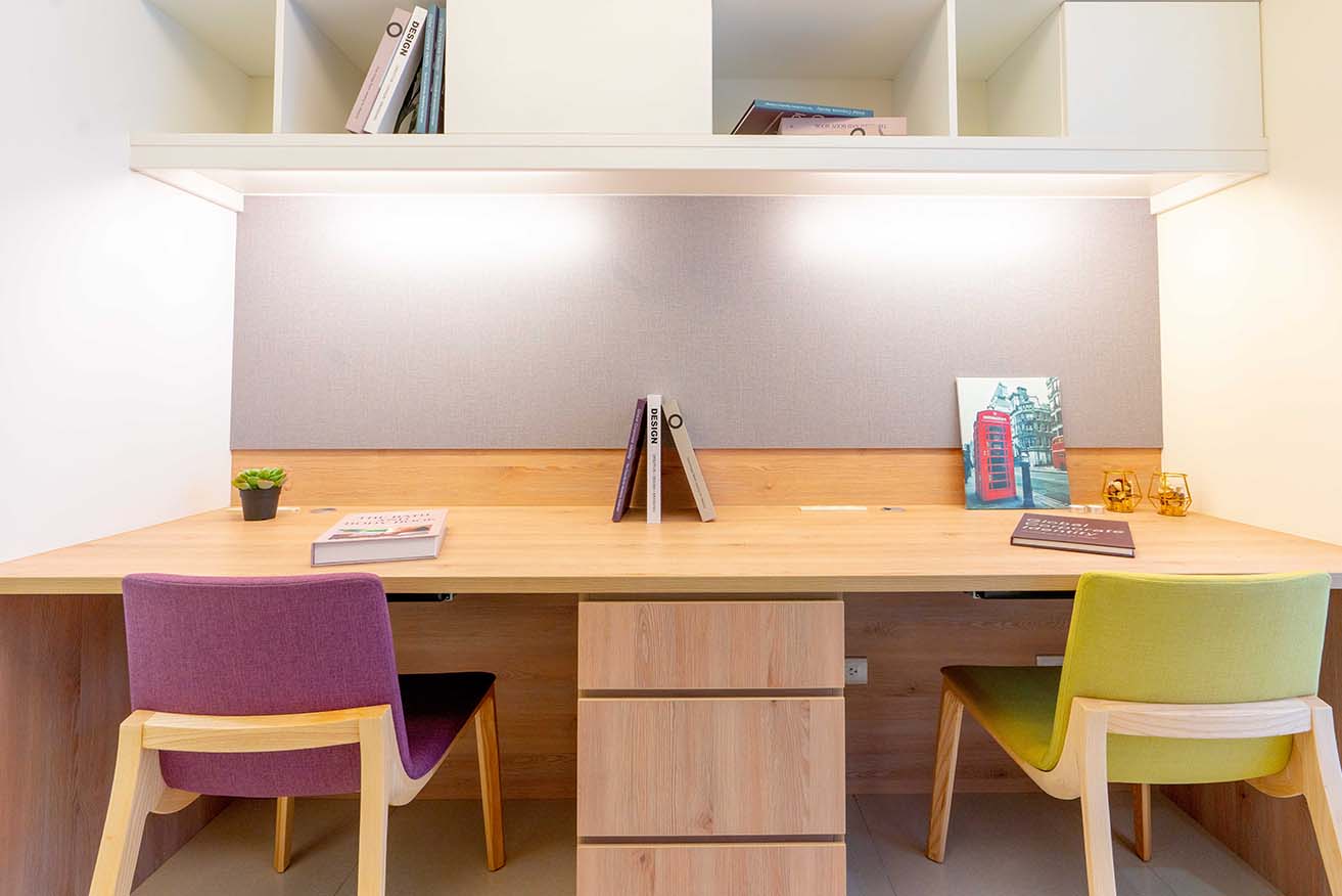 以「沉穩」為設計主軸,在公領域使用瑰麗大理石牆面及桌面,表現恢弘壯麗氣韻,並縮短牆面長度加強空間開闊性,讓景深無限放大。並在沙發背牆後的設置多功能室及書房,讓屋主得以在此閱讀休憩等。而扮演收納要角的系統櫃,則以黑色為主脈,仿皮質面板包裝,訴說卓越非凡的精緻語彙。