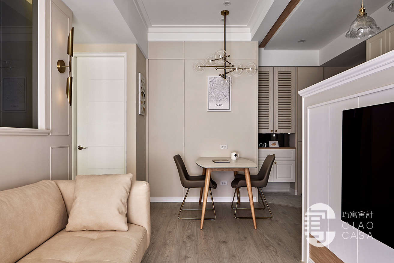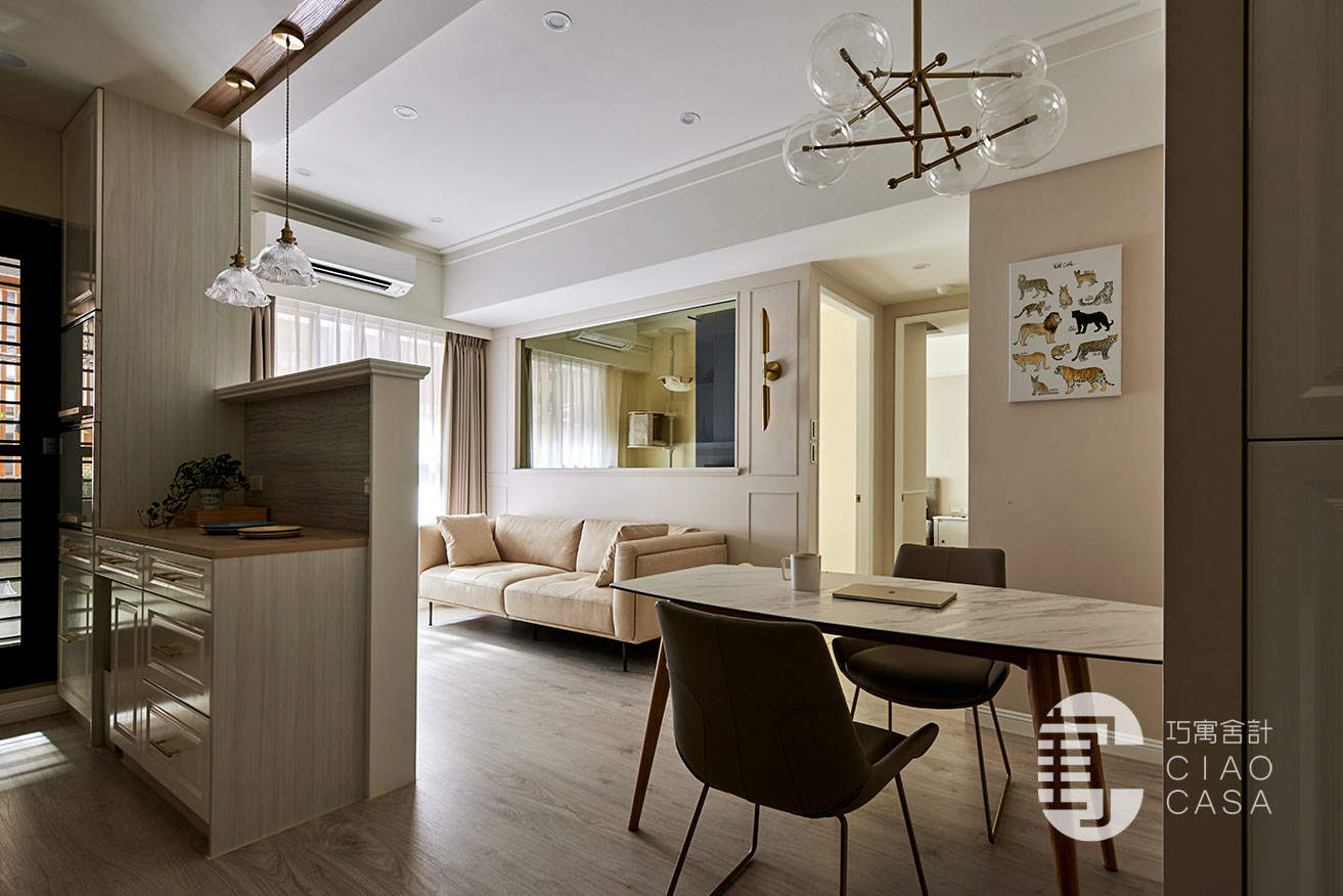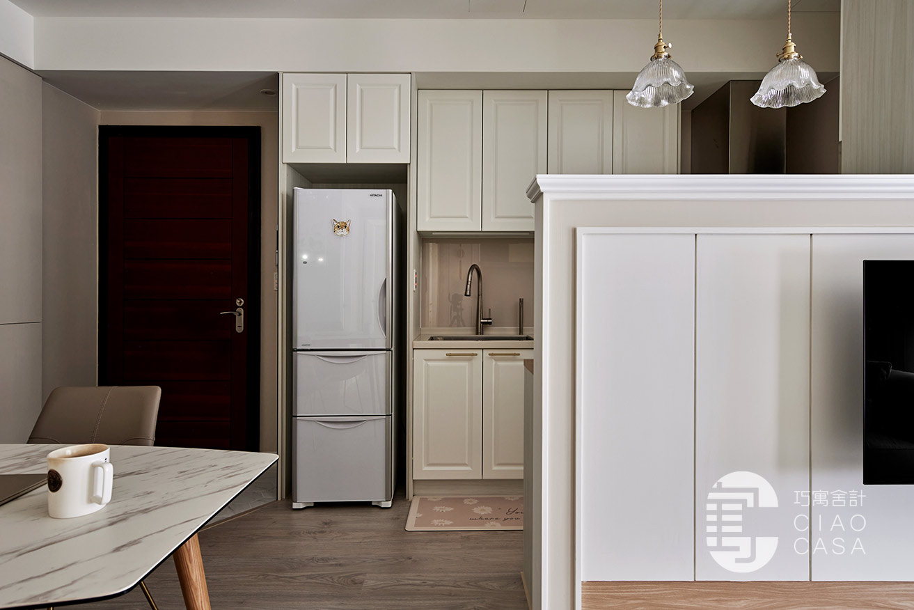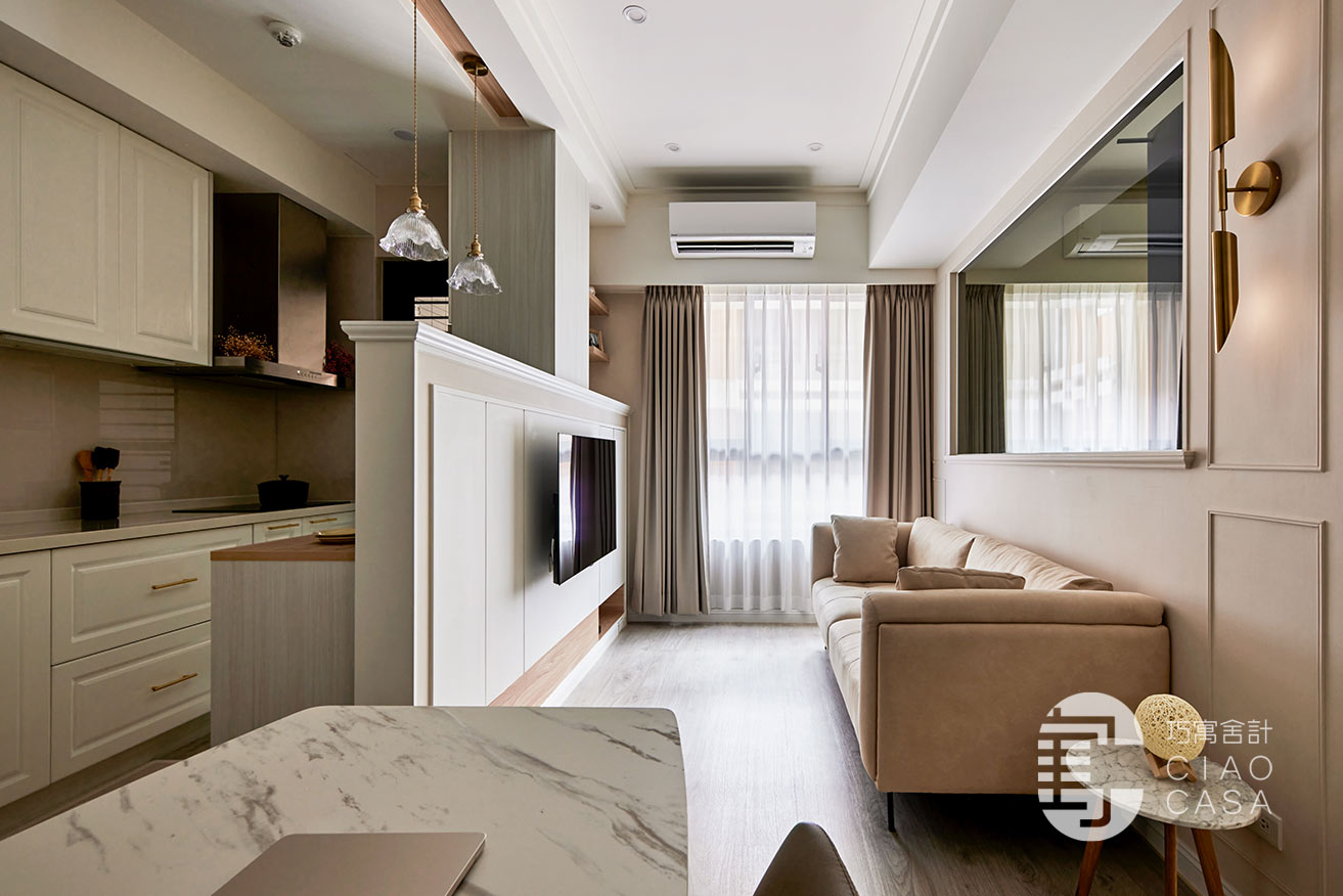 原有廚房是開放式廚房,但跟客廳仍有一道隔間牆,設計師建議拆除這道牆,藉以打開小宅的空間動線,利用天花板線性裝飾帶,劃分客廳跟廚房,輔以茶水櫃上的造型吊燈,為廚房的工作平台,創造隱約的隔屏。