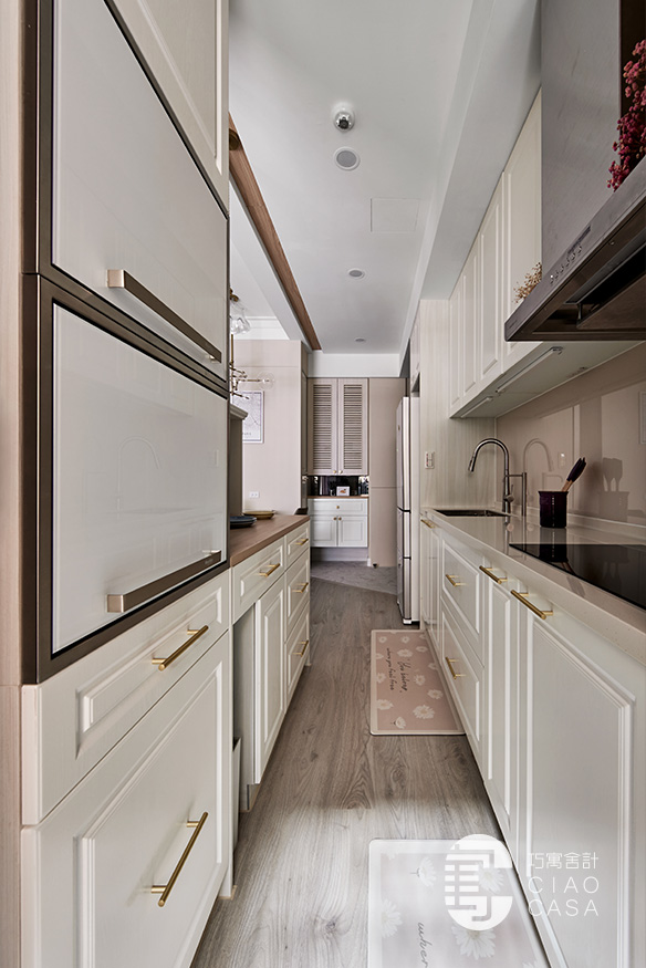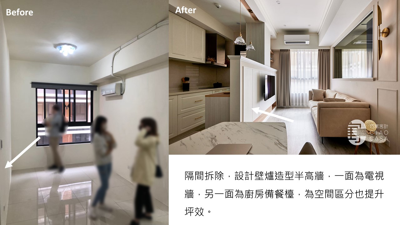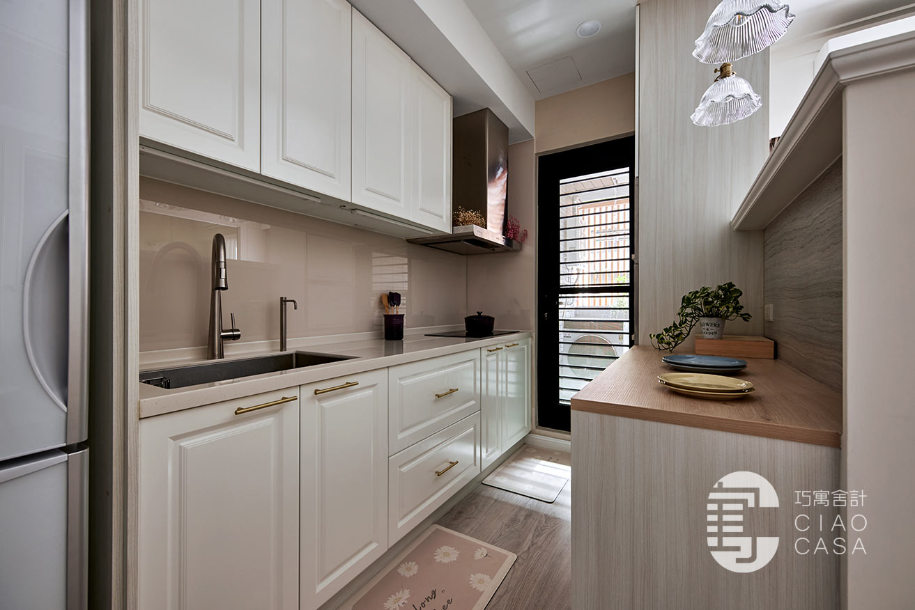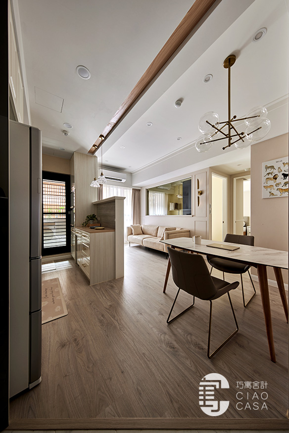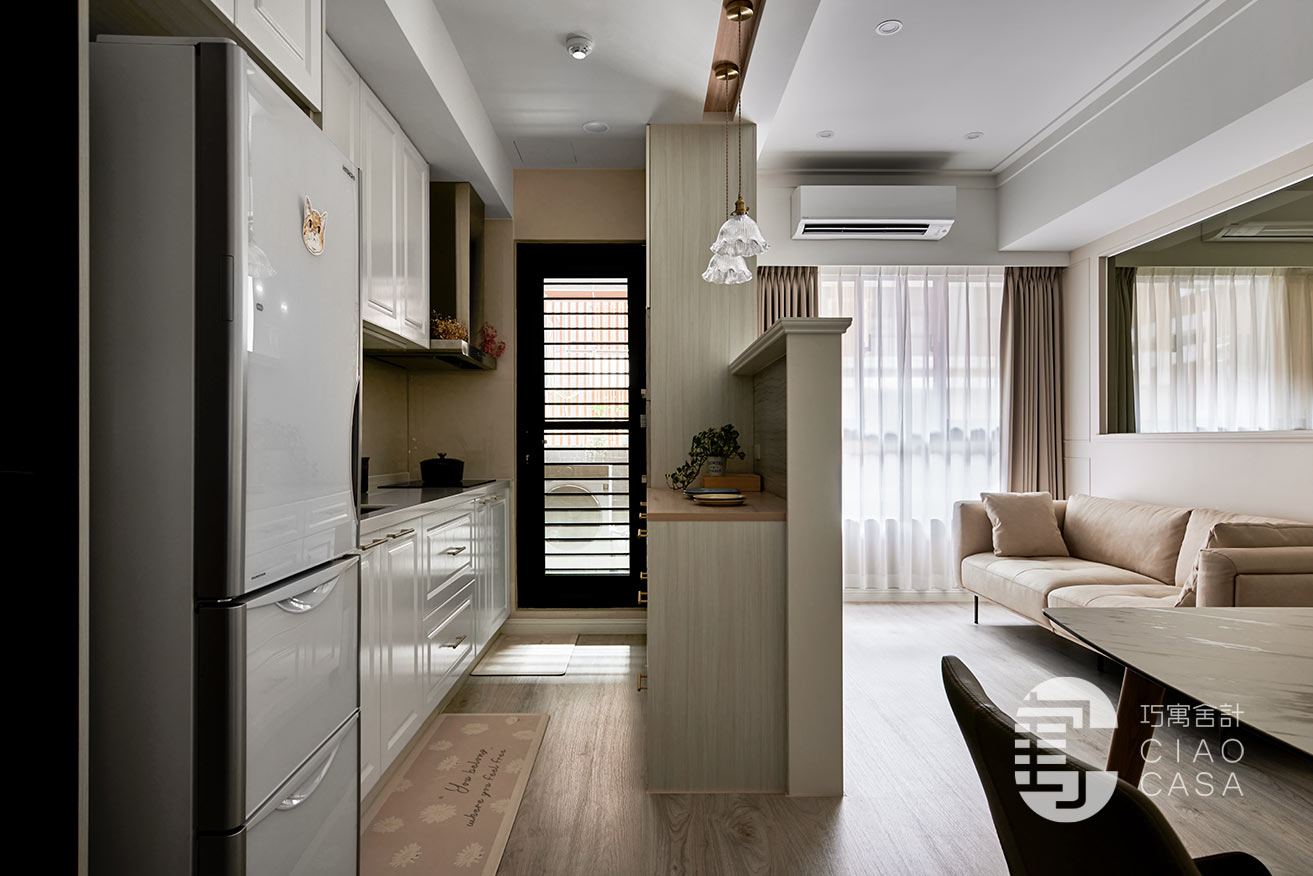 原有廚房是開放式廚房,但跟客廳仍有一道隔間牆,設計師建議拆除這道牆,藉以打開小宅的空間動線,利用天花板線性裝飾帶,劃分客廳跟廚房,輔以茶水櫃上的造型吊燈,為廚房的工作平台,創造隱約的隔屏。