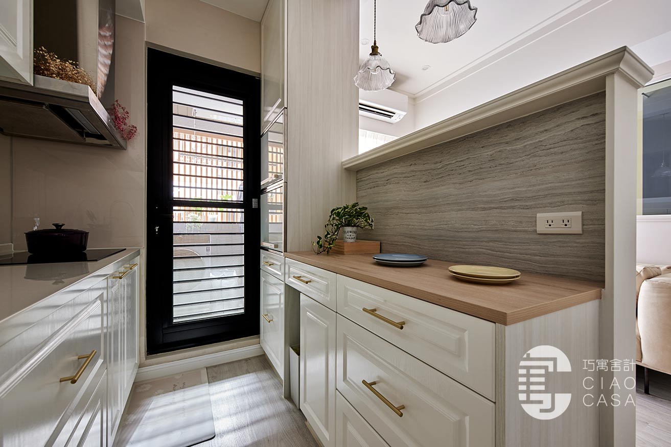 半高的茶水櫃,上方背牆以石材紋理的系統板材點綴,方便清潔與維護,下方預留垃圾桶空間,增加開放廚房的整潔性。設計抽屜時,設計師規劃了不同高度的抽屜,對於有小孩或是寵物的家庭,多了收納各式物品的彈性。在直立式電器櫃的巧思,設計師以上掀式玻璃門板收納櫃取代常見的抽盤式設計,讓廚房更加整潔,也增加系統櫃體的使用年限。