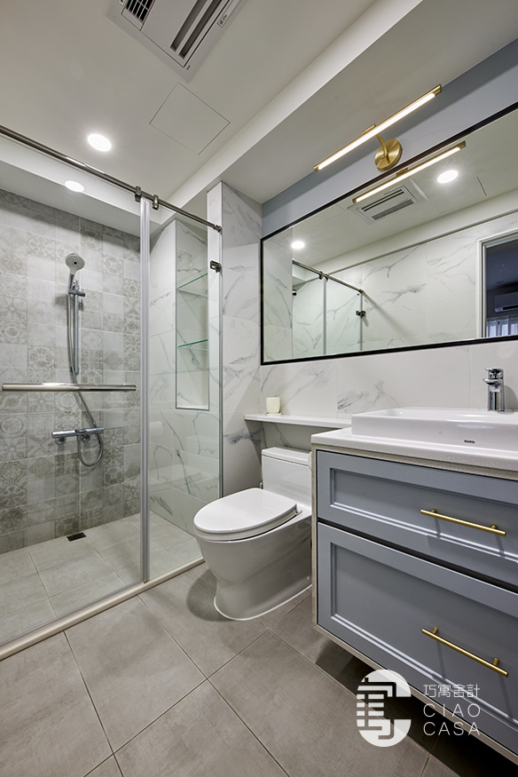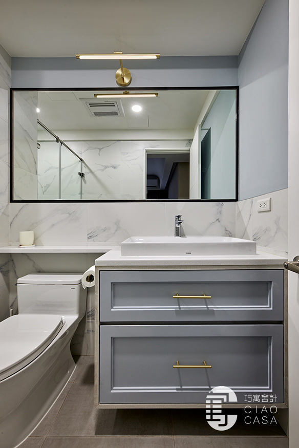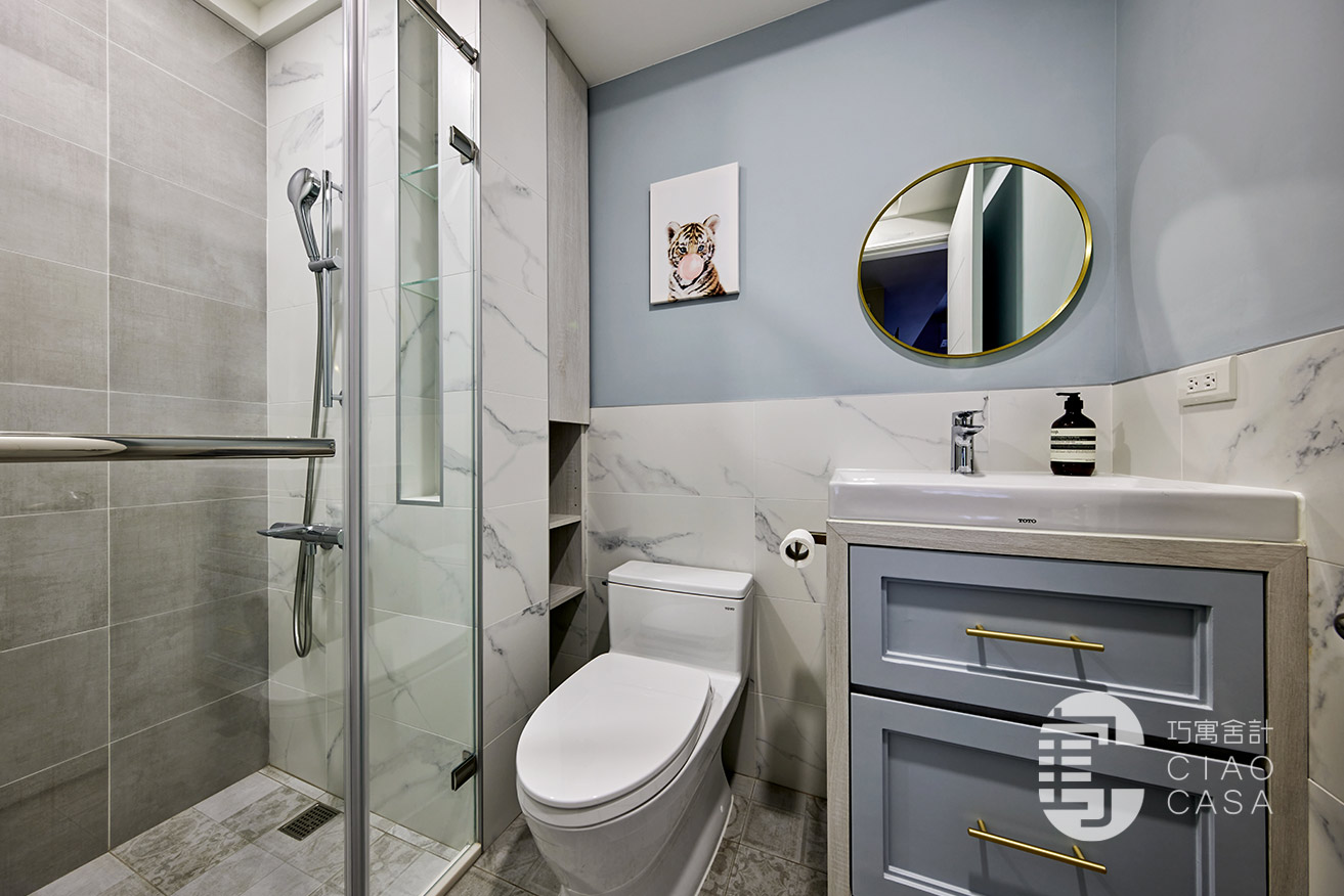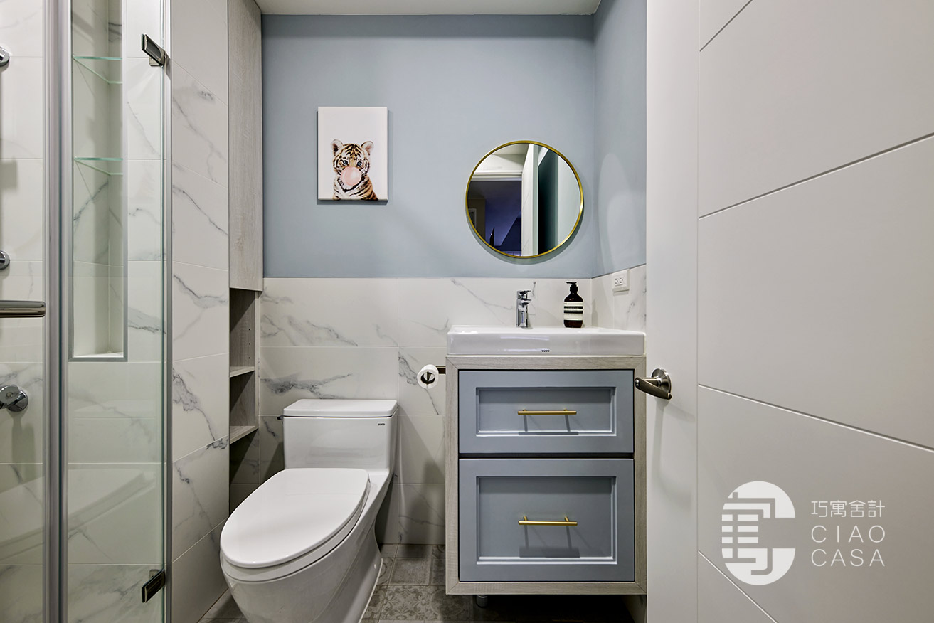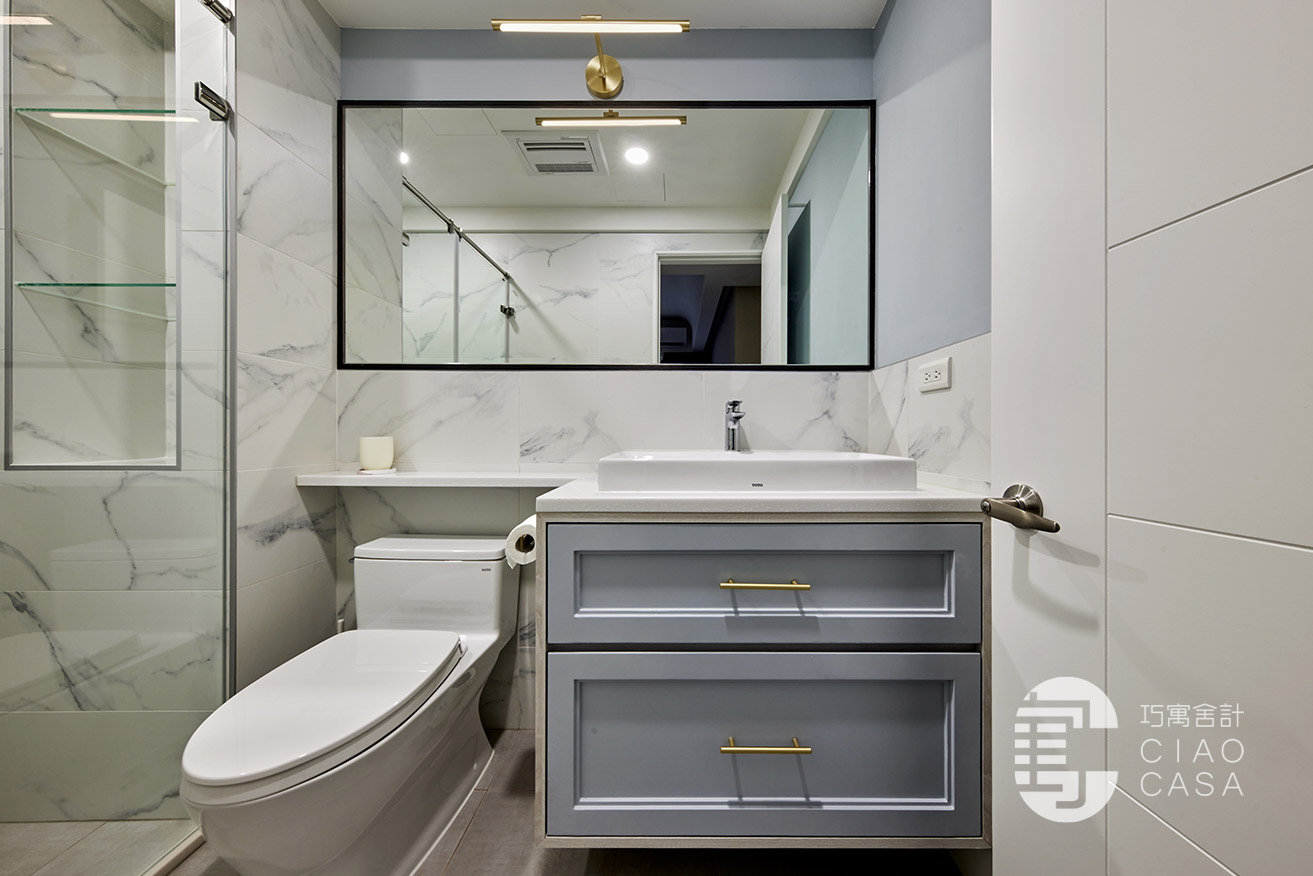浴室乾區,牆壁選用特殊耐候漆,淺藍的壁面,也是屋主最愛的色系,打破浴室牆面一定要貼磁磚的單調選擇,同時不忽視清潔、維護的務實考量。淋浴區的壁磚選擇跟玄關落塵區的大理石紋理相互呼應,貫徹全屋整體協調感。