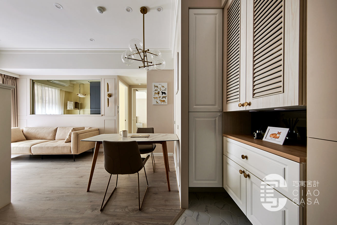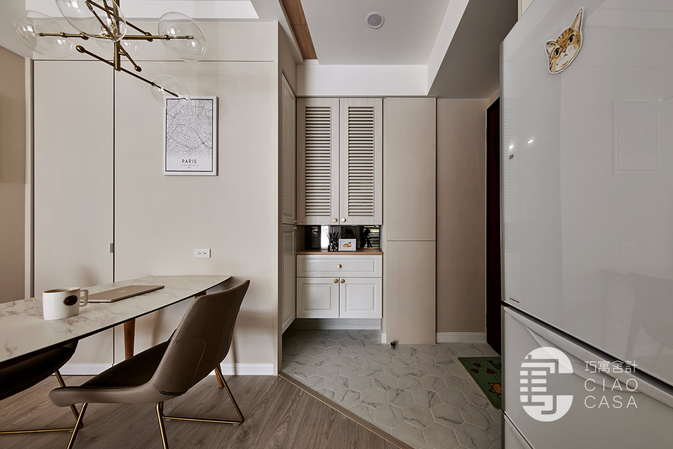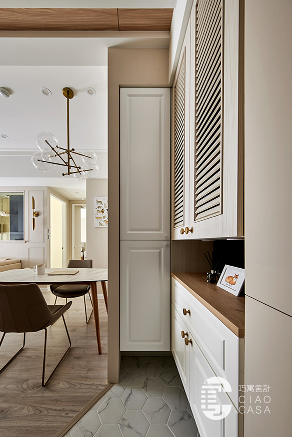 在不拆除原有地磚的情況下,增設落塵區,以大理石紋六角磚展現低調奢華。側面的鞋櫃門板為訂製的手工百葉門,兼具通風跟美觀。正面的衣帽櫃,背後藏著女主人夢寐以求的儲藏室空間,為滿足屋主收納聖誕樹、吸塵器等等需求,設計師將儲藏室規劃在家中的次要動線、採光最差之處,儲藏空間的大小,最好為一人可進去,但又不能讓量體龐大到對空間產生壓迫,原本男主人希望餐廳大一點,因此很反對增設儲藏室,最後設計師把實際大小在現場放樣、跟屋主多次討論後才決議儲藏室的大小,空間不只多了儲藏室,還能放一張比預計更大的餐桌。
