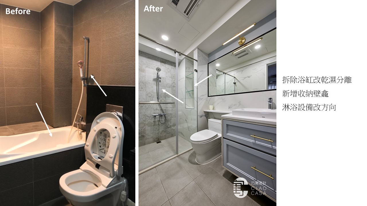 兩間浴室都全面翻新,主浴室將原有浴缸拆除,改為淋浴三件式,次浴室也在不影響原有管線的情況下,微調浴室格局,以滿足屋主崁入式收納的需求,隱藏入壁面的收納櫃、簡化的置物架,除了便於清潔,也讓標準的浴室空間更加寬敞,搭配金屬黃銅色壁燈,讓屋主每天都能有如在飯店浴室的享受。