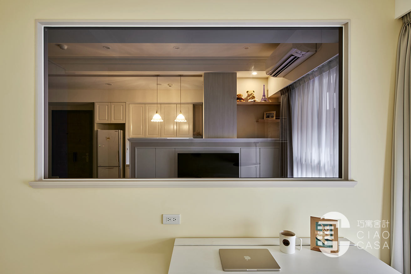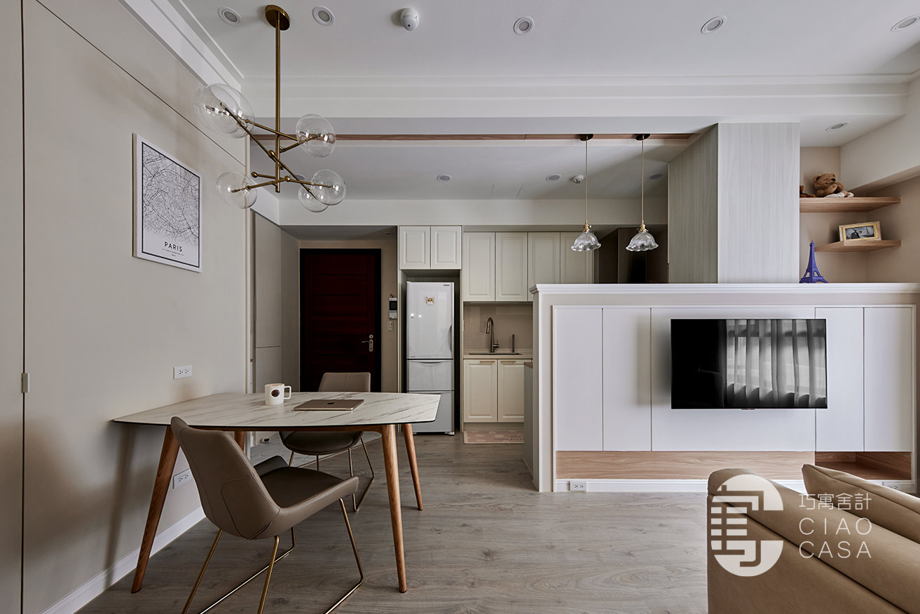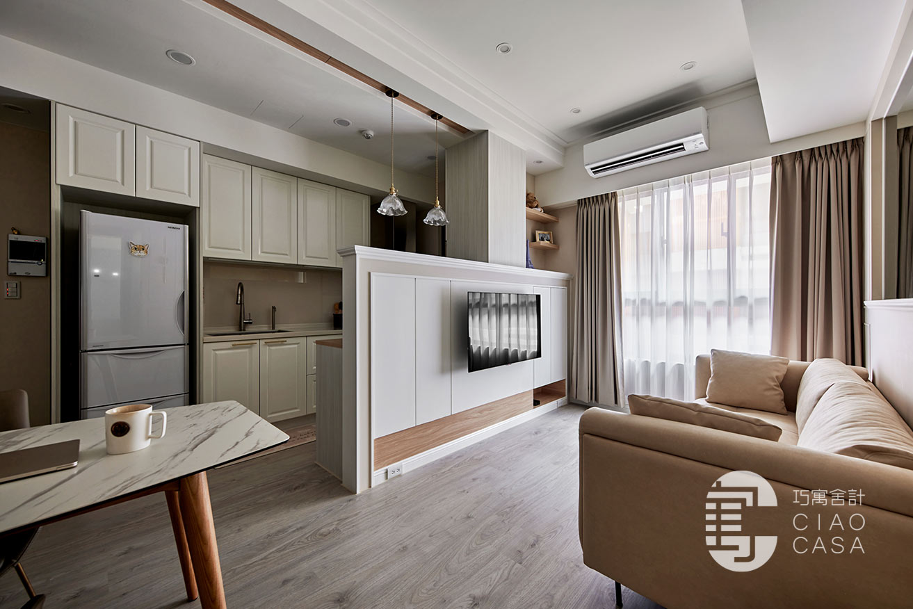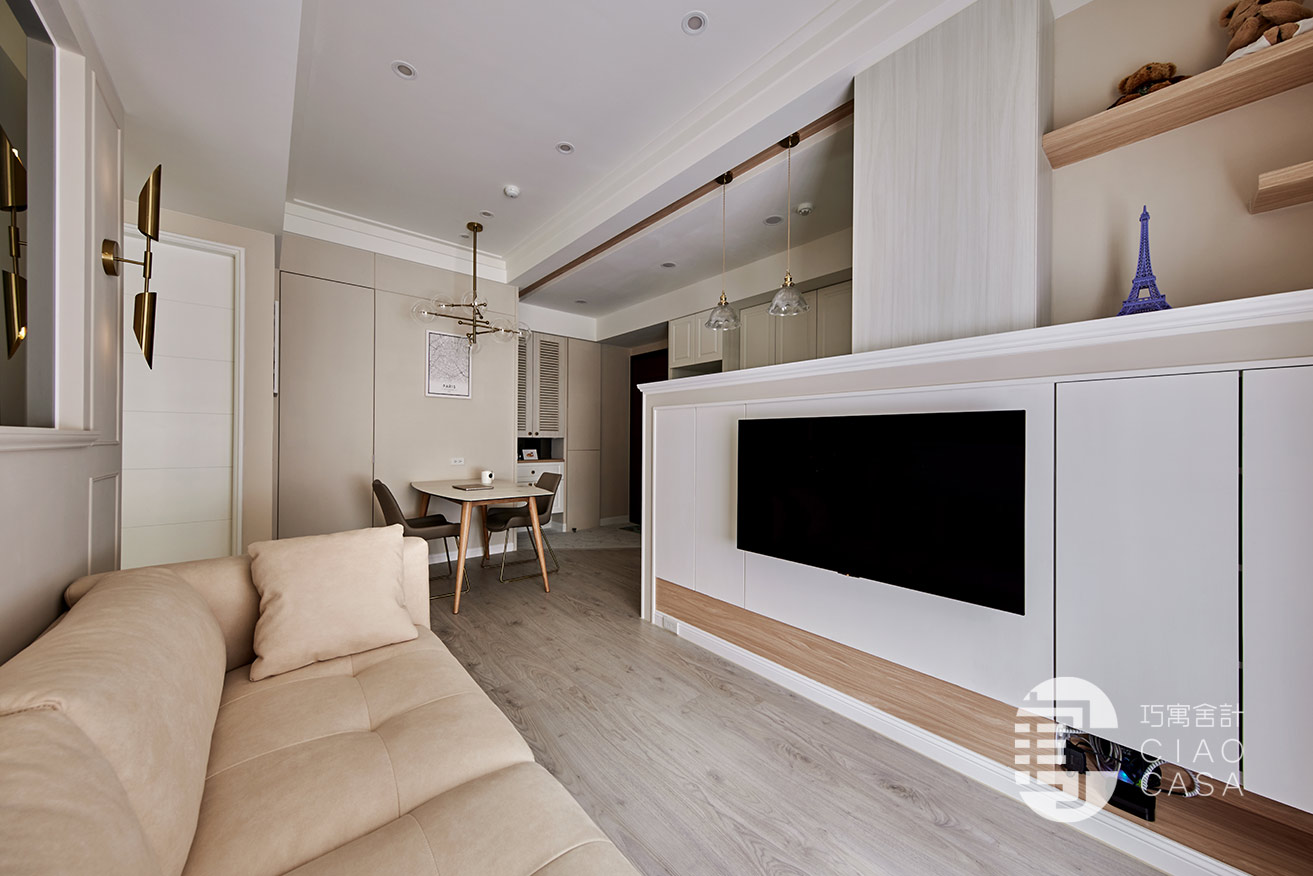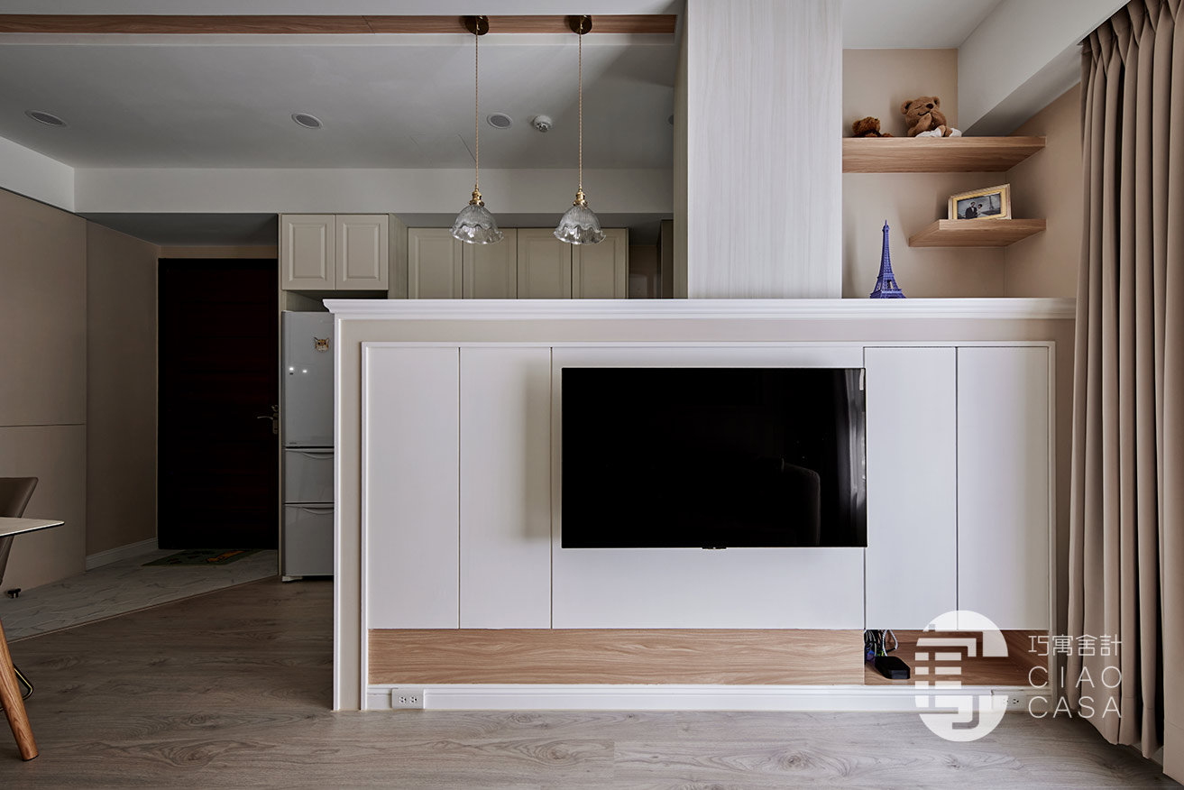 客廳設計電視牆造型靈感源自法國家中都會有的壁爐,中間直立式的煙囪,背面其實是廚房的電器櫃,利用雙面櫃體做為隔牆,讓空間最大化。簡潔的壁掛電視,搭配隱藏的收納線槽,讓設備隱身於下方,美觀又便於擴充設備。即使沒有真實的爐火,每天看到這面電視牆,也溫暖了屋主的心。全屋牆面以奶茶色為主要色調,襯托白色電視牆的優雅線條,並以暖橘色木皮板串連各空間,材質各異卻又不失和諧。