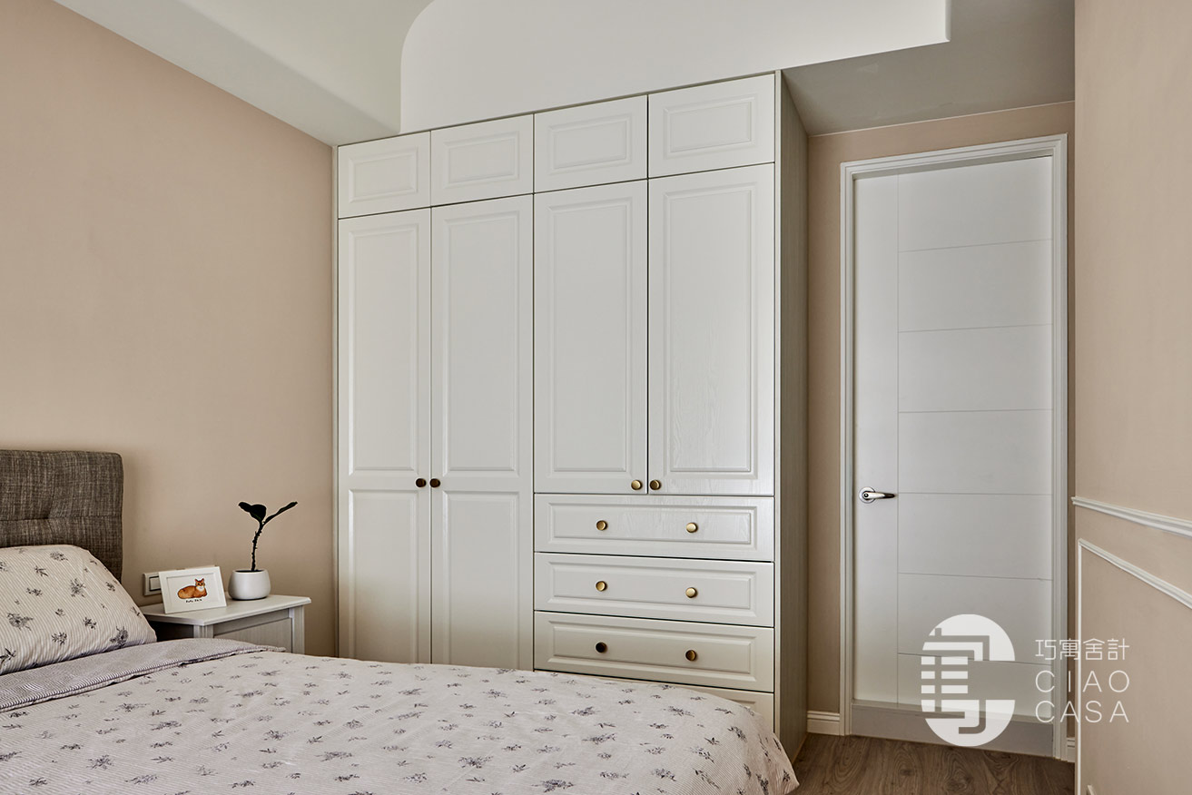 設計師以系統造型門板,規劃系統衣櫃,滿足屋主收納的需求,門板淺淺的木紋壓花,跟全屋低調極簡的風格相呼應。