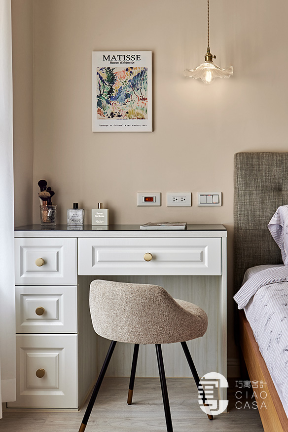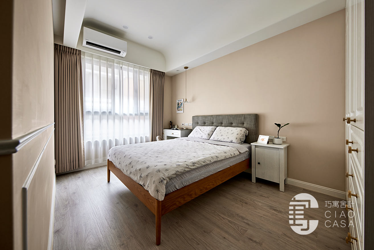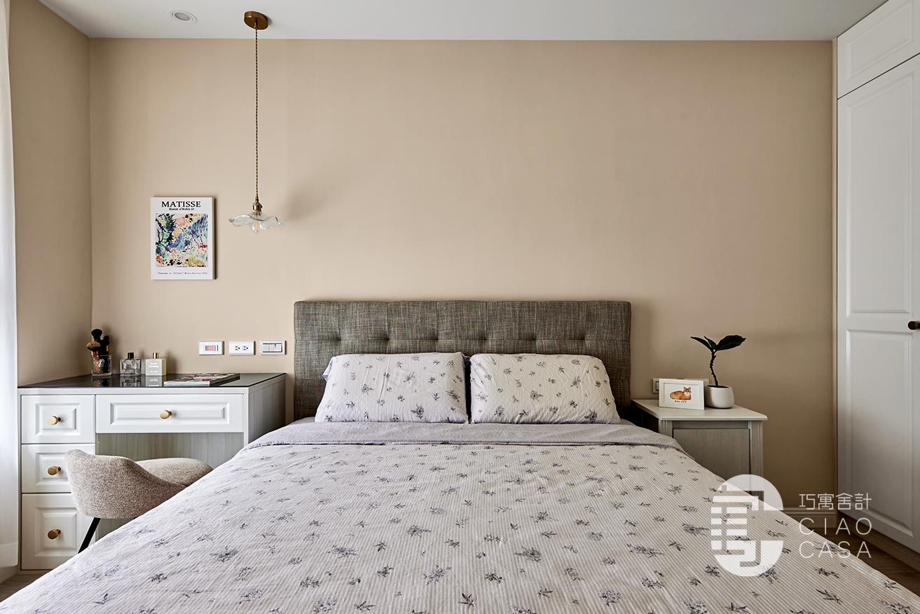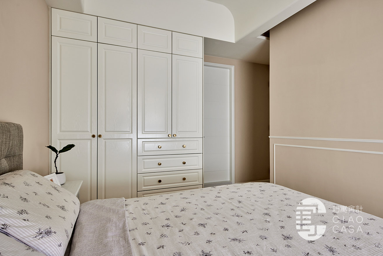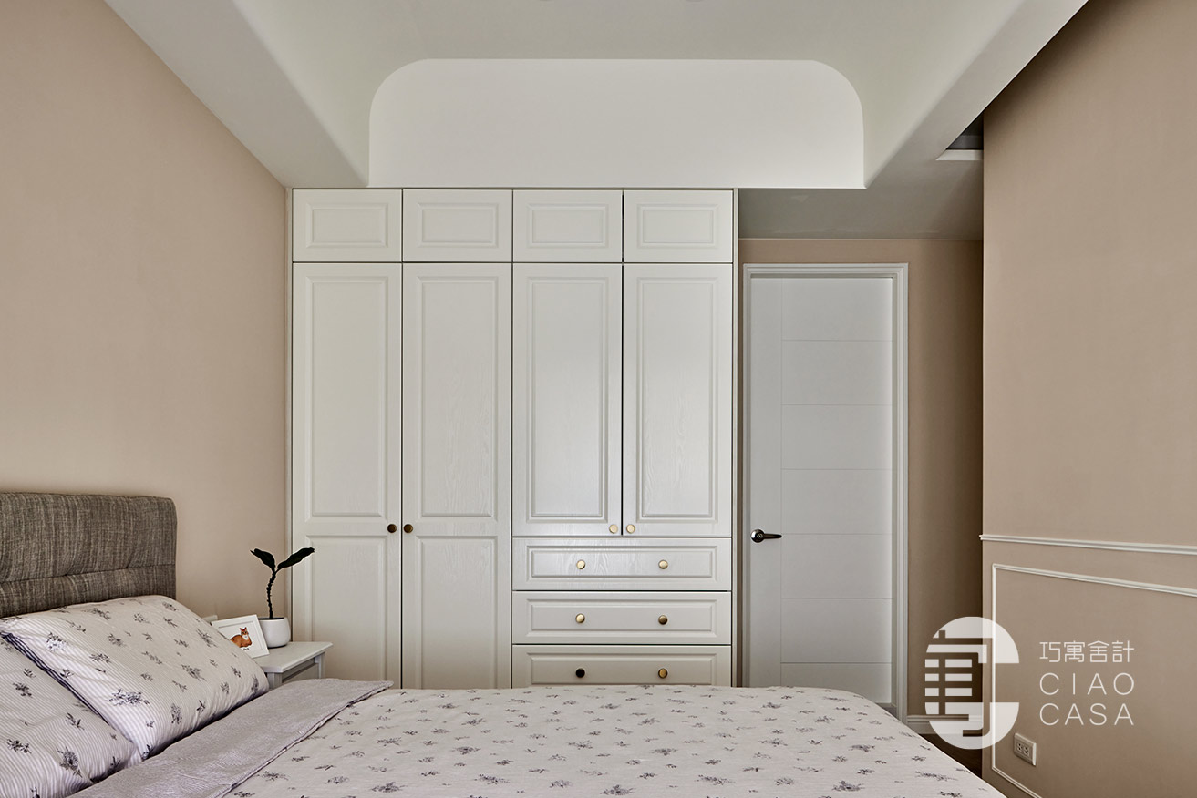 而床頭上方以弧形天花板修飾床頭大樑,在消弭風水顧慮,弱化巨大梁柱的視覺與壓迫感,牆壁延續淺奶茶色調,延伸呼應客廳壁面造型,而床尾牆面的造型設計,有別於沙發背牆設計,改以潔白優雅線條,在主臥室中延續營造法式浪漫。
