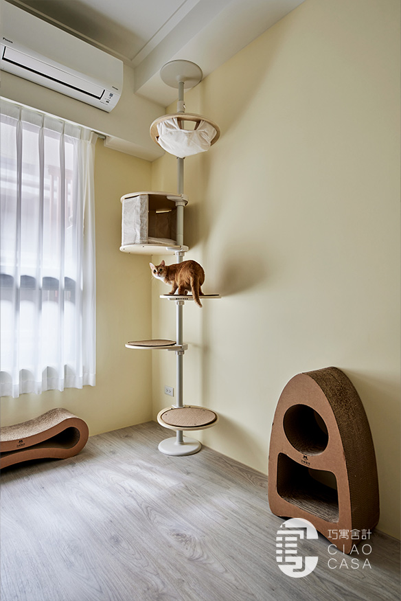 日曬充足的次臥室,設計師將其規劃成男主人的工作室兼貓房,在靠窗處規劃了可移動、方便調整的貓樹,滿足貓咪直立活動、探索的好奇心,同時也多了未來改造成小孩房的擴充需求,不至於被固定式的傢俱限制。牆面為法國小鎮家中常見的鵝黃色,活潑卻不輕浮,耐看又不失法式風情,最幸福的週末午後,不就是看著貓在窗邊懶洋洋地曬太陽,配一杯咖啡,靜靜享受與毛小孩的「親子時光」。