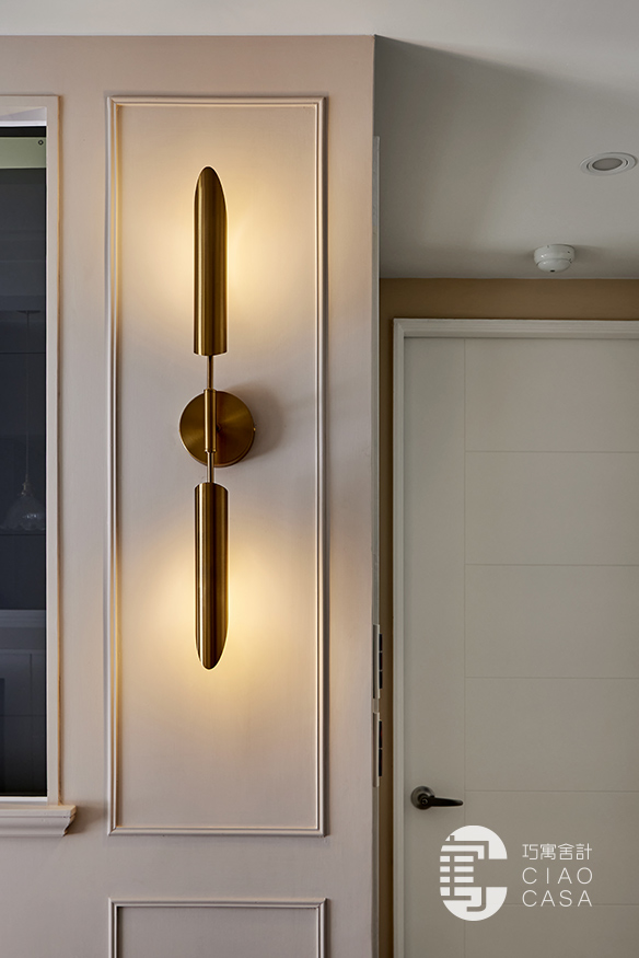 沙發壁面以較細的、造型簡約的線板營造法式浪漫,在金屬黃銅色壁燈的光暈渲染下,讓家裡多了一絲靜謐與溫暖。