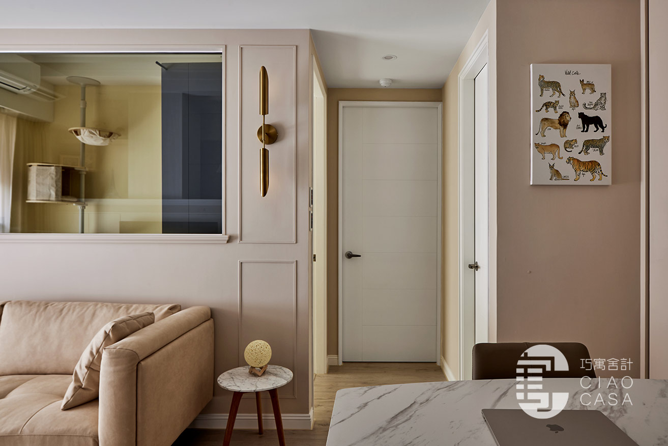 沙發背牆設計:設計師將原有輕隔間中段拆除,讓沙發背牆後的工作室兼貓房,以玻璃隔間牆區隔,兼具隱私性跟穿透性,在視覺的引導下,放大了客廳空間,在餐廳用餐時,也能看著家中貓咪在貓房活動的情形。