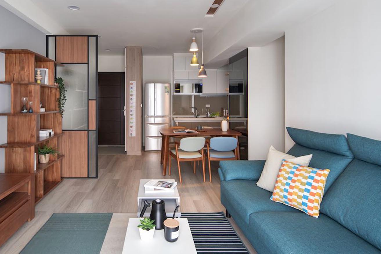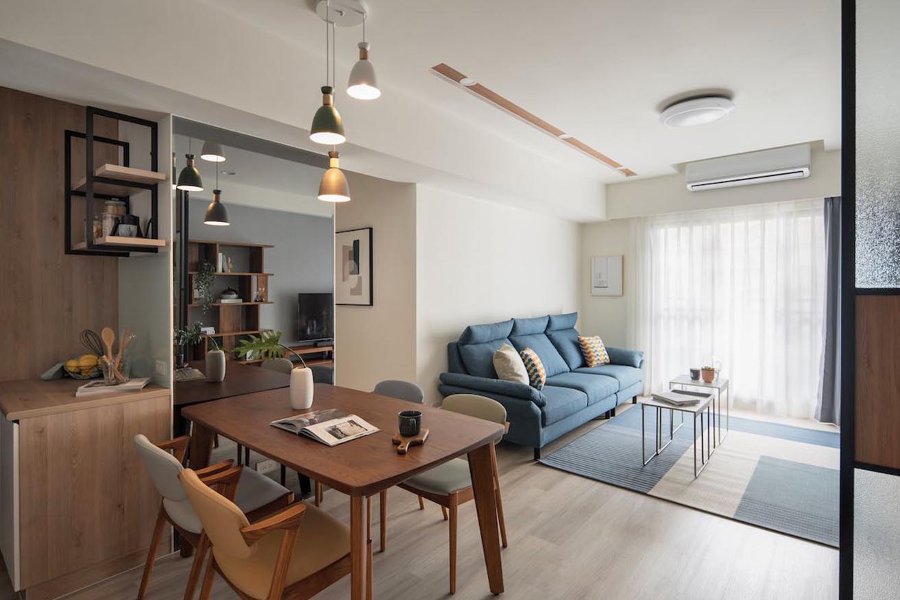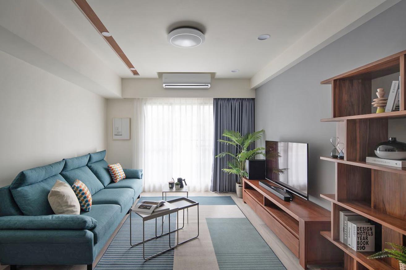 從北歐自然悠閒情景擷取色彩搭配,淨白無暇的基底,挑選低彩度灰藍做為主牆與軟件色彩,摻揉沈穩簡樸的柚木色澤加以調和,奠定自然純淨的舒心氛圍,進而局部點襯霧灰綠、淡粉橘軟墊單椅與黑鐵元素,帶動層次感。