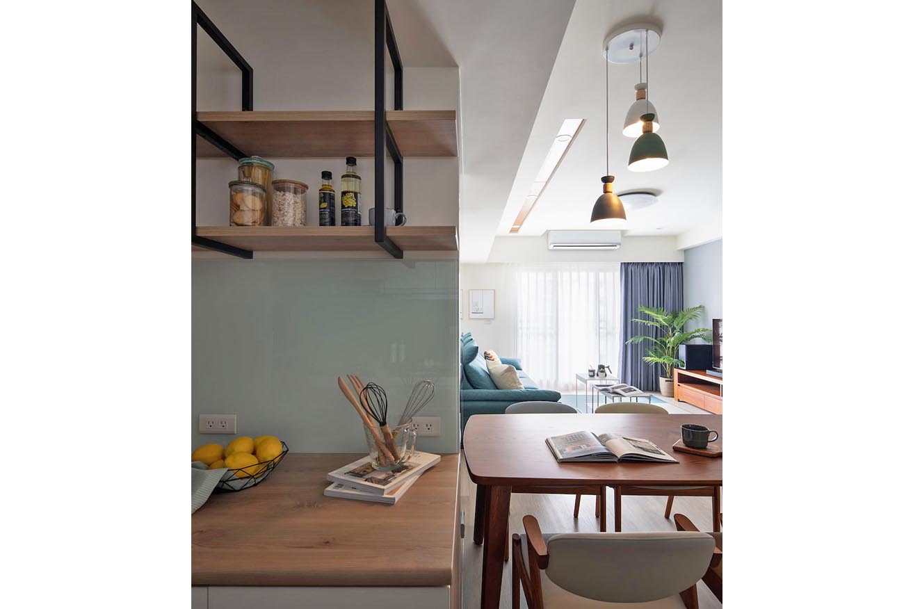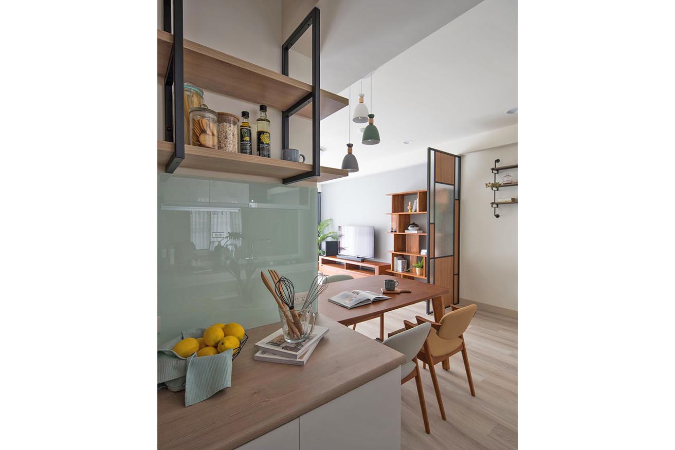 女主人對電器陳列擺放相當講究,為貼合烹調需求,廚房備餐檯揮別封閉層櫃呈現手法,上層以鐵件懸吊層架拓展收納空間,消弭負擔感之餘,完善歸納調味瓶罐等料理備品,腰牆則悉心貼覆好清潔的烤漆玻璃,以防電器的水蒸氣沾黏殘留壁面。