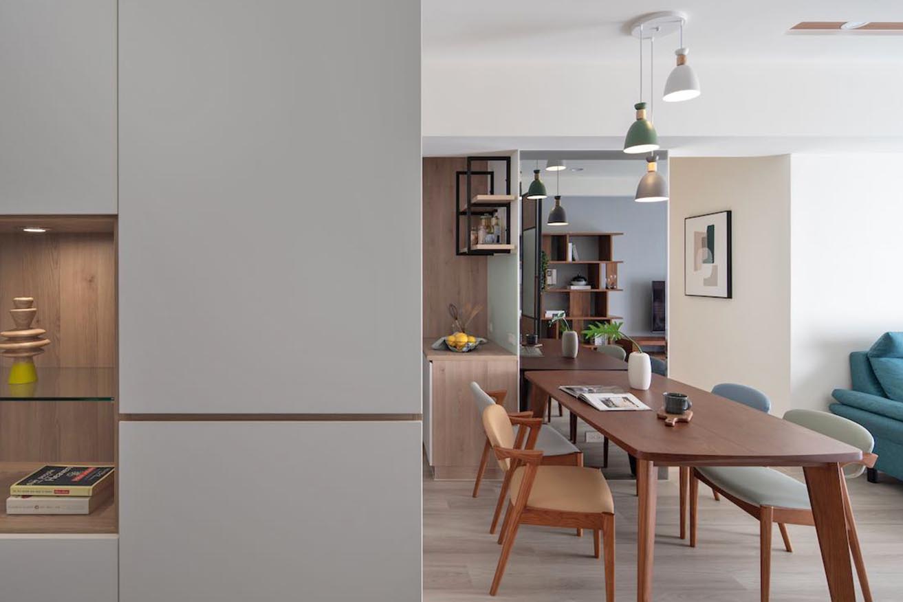 依循廊道軸線拉出隱形空間分野,餐廚過渡牆面採用灰鏡象徵空間遞移,同時憑藉鏡面放大空間特性,塑造多層次簡淨景深。同步衡量餐桌置放一隅,主要為公私領域行走動線疊合處,貼心顧及幼童安全性,因而精選弧面四邊斜角造型實木餐桌,以圓潤平順桌緣消解孩童走動、玩耍碰撞嗑傷疑慮,並交予天然生成的木質肌理柔化灰鏡冷冽感,獨特的斜角桌腳設計也大幅提升餐椅置放、挪移便利性。