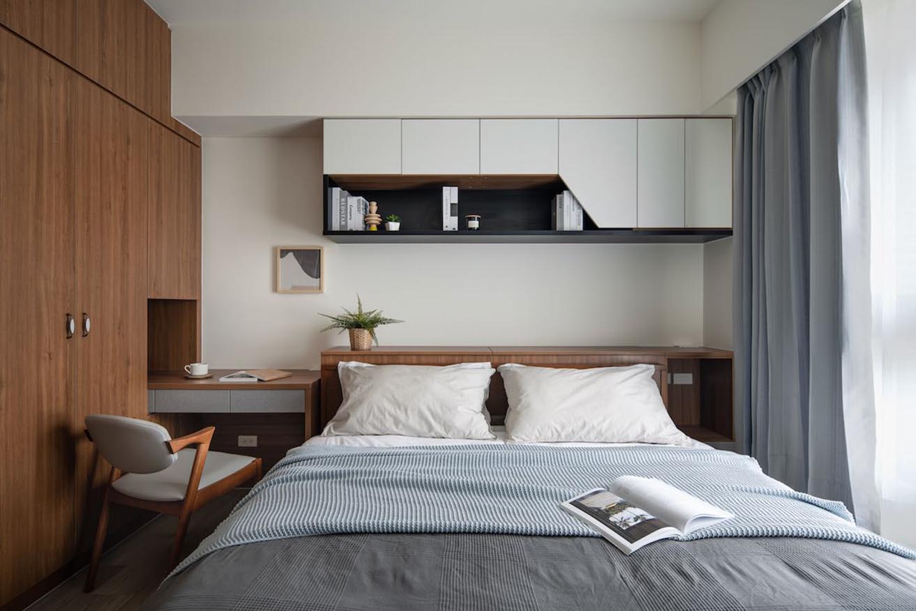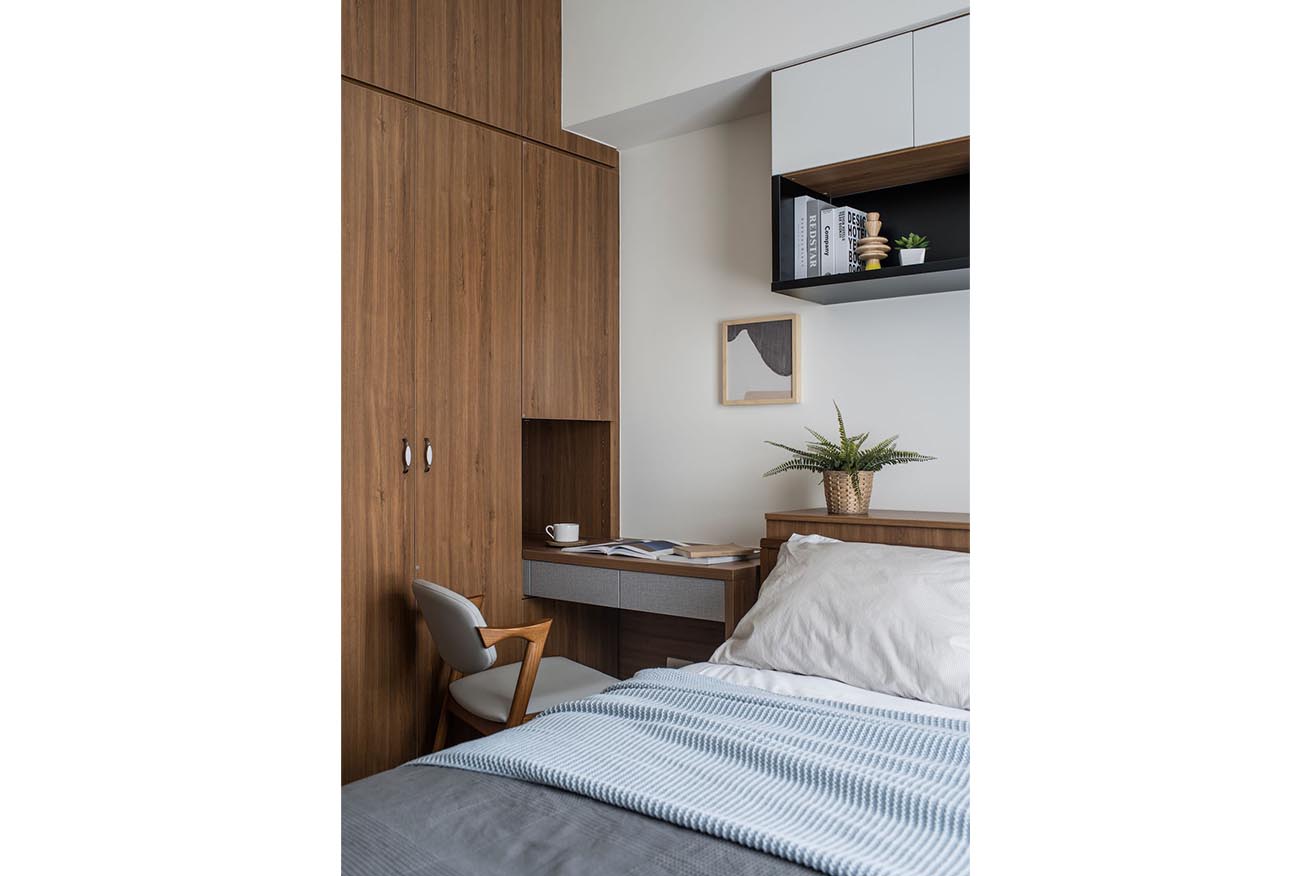 自然純淨氛圍一路蔓延至主臥室,揀選溫厚沈穩木質達到內外ㄧ致呼應,並齊平上樑結構拓展為床頭腰櫃,巧妙迴避壓樑困擾。