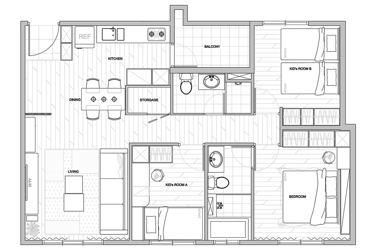 本案新屋裝修揮別填滿硬體的制式框架,使豐沛日光無礙映照自然簡樸的家具軟件,形塑溫暖明朗的視野打造親子北歐風格,並發揮系統板材量身訂製的完美特點,拿捏恰如其分的層櫃機能,為未來預留挪移、擴增的餘裕,藉由實木家具的高度彈性,勾繪每段成長歷程皆適用的美好場景。