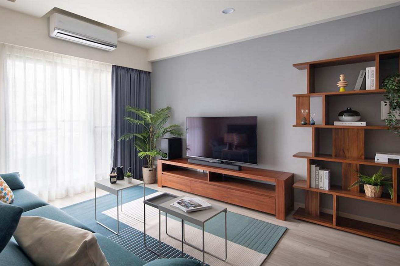 接續串連也是用溫潤實木打造,市售唯一一款210公分加長型的多功能收納電視櫃,抽屜與開放層架妥善收整大型影廳設備,維持簡淨視感,透過方正平順線條、溫醇沈穩色澤,延展不受阻斷的自然平實畫面,相映一側湖水藍織面沙發與簡約幾何色塊地毯,伴隨浸潤滿室的透亮日光,展露北歐悠然寫意的樂活風情。