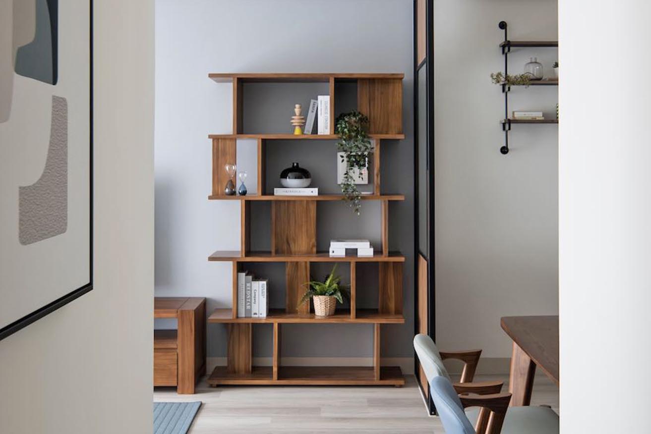 為遮飾突兀對講機,設計師審慎精算尺寸,嚴選 120cm 寬的全實木開放式柚木層架做為銜接,五層錯落有序的鏤空背板與檯面配置,不僅與鄰側洗鍊線框屏牆和諧呼應,同時兼備收納、展示多面用途,讓女主人鍾愛的原木氣息無礙漫入生活場景。