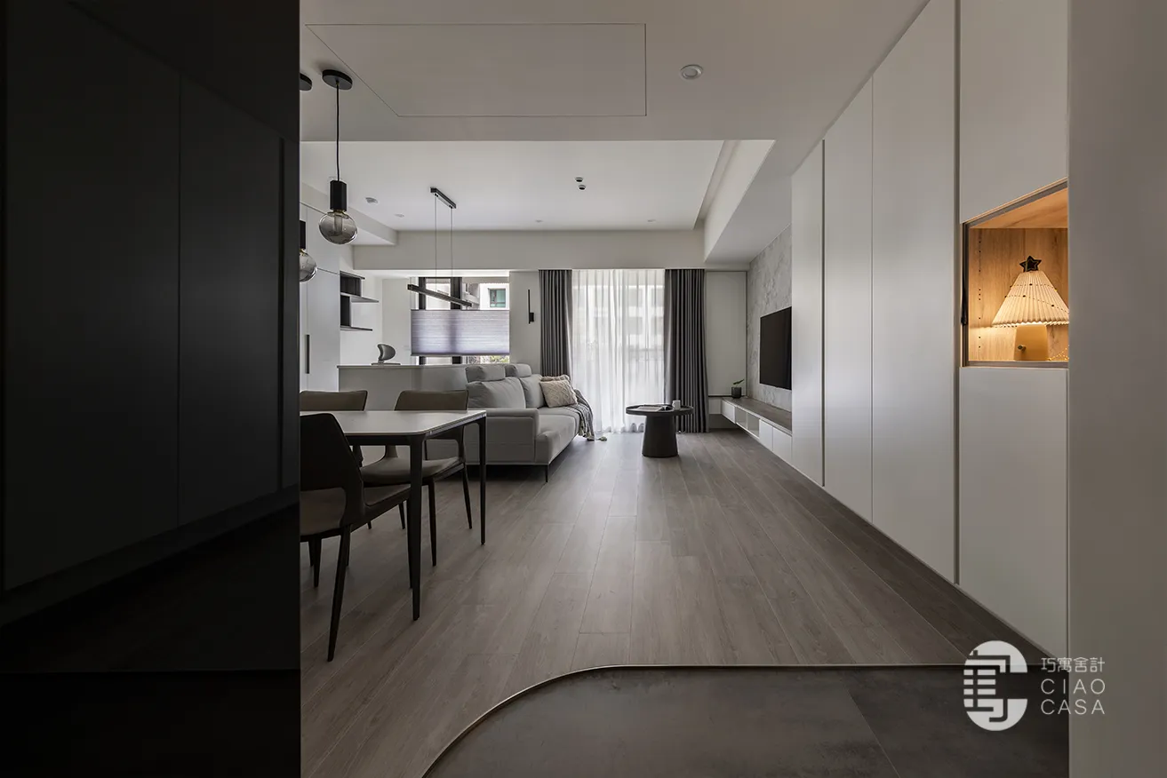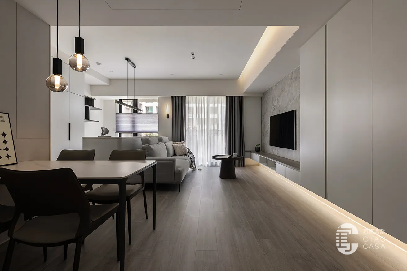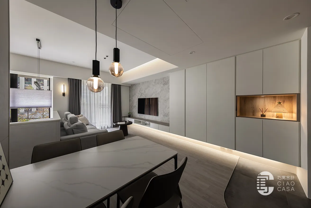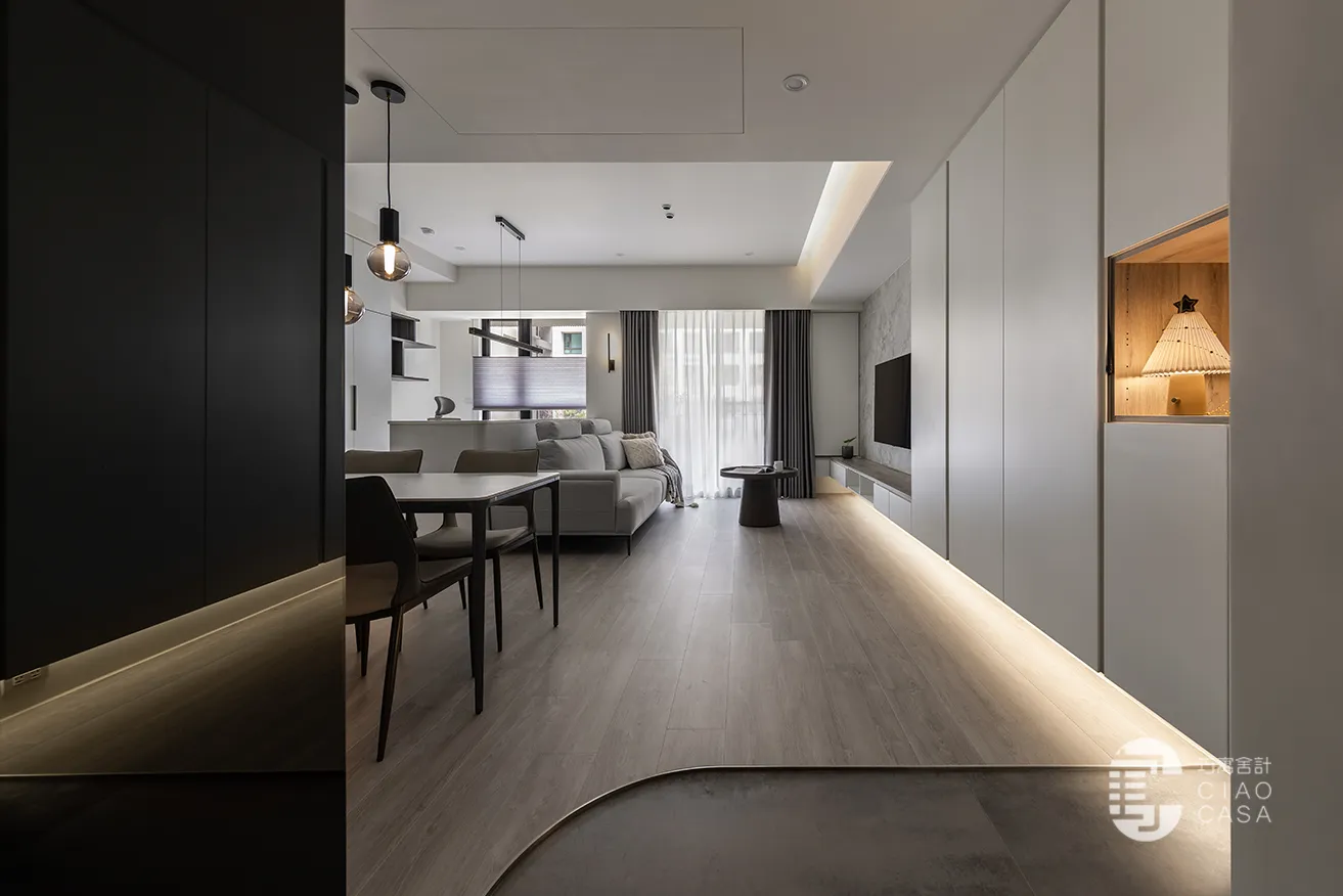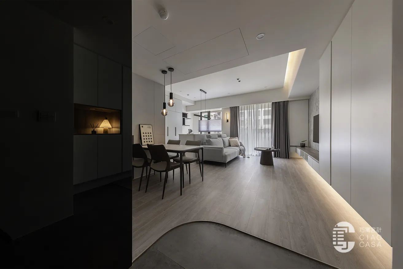 為回應屋主對沉穩現代風的喜好,空間原先規劃以大面黑色調貫穿,但考量坪數與光線條件,設計團隊精細調整色彩比例,改以白色為基底,並運用霧面灰、金屬元素與木質調,形塑細膩的視覺層次。燈光配置則經過多次測試,最終選擇可調式光源,讓空間能隨不同時段與情境靈活轉換,兼顧實用與氛圍營造。