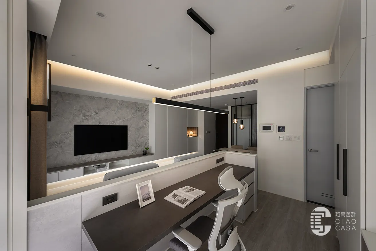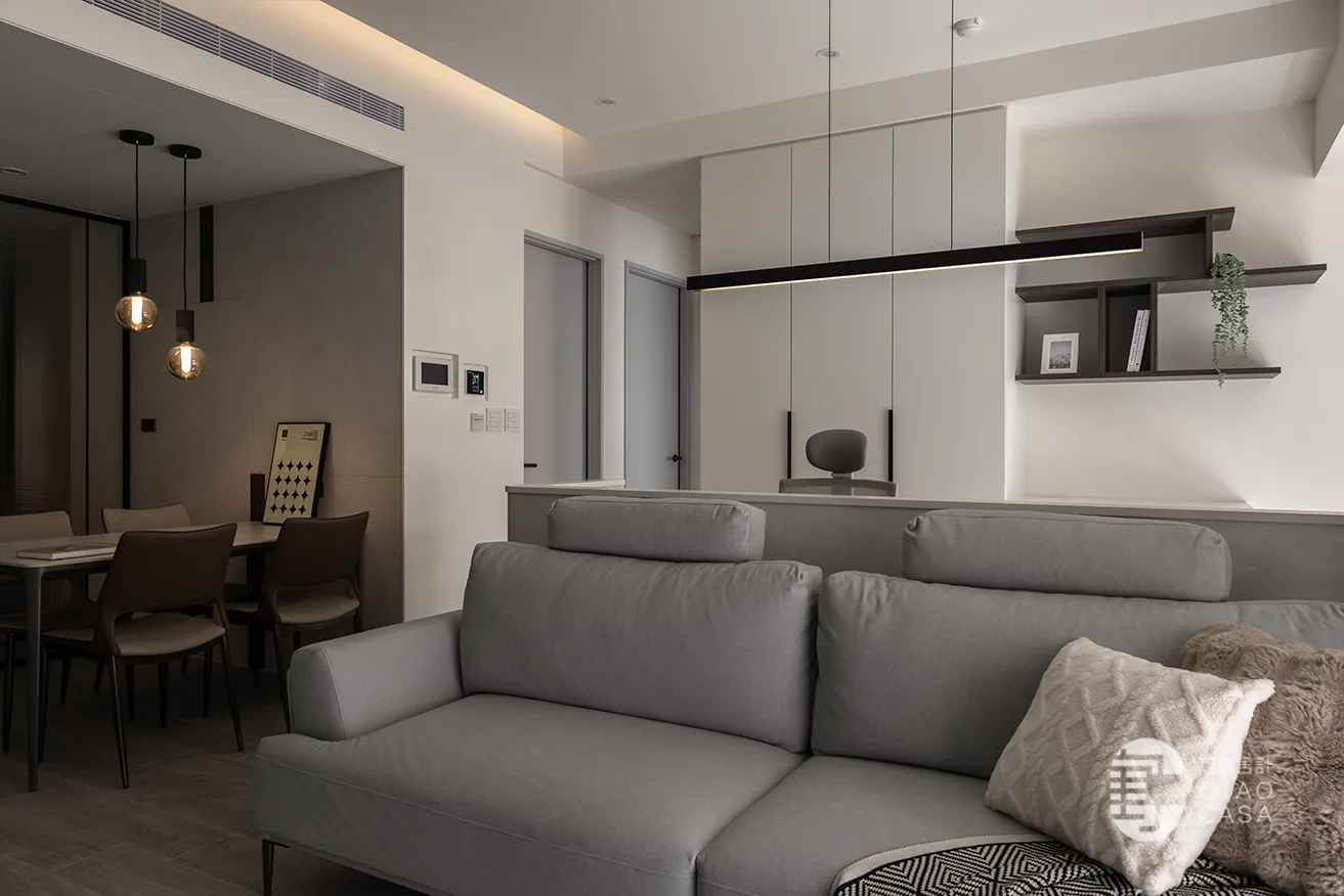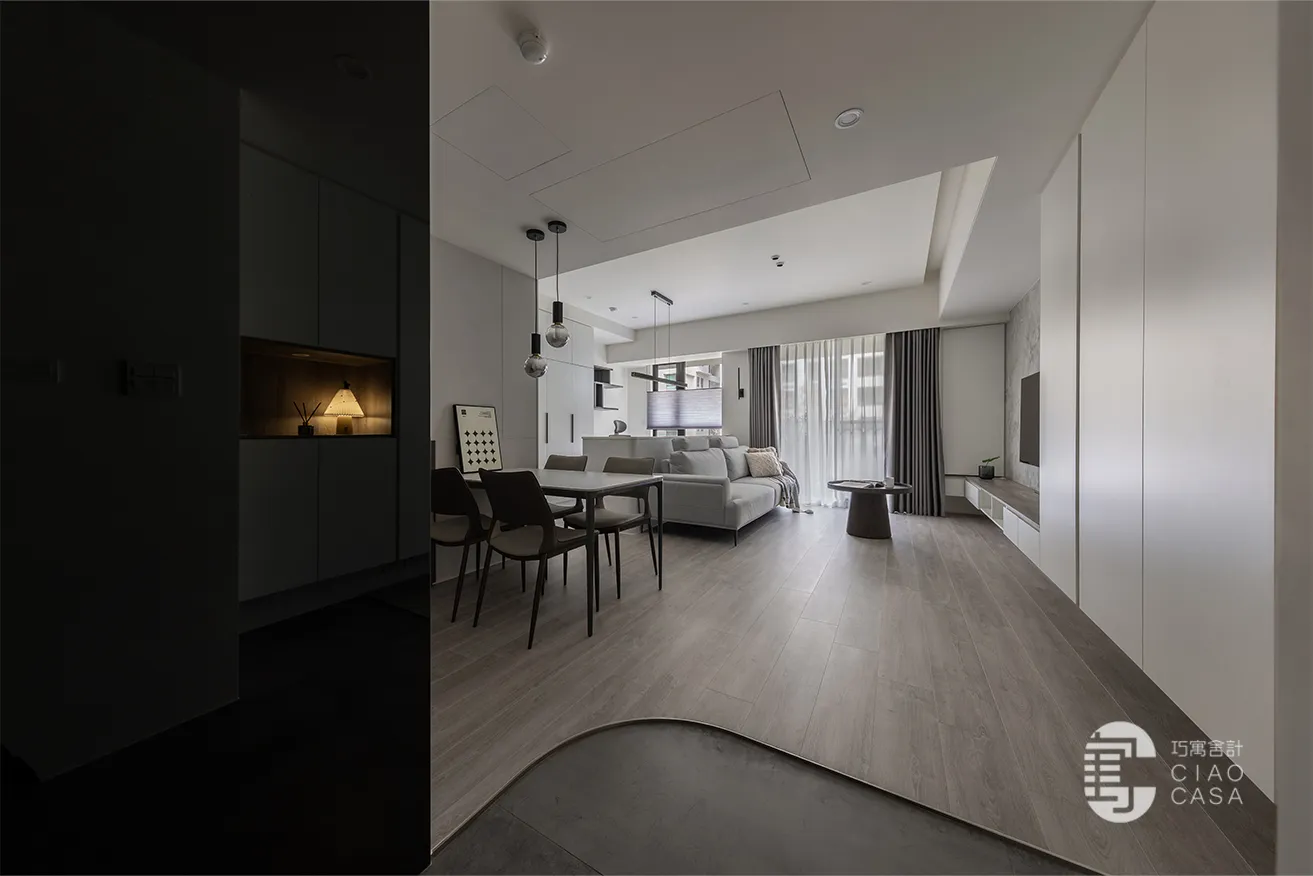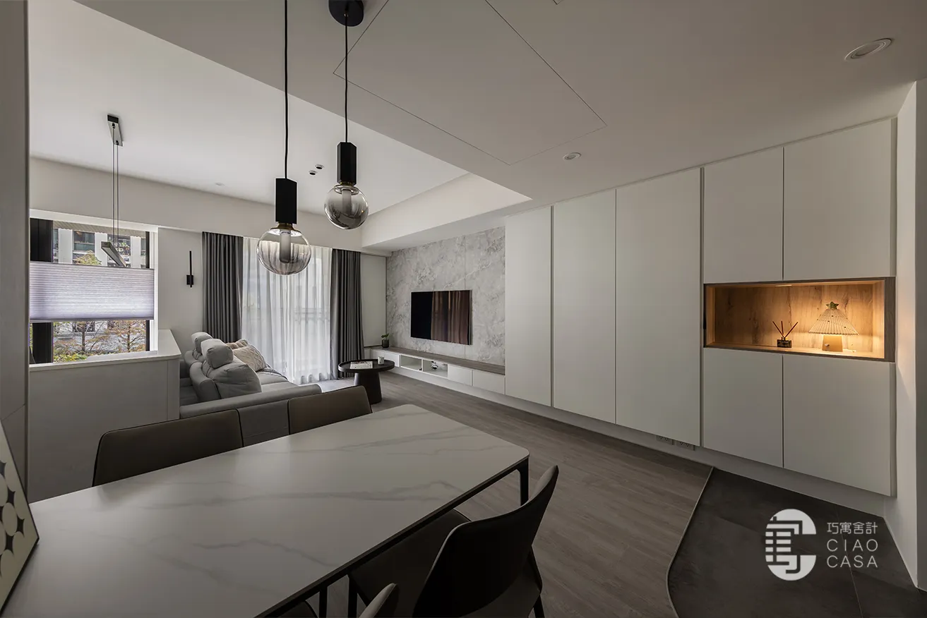 為回應屋主對沉穩現代風的喜好,空間原先規劃以大面黑色調貫穿,但考量坪數與光線條件,設計團隊精細調整色彩比例,改以白色為基底,並運用霧面灰、金屬元素與木質調,形塑細膩的視覺層次。燈光配置則經過多次測試,最終選擇可調式光源,讓空間能隨不同時段與情境靈活轉換,兼顧實用與氛圍營造。