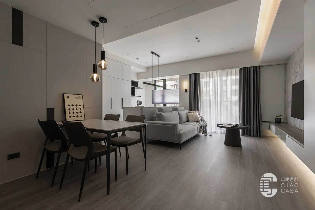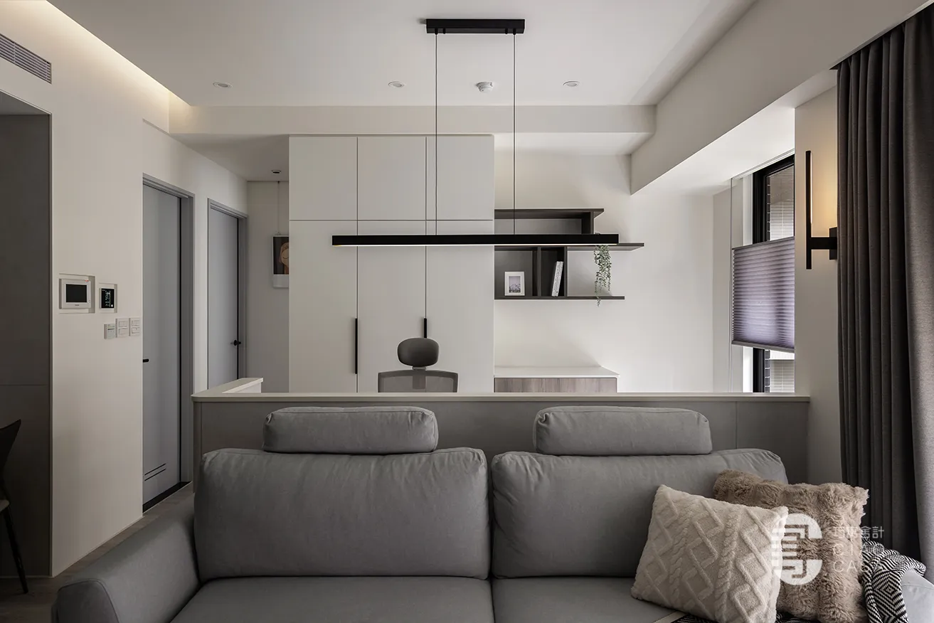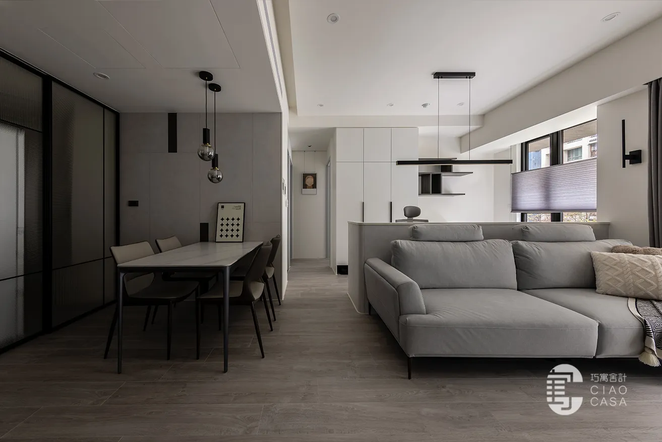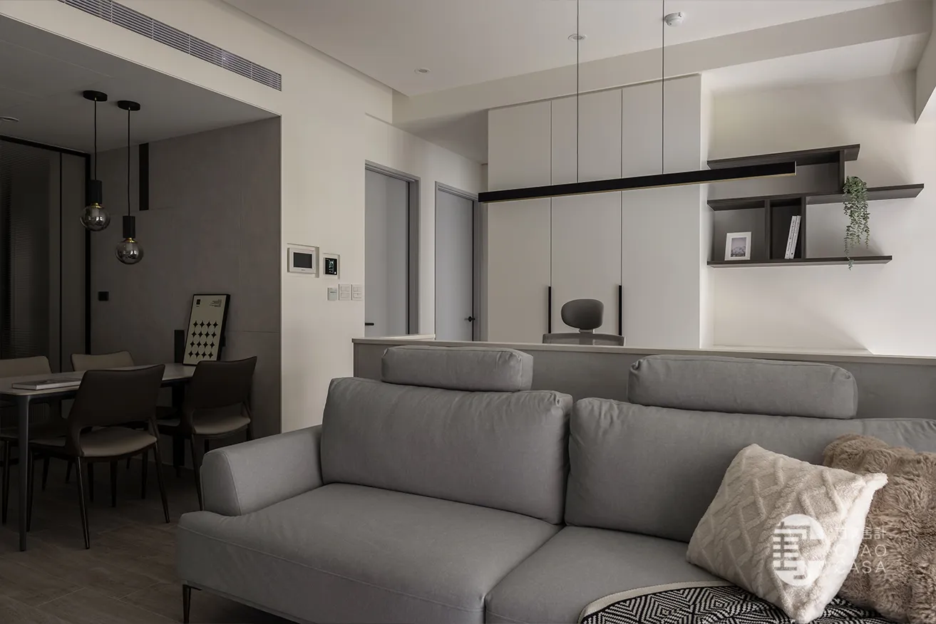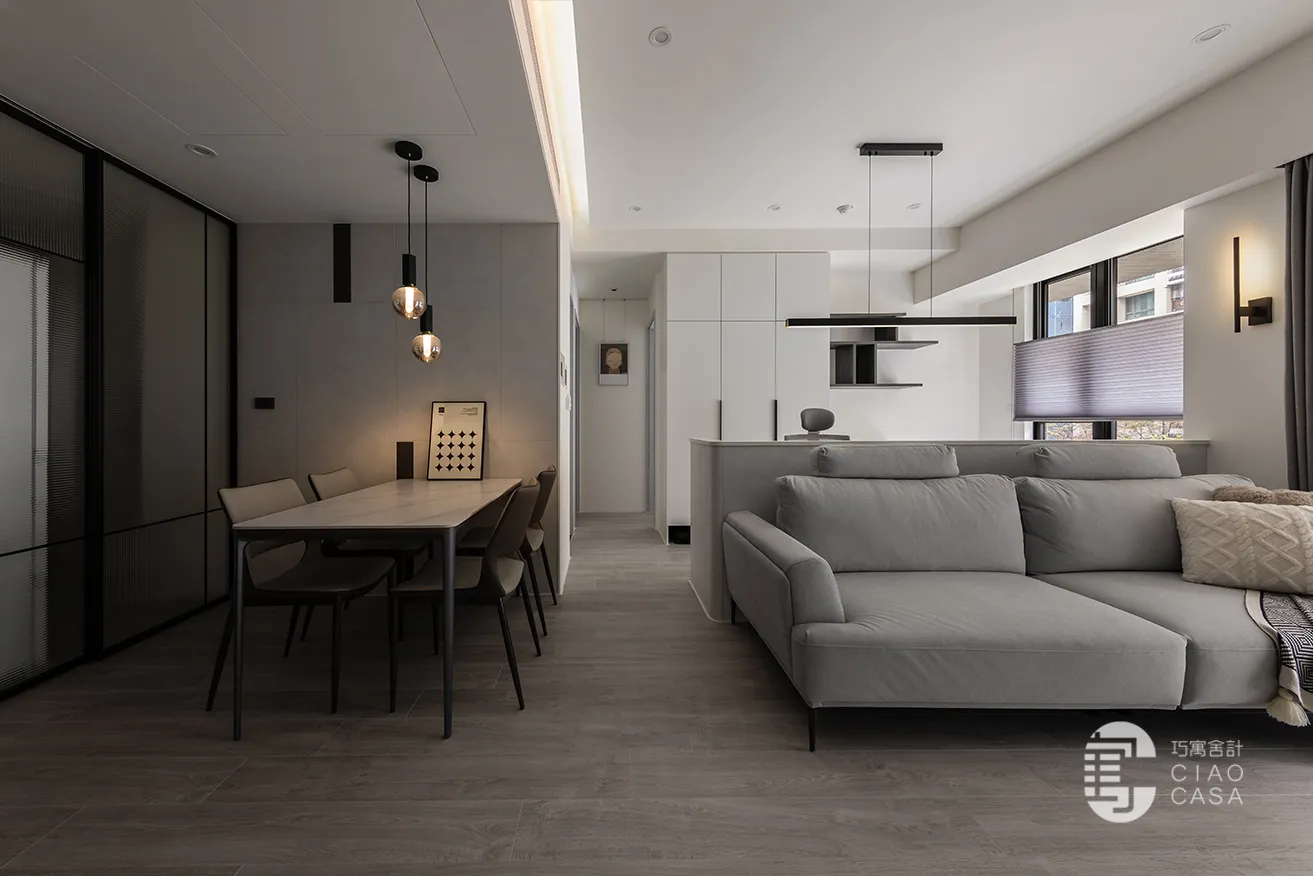 為回應屋主對沉穩現代風的喜好,空間原先規劃以大面黑色調貫穿,但考量坪數與光線條件,設計團隊精細調整色彩比例,改以白色為基底,並運用霧面灰、金屬元素與木質調,形塑細膩的視覺層次。燈光配置則經過多次測試,最終選擇可調式光源,讓空間能隨不同時段與情境靈活轉換,兼顧實用與氛圍營造。