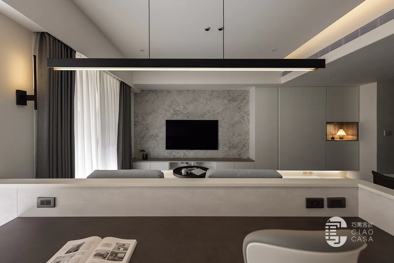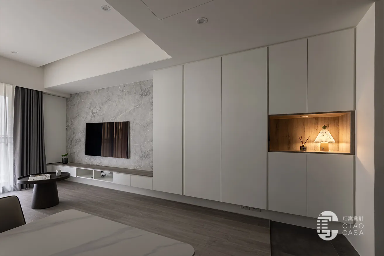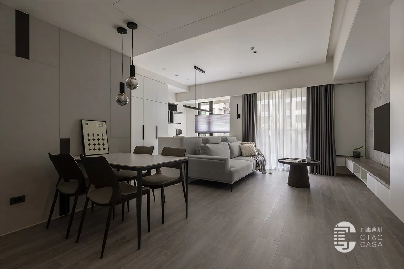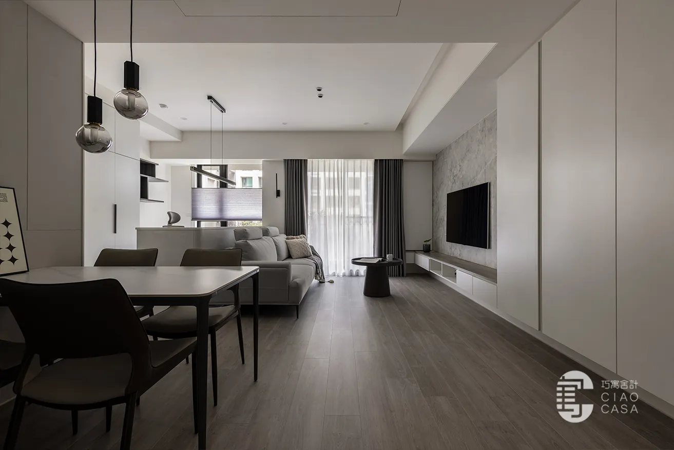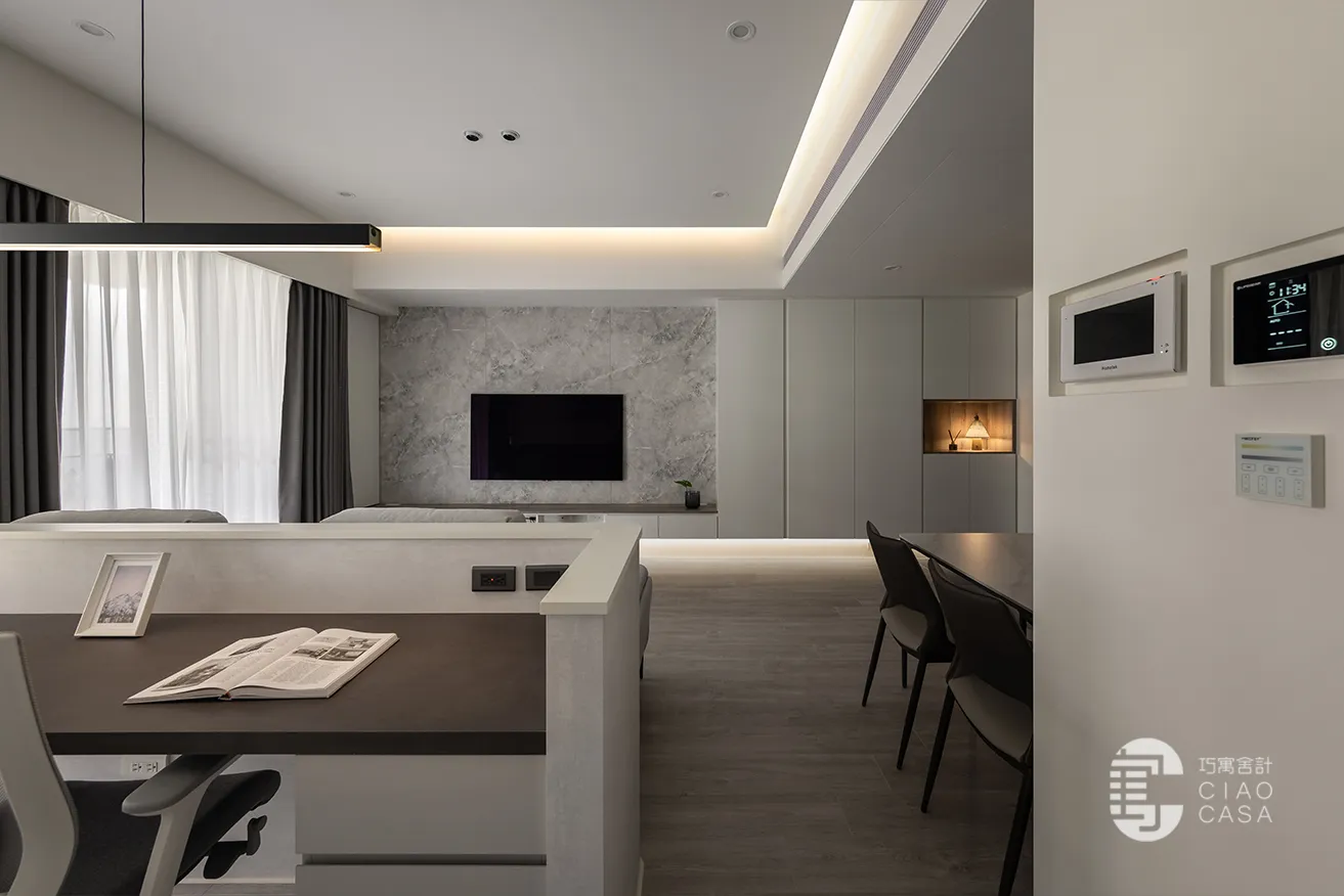為回應屋主對沉穩現代風的喜好,空間原先規劃以大面黑色調貫穿,但考量坪數與光線條件,設計團隊精細調整色彩比例,改以白色為基底,並運用霧面灰、金屬元素與木質調,形塑細膩的視覺層次。燈光配置則經過多次測試,最終選擇可調式光源,讓空間能隨不同時段與情境靈活轉換,兼顧實用與氛圍營造。
