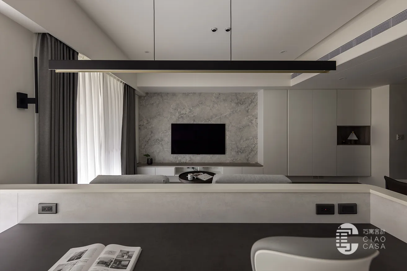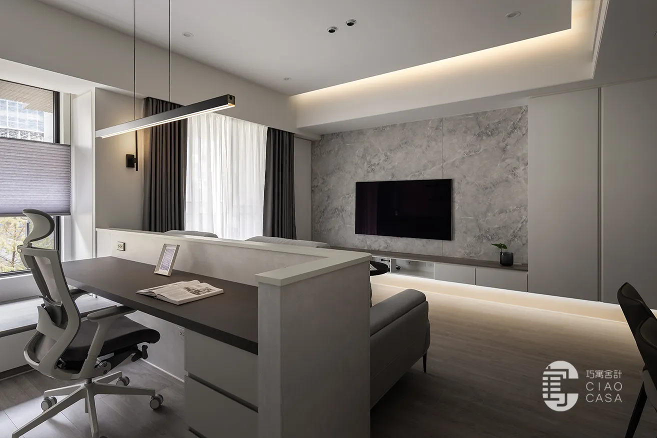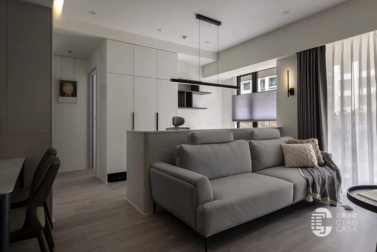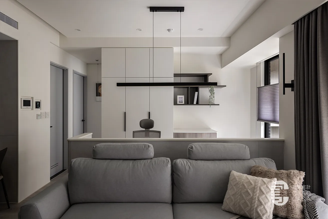 為回應屋主對沉穩現代風的喜好,空間原先規劃以大面黑色調貫穿,但考量坪數與光線條件,設計團隊精細調整色彩比例,改以白色為基底,並運用霧面灰、金屬元素與木質調,形塑細膩的視覺層次。燈光配置則經過多次測試,最終選擇可調式光源,讓空間能隨不同時段與情境靈活轉換,兼顧實用與氛圍營造。