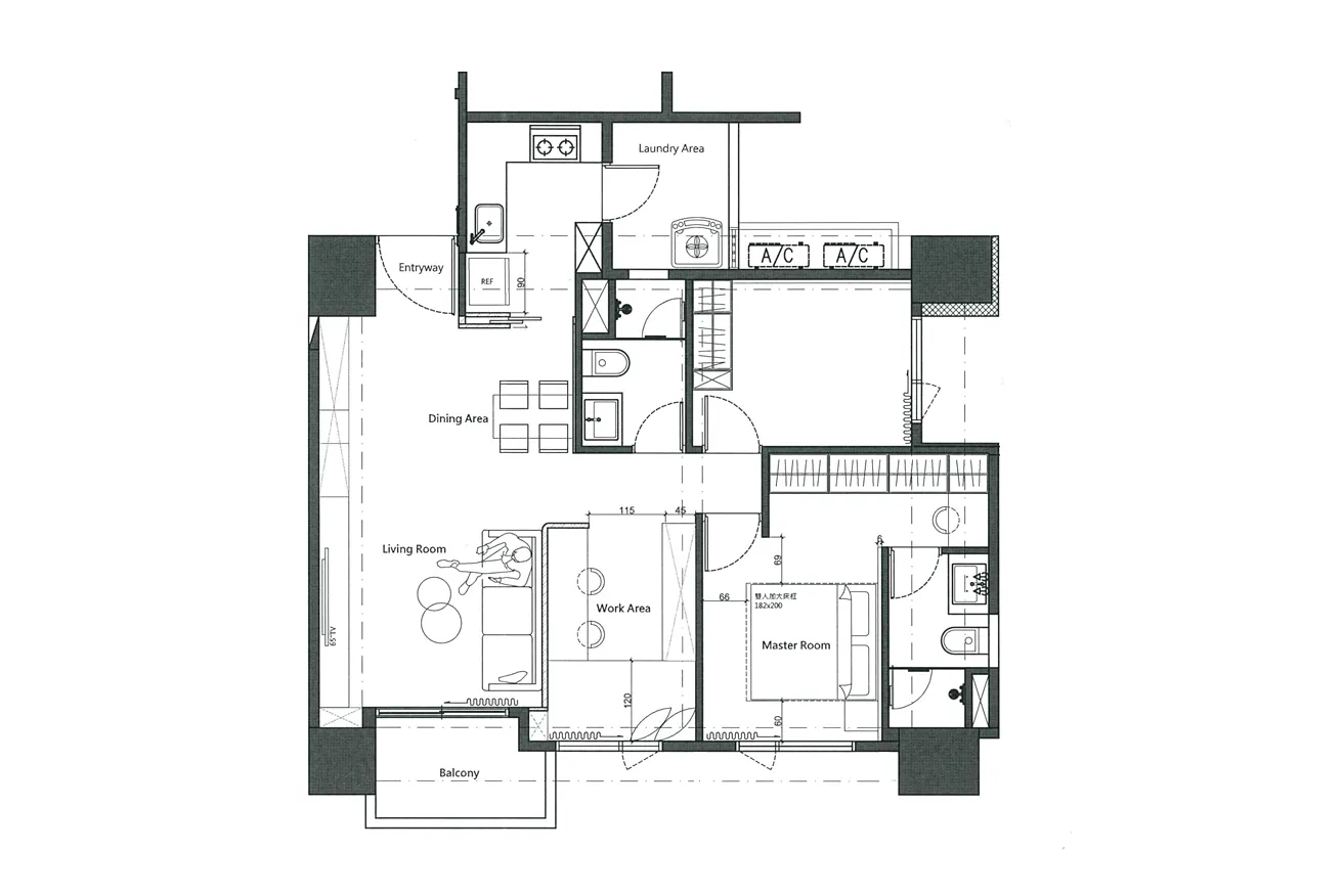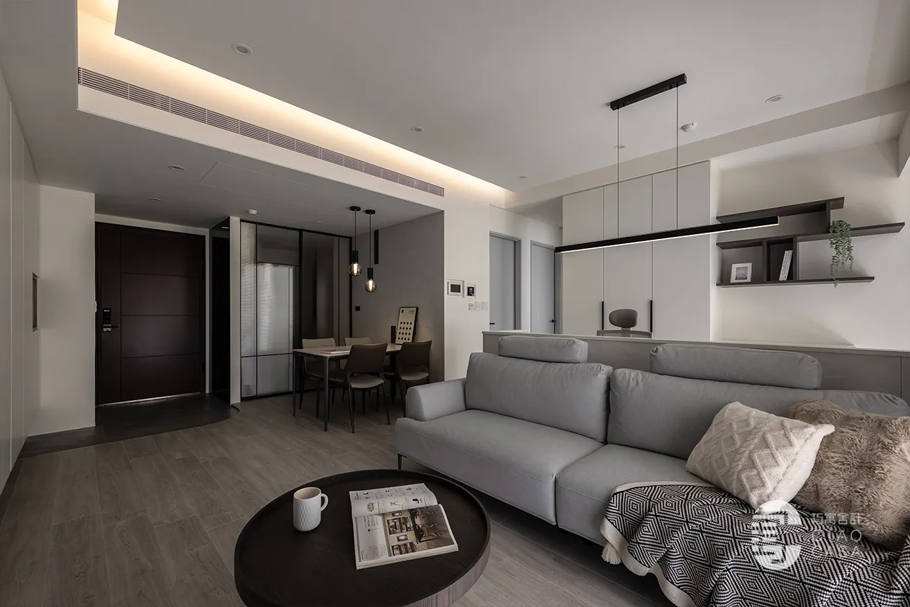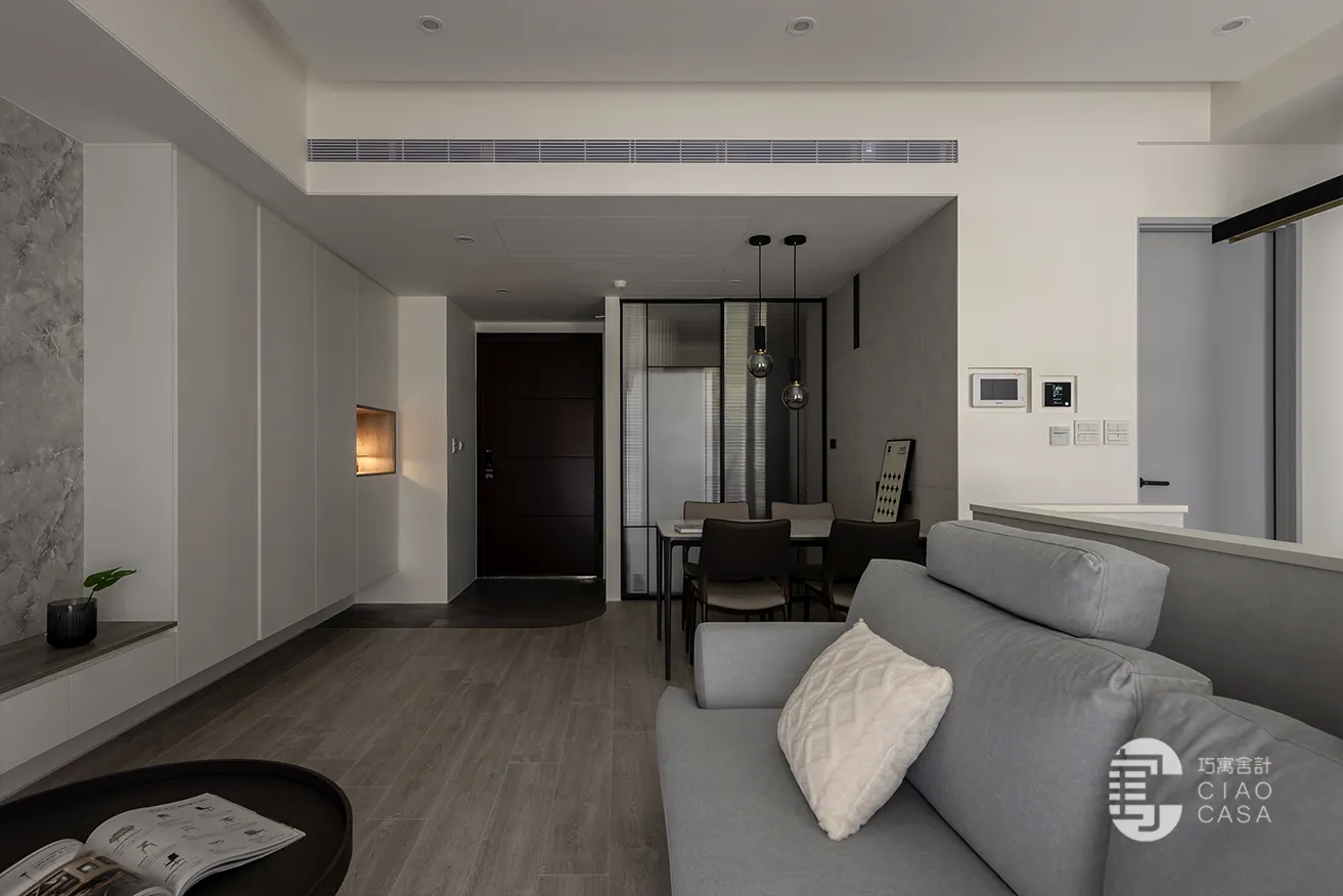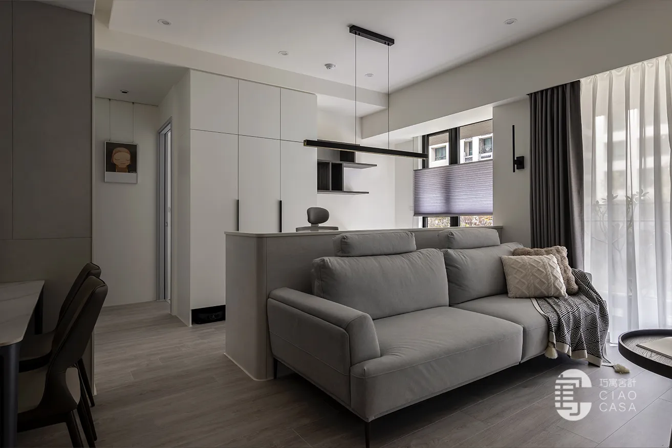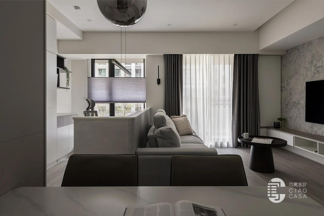為回應屋主對沉穩現代風的喜好,空間原先規劃以大面黑色調貫穿,但考量坪數與光線條件,設計團隊精細調整色彩比例,改以白色為基底,並運用霧面灰、金屬元素與木質調,形塑細膩的視覺層次。燈光配置則經過多次測試,最終選擇可調式光源,讓空間能隨不同時段與情境靈活轉換,兼顧實用與氛圍營造。