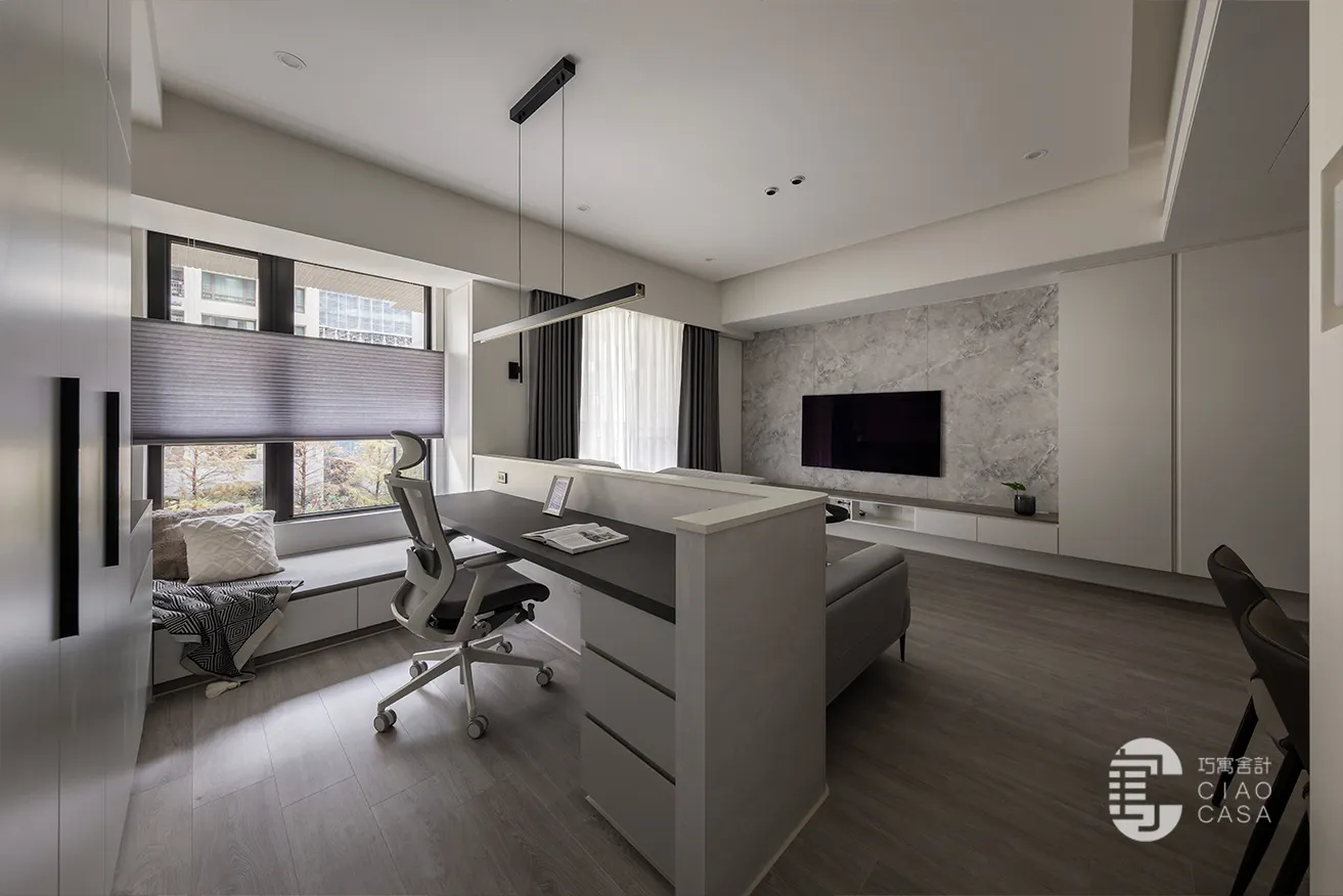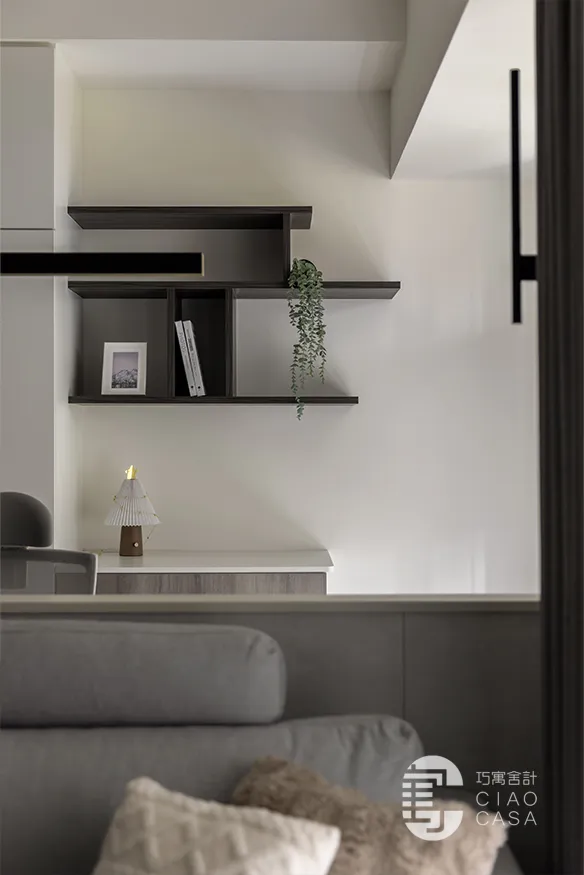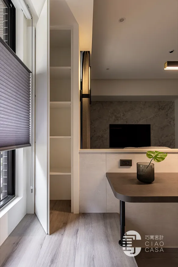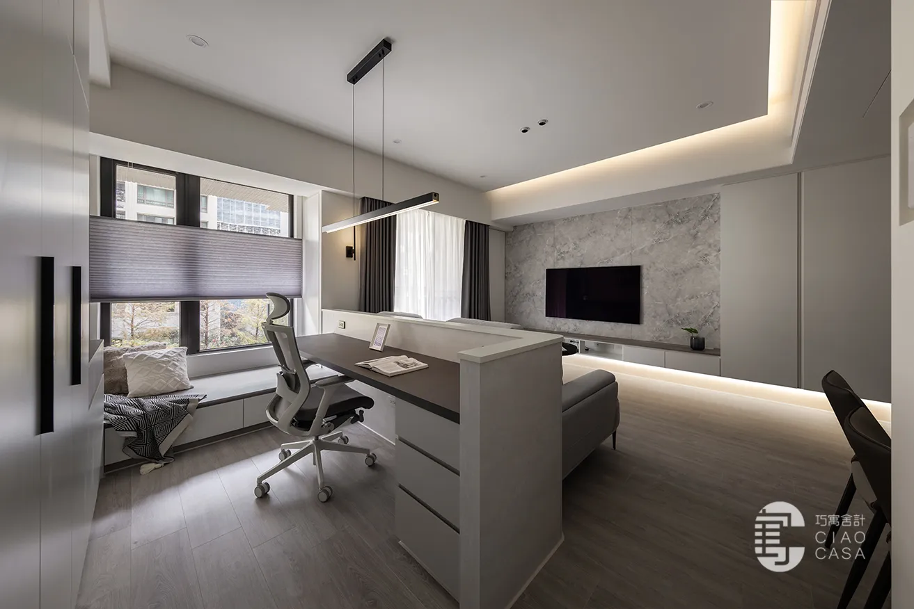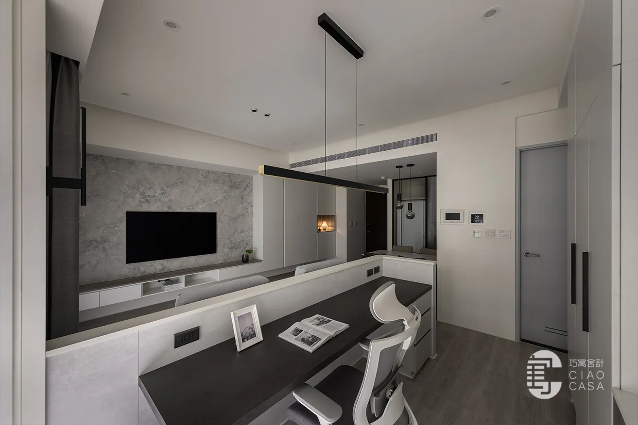 21坪的新成屋裝潢,屋主希望兼顧個人居住需求與未來成家的可能性。因此,林佩琪 Peggy 設計設計師在保留兩間臥室的同時,巧妙調整格局,將第三房併入客廳,形塑開放式多功能書房,使公領域視覺更為寬敞,也讓空間運用更具彈性。