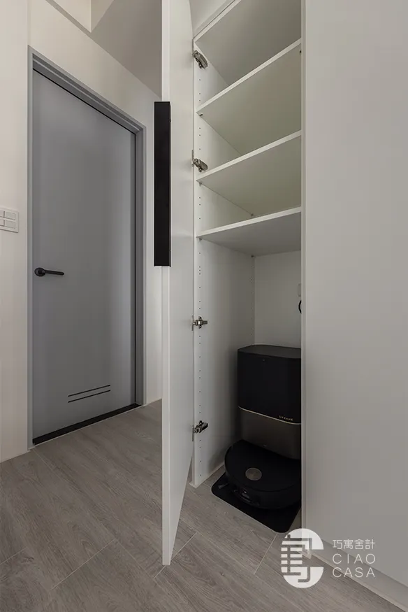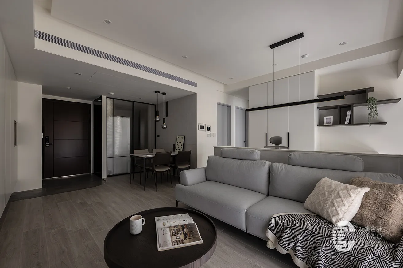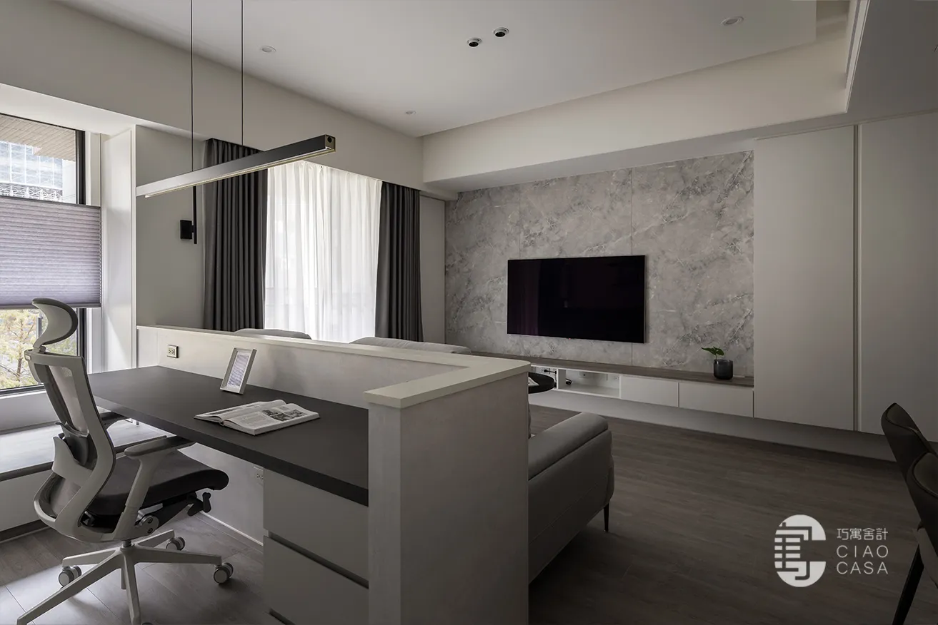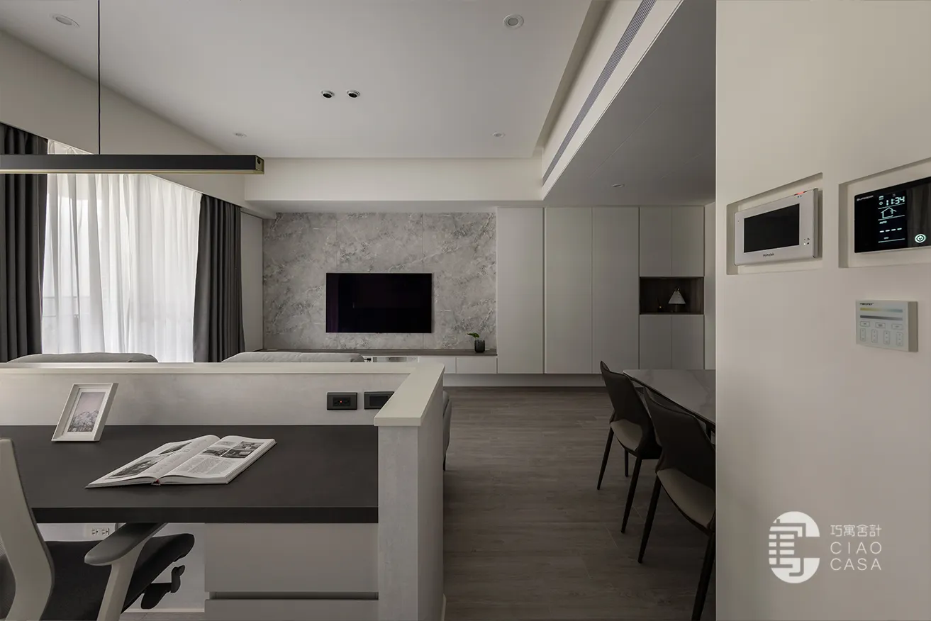 21坪的新成屋裝潢,屋主希望兼顧個人居住需求與未來成家的可能性。因此,林佩琪 Peggy 設計設計師在保留兩間臥室的同時,巧妙調整格局,將第三房併入客廳,形塑開放式多功能書房,使公領域視覺更為寬敞,也讓空間運用更具彈性。