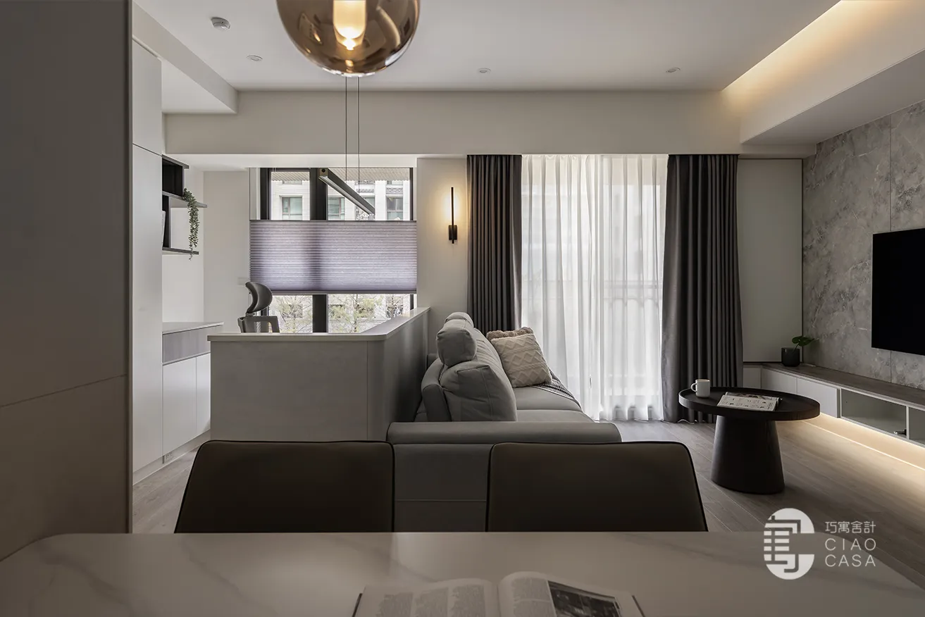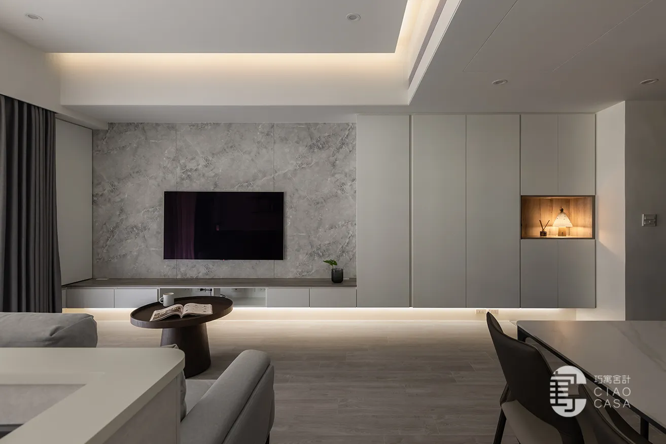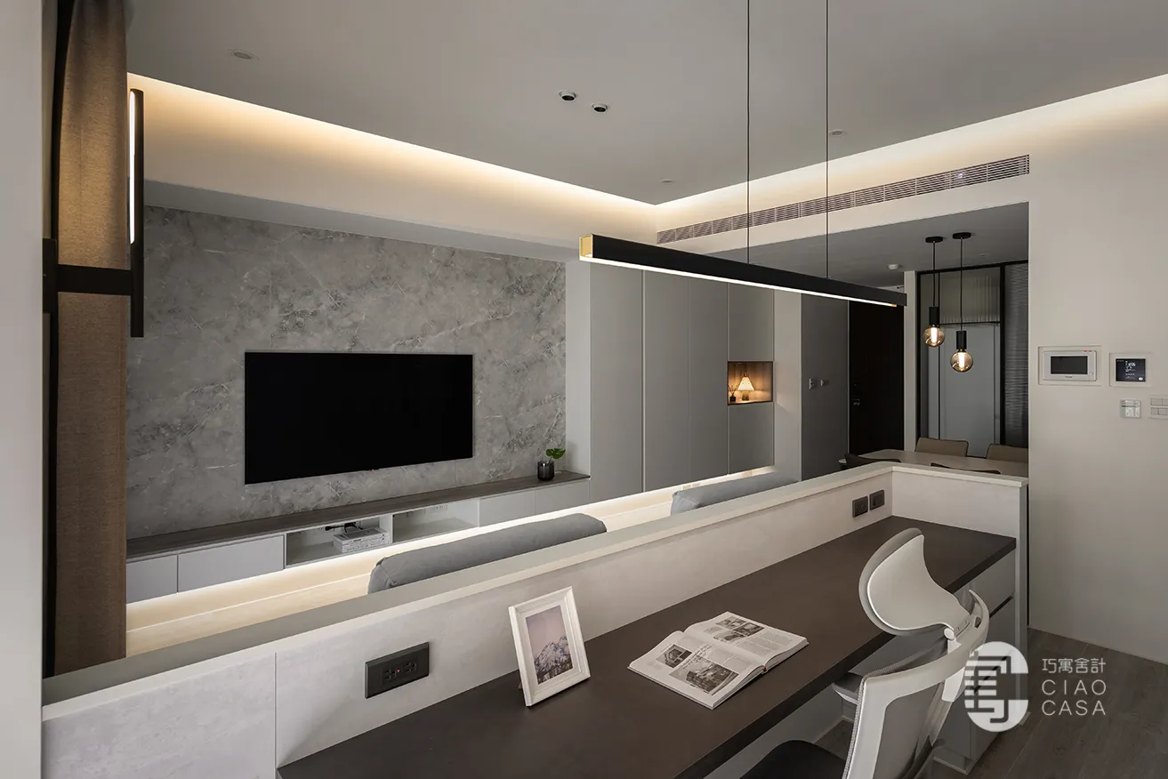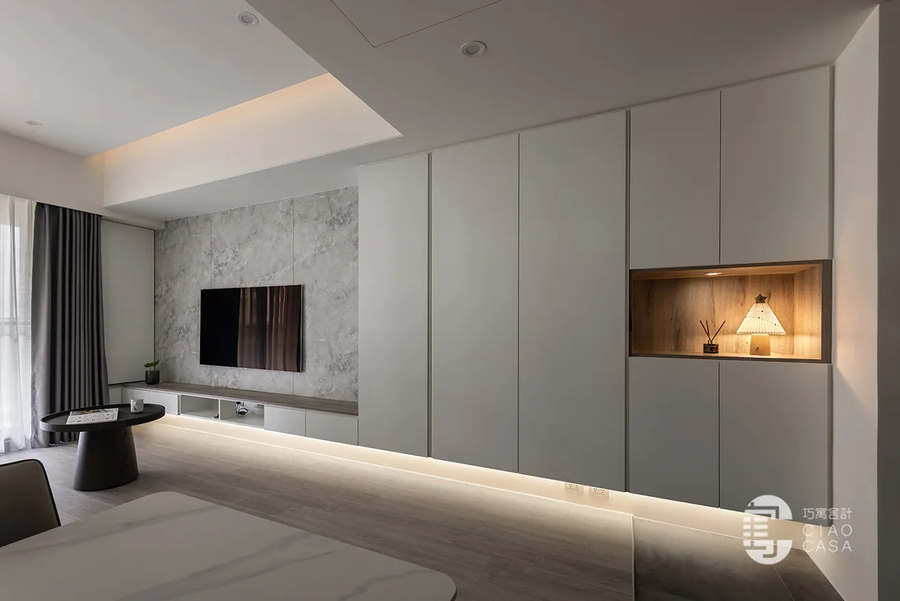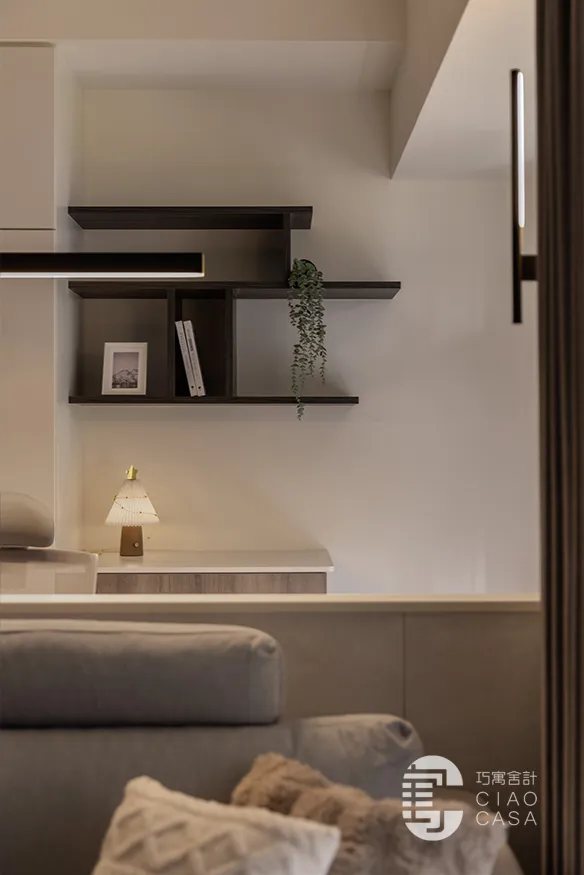 狹長型客廳在視覺比例上易顯侷促,設計師透過調整沙發背牆位置,並導入開放式收納層架,使書房與客廳共享視覺景深。電視牆選用帶細緻紋理的材質,搭配線性燈帶,強化立面層次,營造溫潤的現代氛圍。