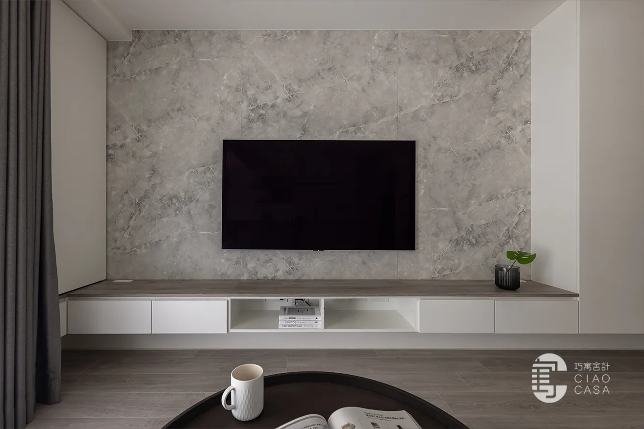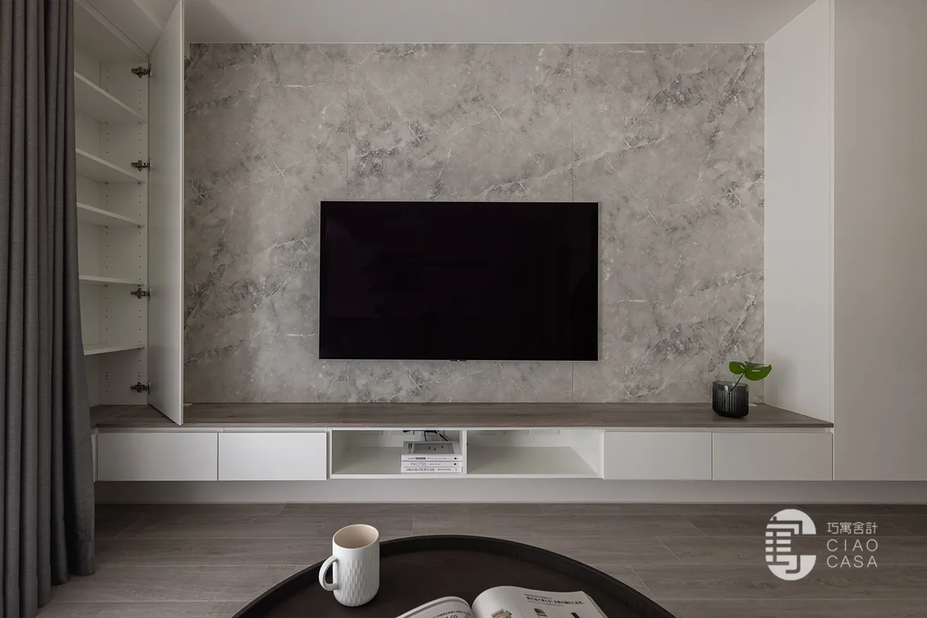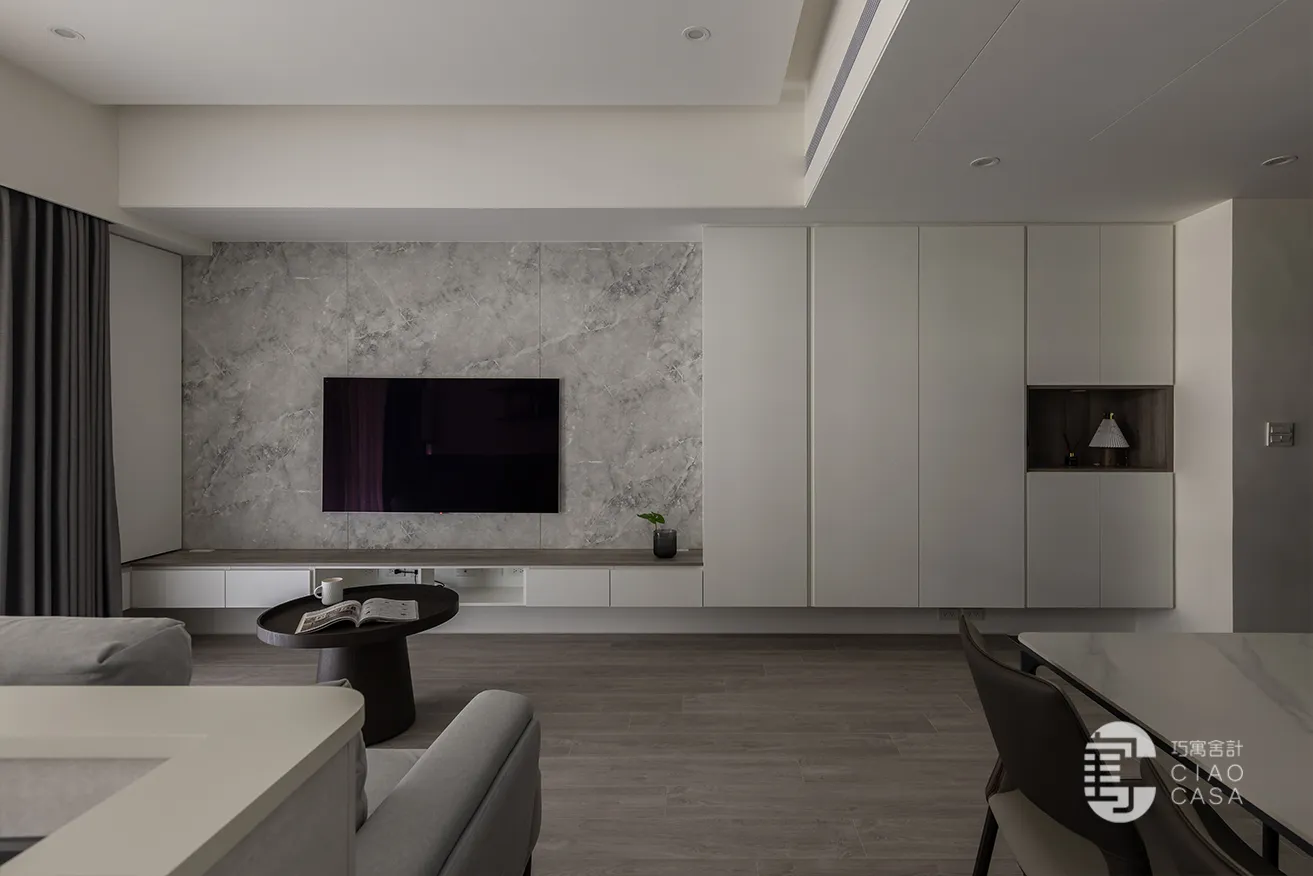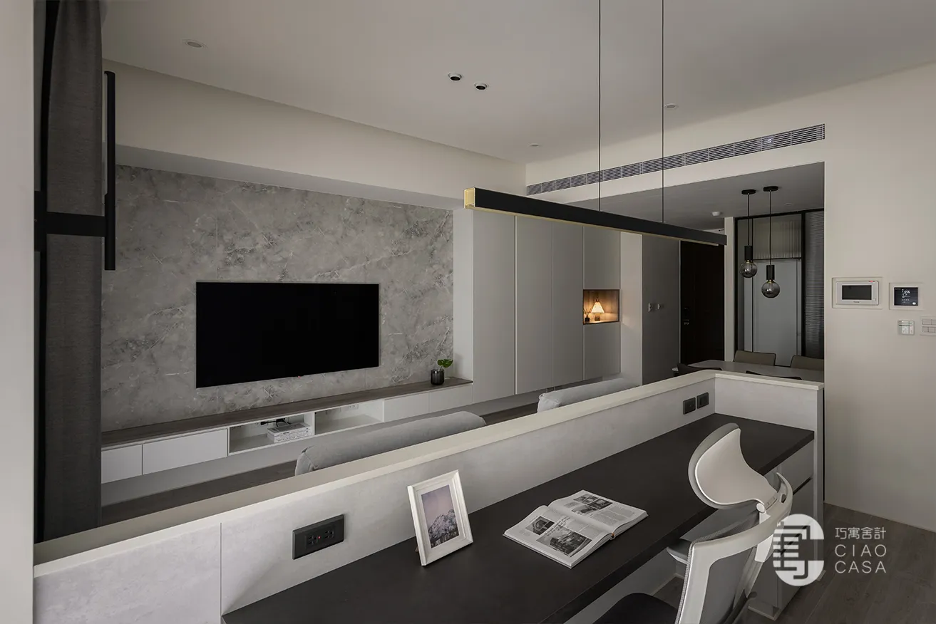狹長型客廳在視覺比例上易顯侷促,設計師透過調整沙發背牆位置,並導入開放式收納層架,使書房與客廳共享視覺景深。電視牆選用帶細緻紋理的材質,搭配線性燈帶,強化立面層次,營造溫潤的現代氛圍。