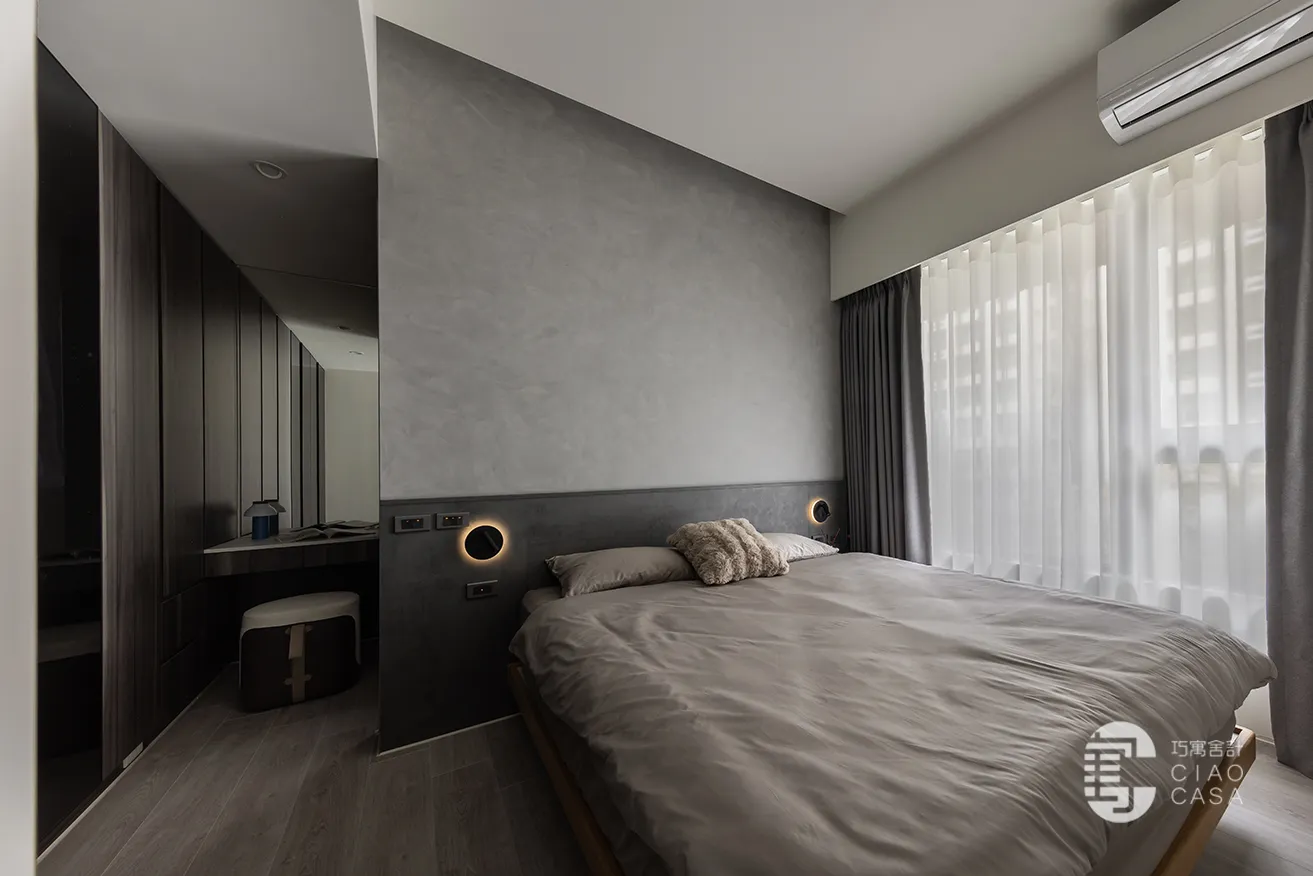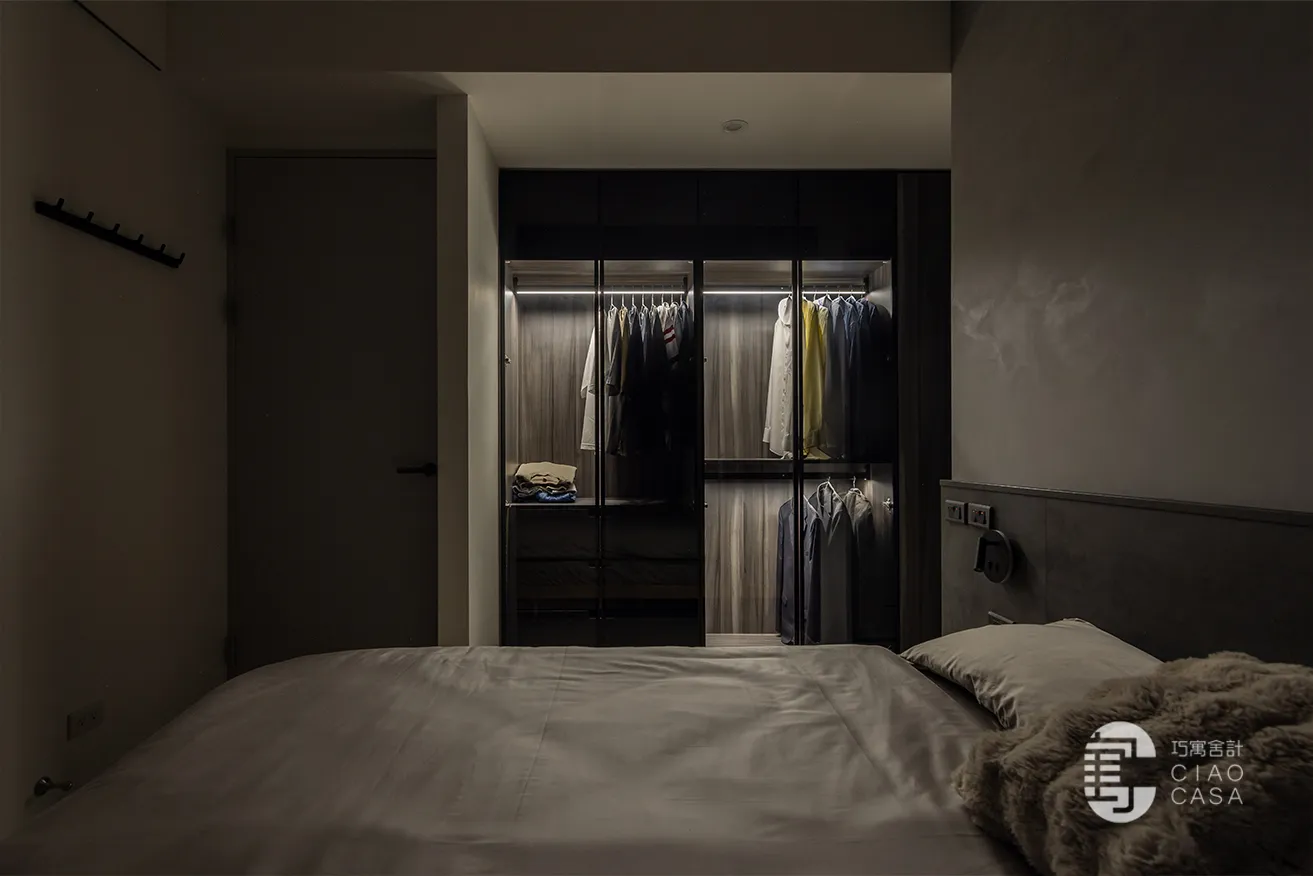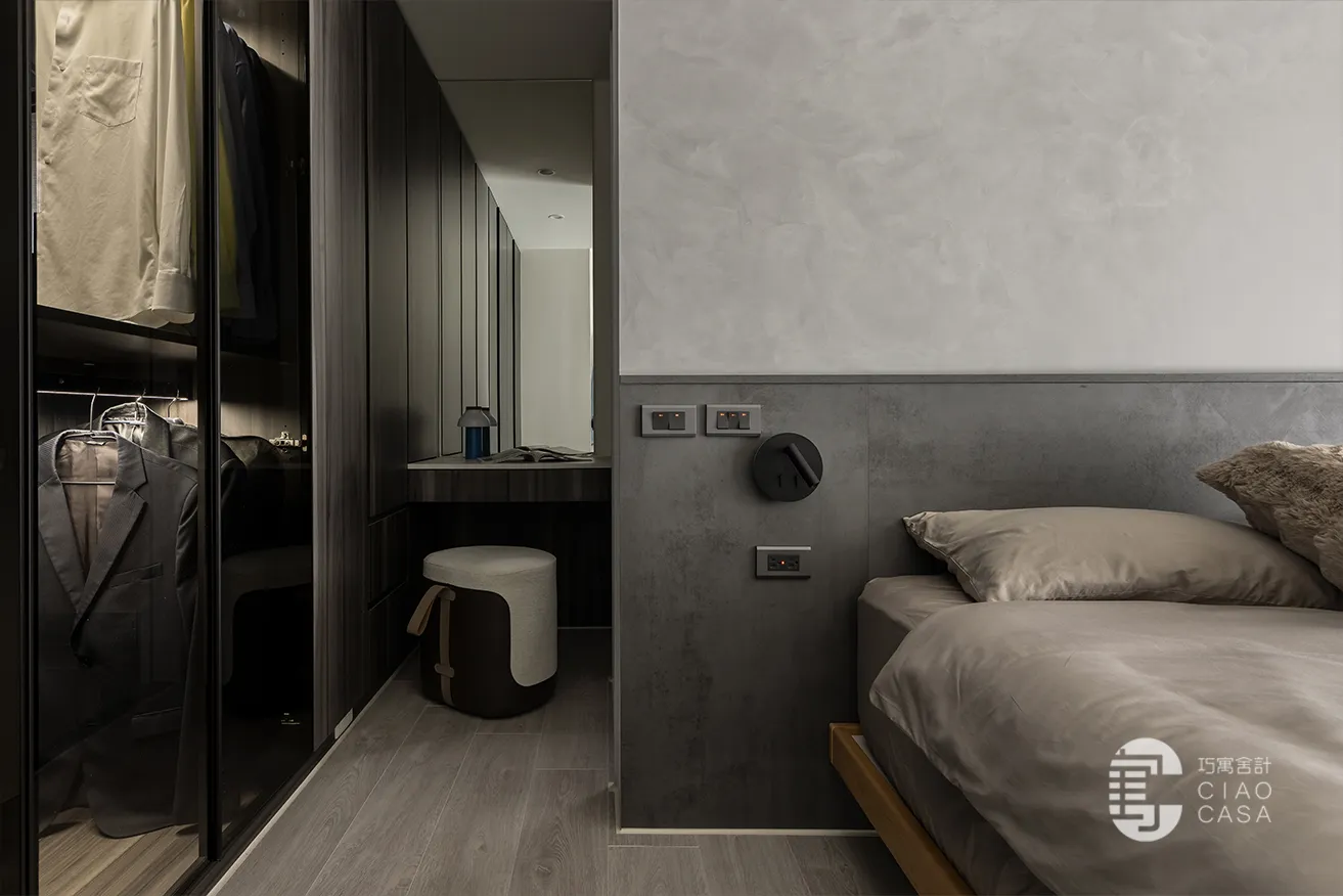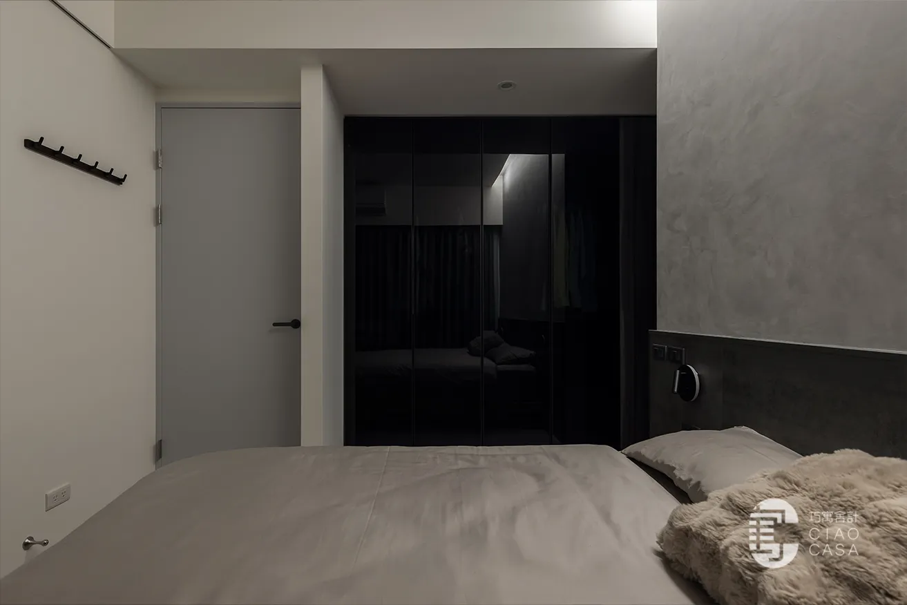 主臥選用深色調鋪陳靜謐氛圍,床頭牆以清水模質感的藝術漆結合仿清水模板材質,增添層次變化。黑色玻璃衣櫃結合內嵌燈光,兼具展示與收納功能,視覺輕盈而不顯壓迫。