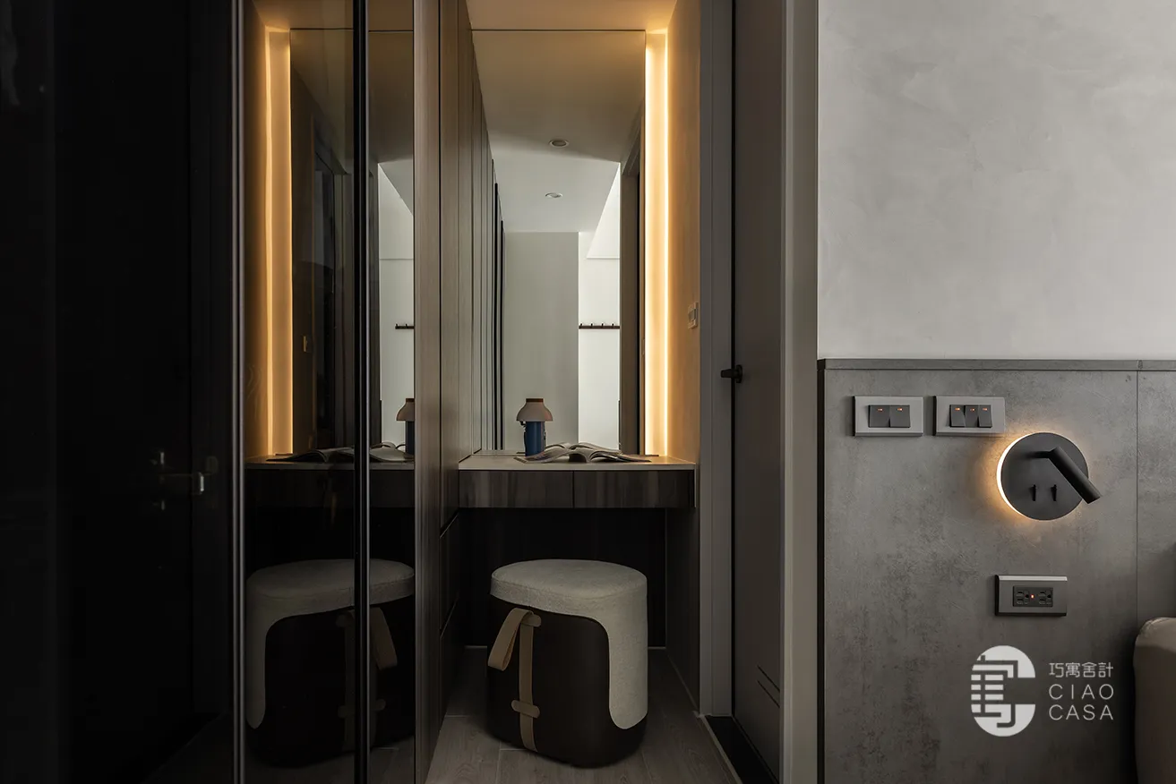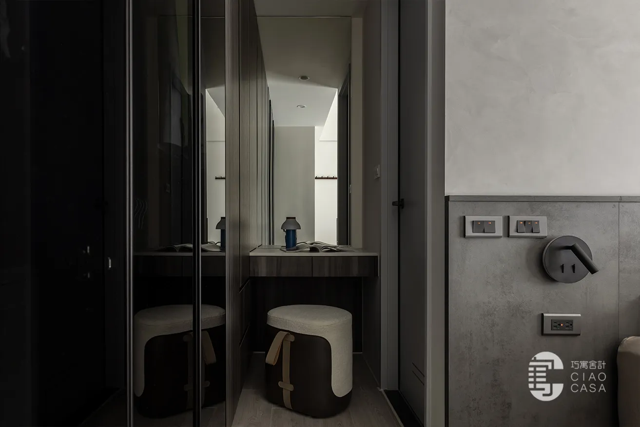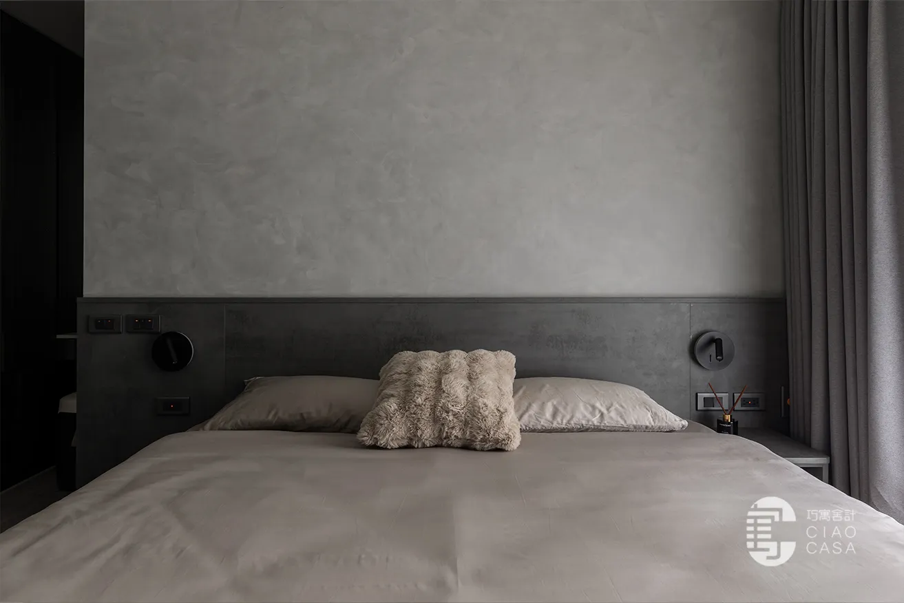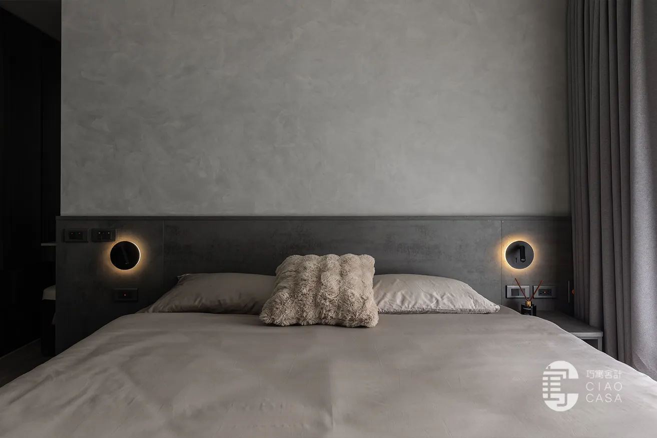主臥選用深色調鋪陳靜謐氛圍,床頭牆以清水模質感的藝術漆結合仿清水模板材質,增添層次變化。黑色玻璃衣櫃結合內嵌燈光,兼具展示與收納功能,視覺輕盈而不顯壓迫。