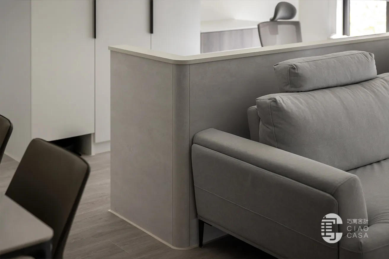 原始三房規劃使客廳尺度較為受限,在客變階段即果斷拆除隔間牆,改以半高牆界定書房,使空間流動而不失獨立性。此外,透過細膩的動線調整,讓客廳、書房、餐廳與廚房形成開放而有序的格局,在敞闊視野與機能需求間取得平衡。