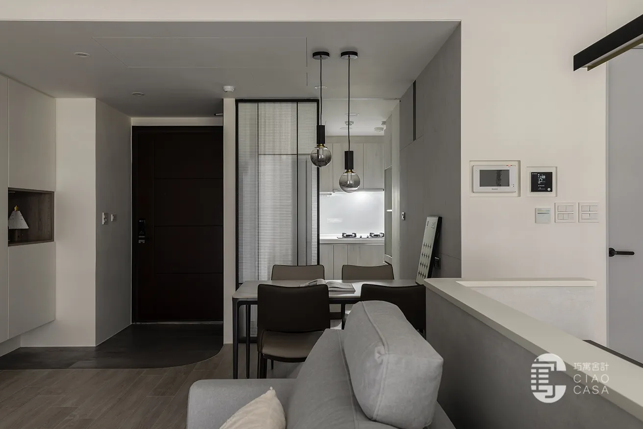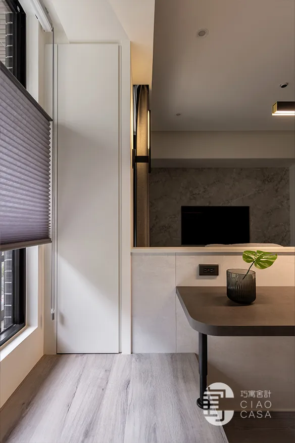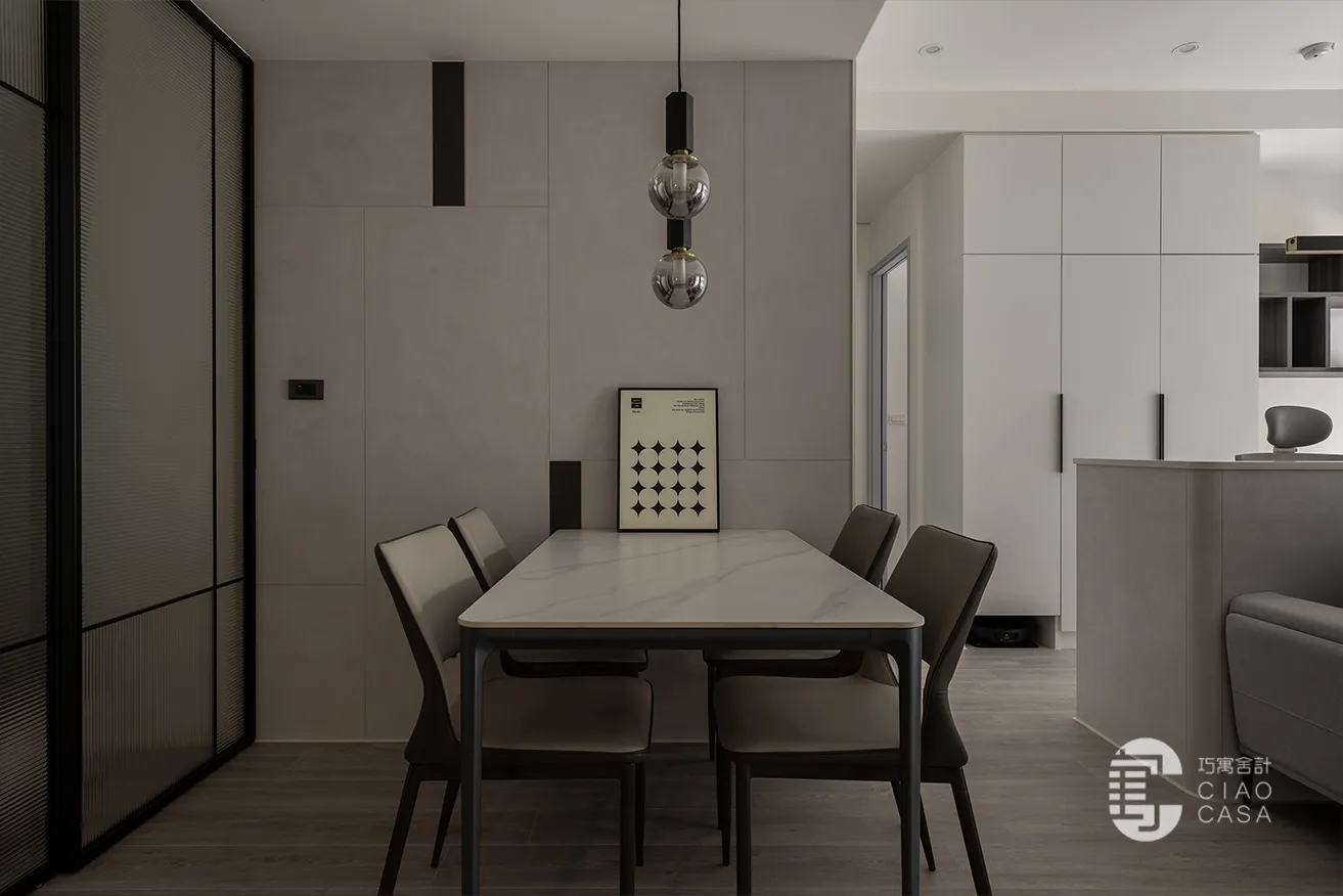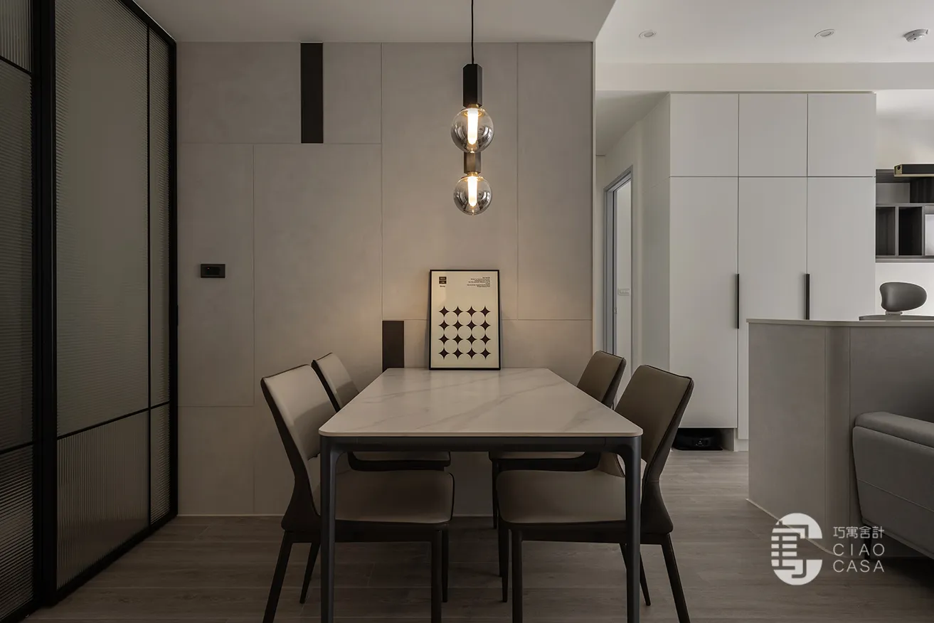 原本封閉式廚房改以鋁框玻璃拉門取代實牆,使自然光得以流動,既維持視覺通透性,又有效隔絕油煙。餐桌貼牆設計優化動線,使小尺度空間亦能展現大器氛圍。