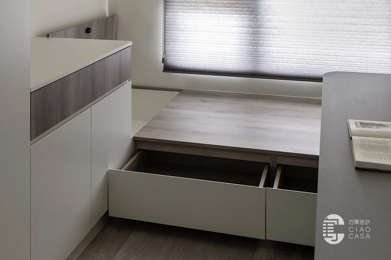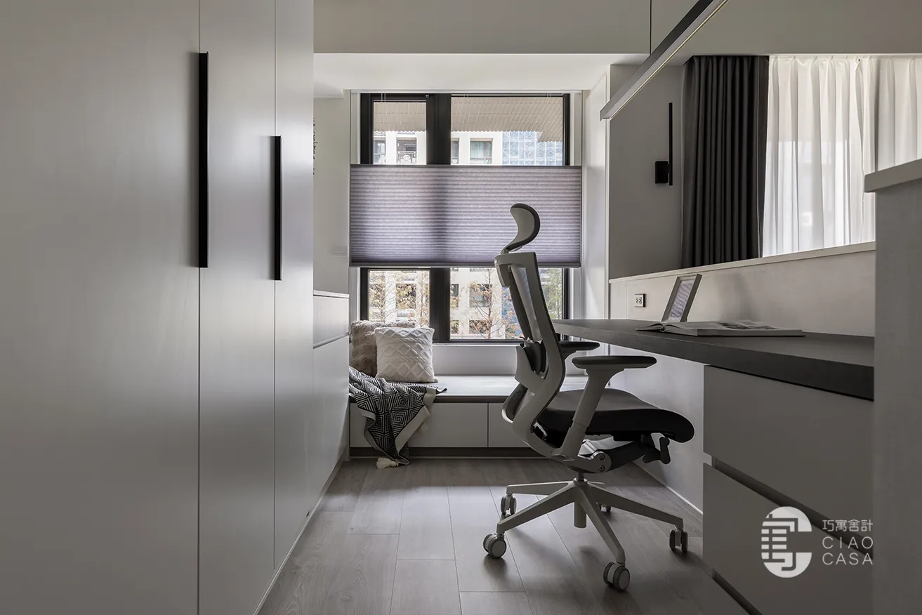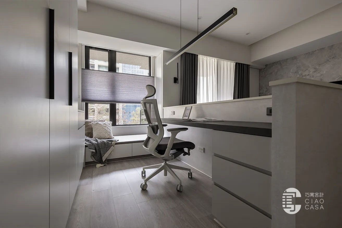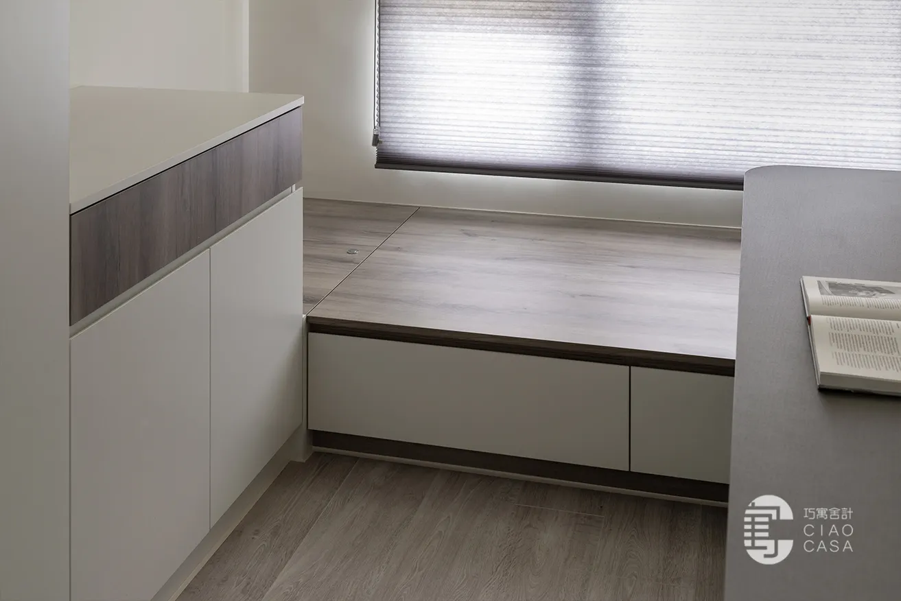 半高牆界定書房範圍,使其成為客廳的延伸,既保留隱私,又不阻擋光線流動。內部整合臥榻與收納,提供閱讀、工作、短暫留宿的多元功能。窗邊直立收納櫃則巧妙隱藏結構凹洞,整體畫面更為俐落。