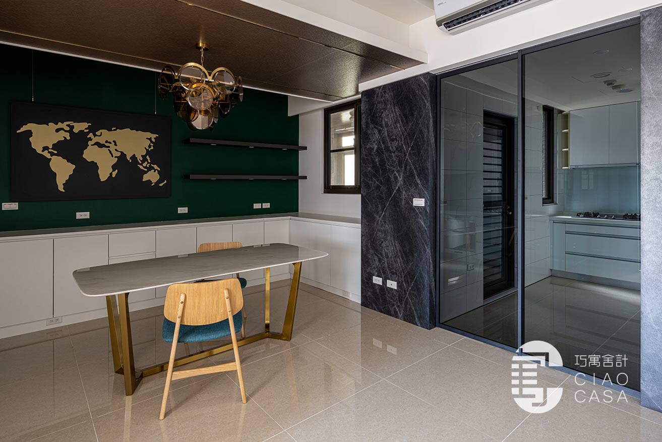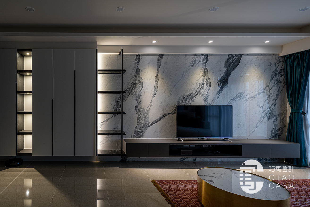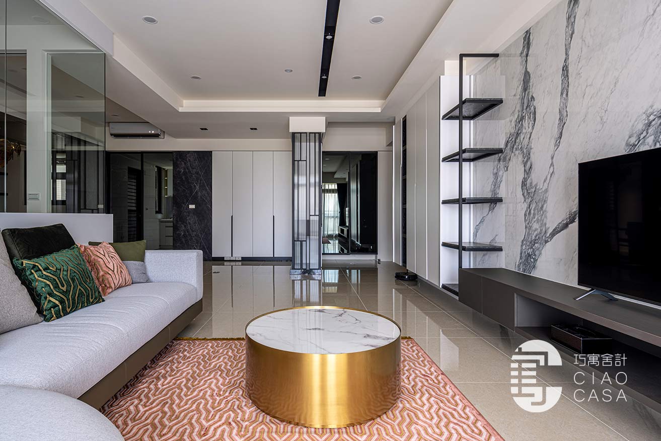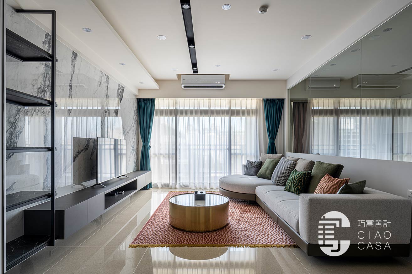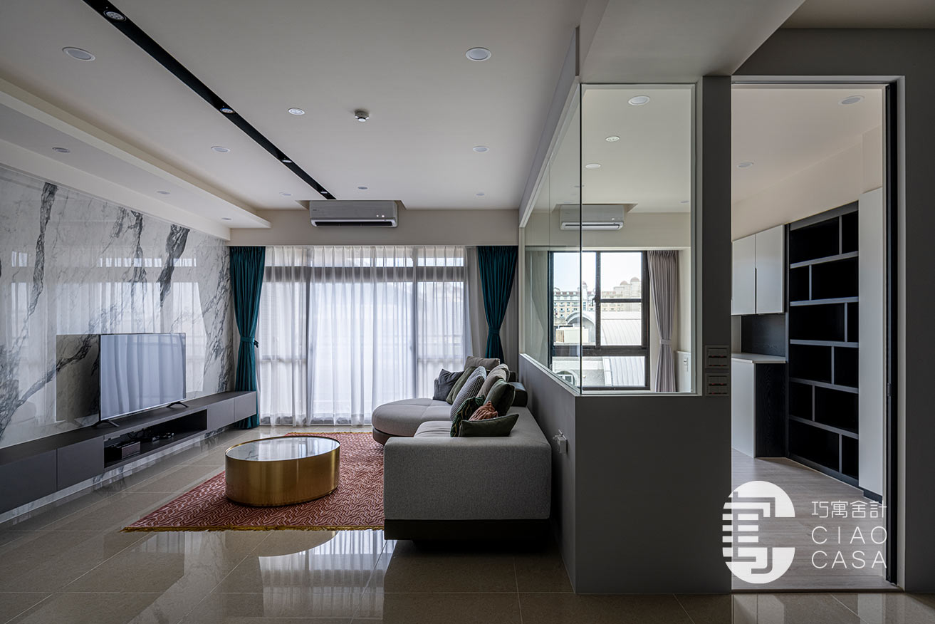 本案位於桃園市區的新屋裝潢,由何康玄設計師著手規劃,融合業主需求,公共空間維持全開放格局,以黑、白作為主色,讓空間保持純粹、俐落,再利用綠色、紅色的軟裝點綴,深淺分明帶出良好的層次感,大理石電視牆更創造深度的空間視覺,成為了公共空間的主角。
