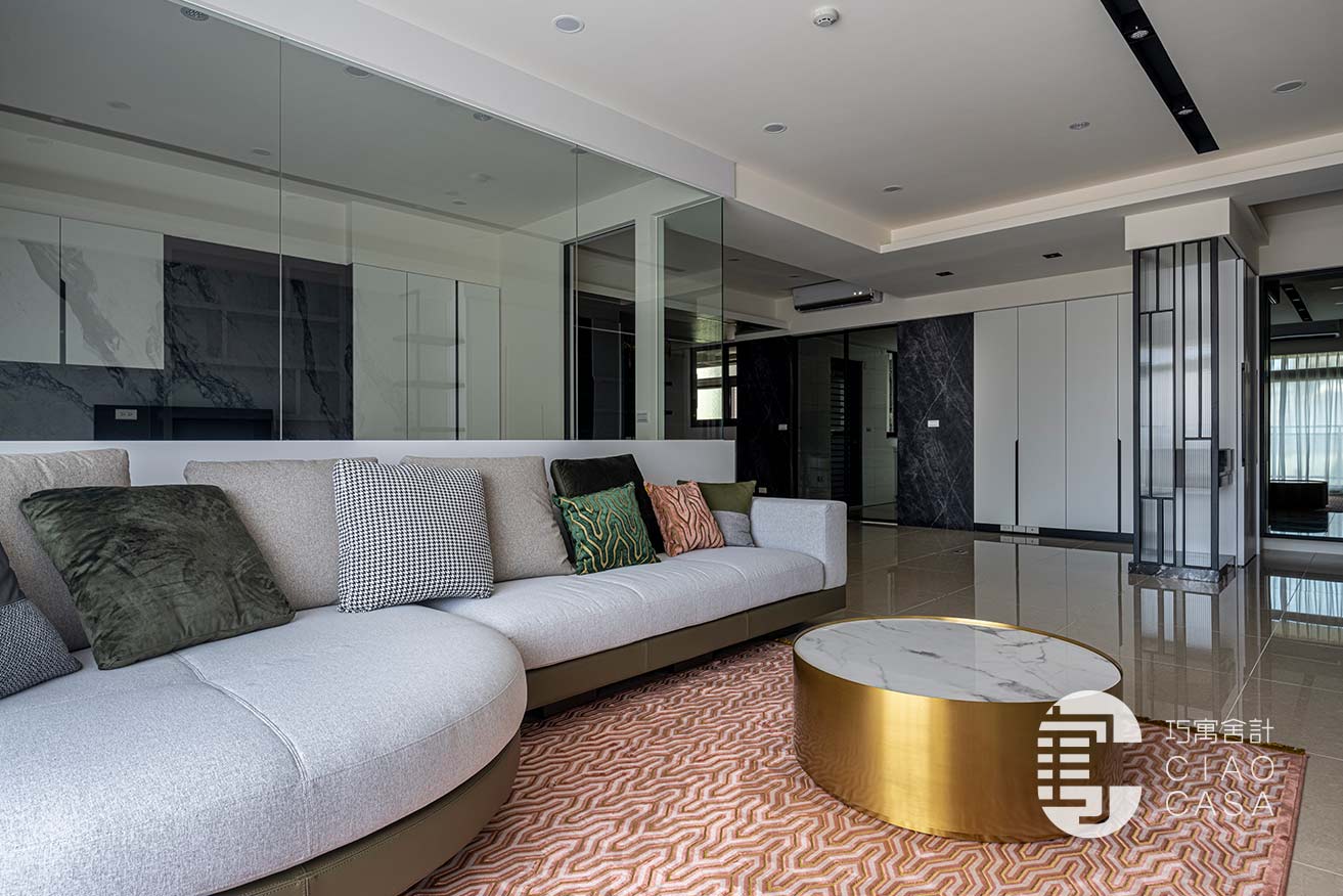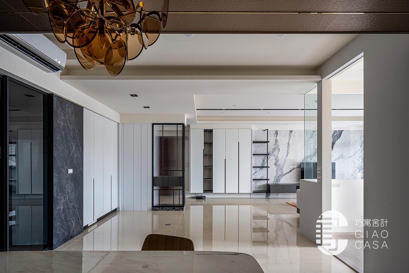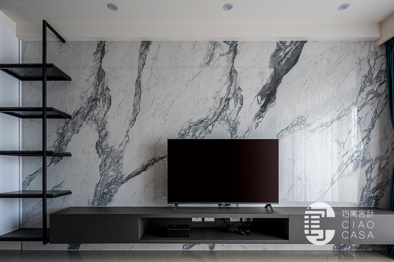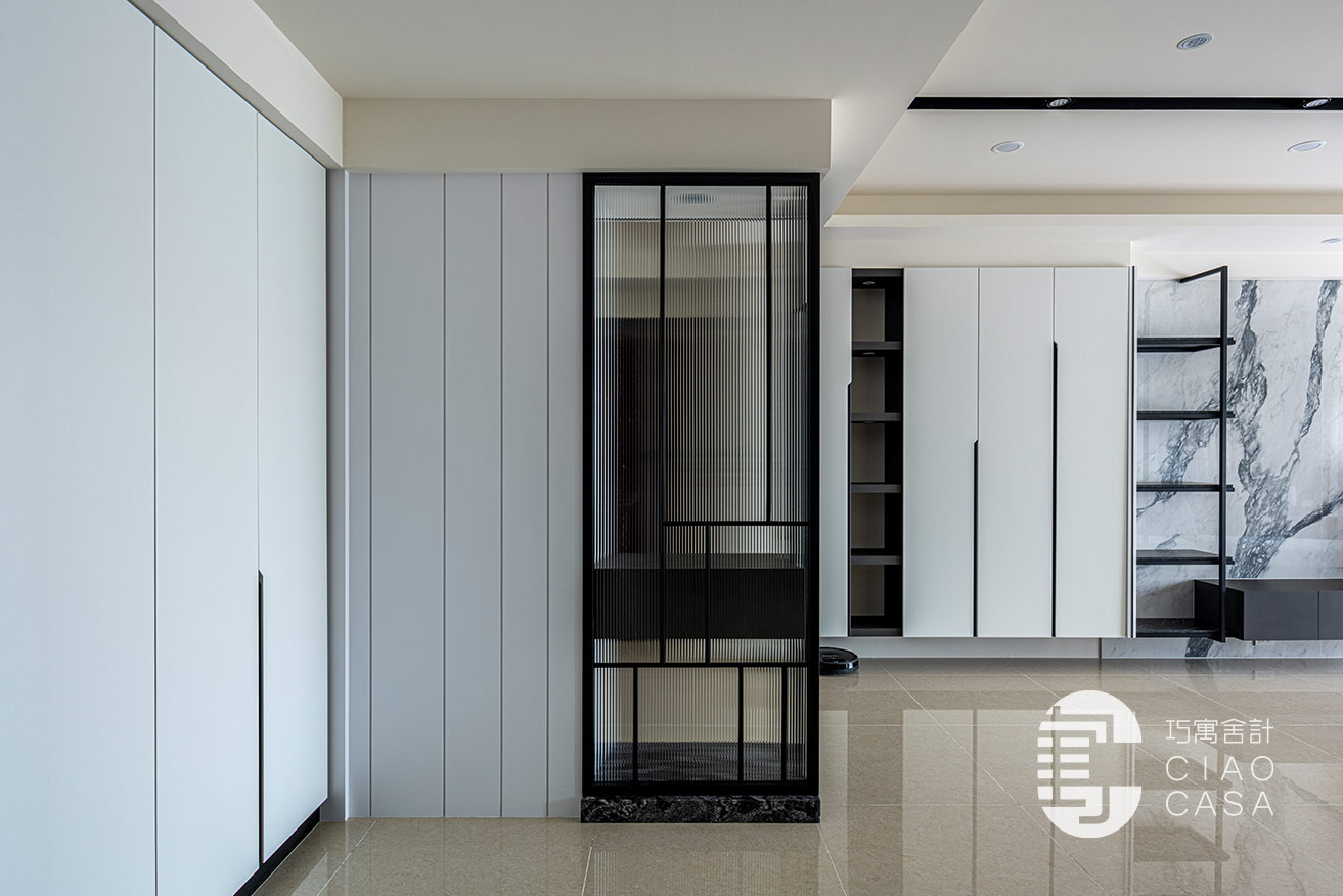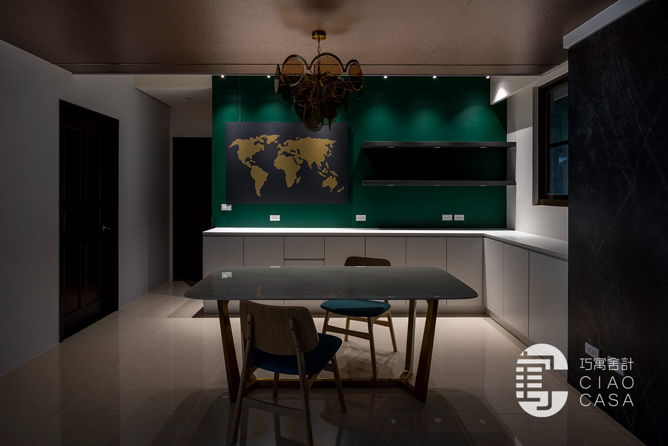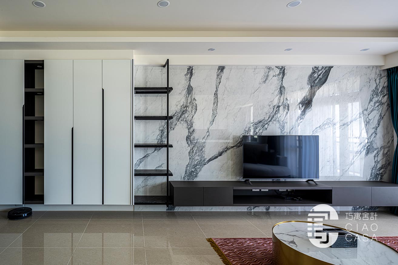 本案位於桃園市區的新屋裝潢,由何康玄設計師著手規劃,融合業主需求,公共空間維持全開放格局,以黑、白作為主色,讓空間保持純粹、俐落,再利用綠色、紅色的軟裝點綴,深淺分明帶出良好的層次感,大理石電視牆更創造深度的空間視覺,成為了公共空間的主角。