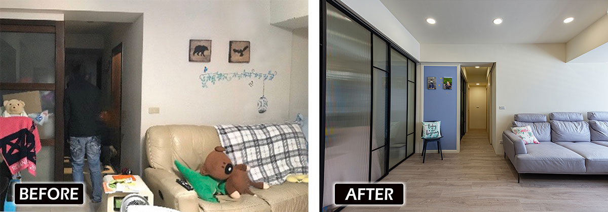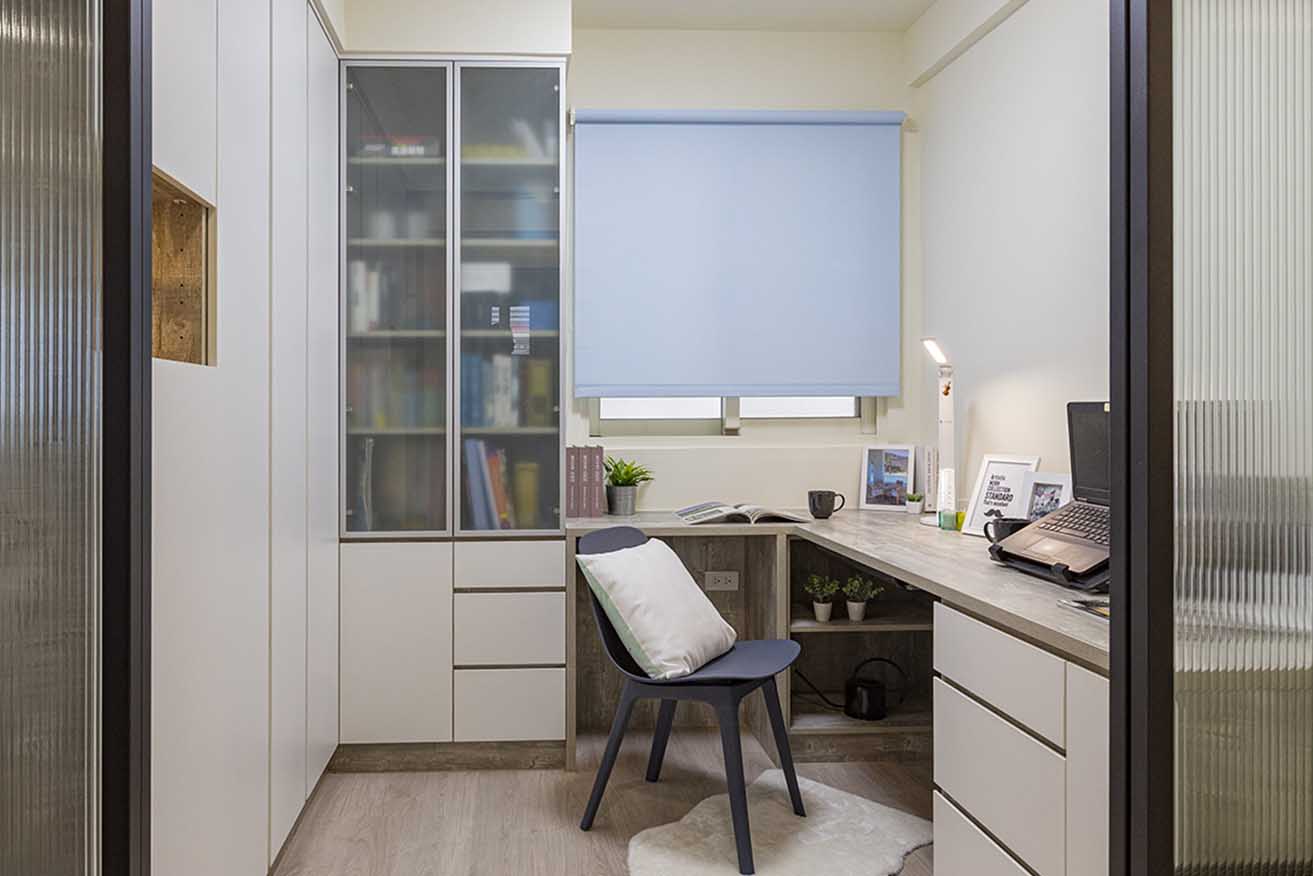 將陳舊木作滑門改由長虹玻璃替代,使日光毫無保留傾灑入室,由於原先僅規劃兩座 45 公分寬的書櫃,導致收納機能稍嫌不足,於是依循結構拓展置頂高櫃,同時輔以霧玻代替清玻,消除視覺紊亂感。