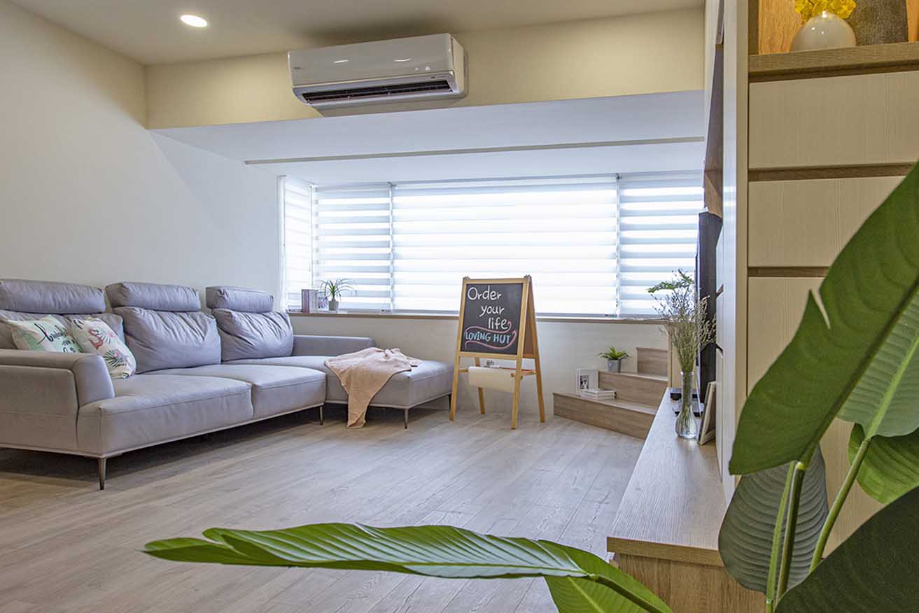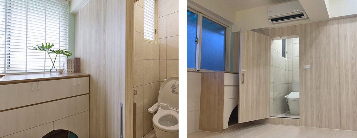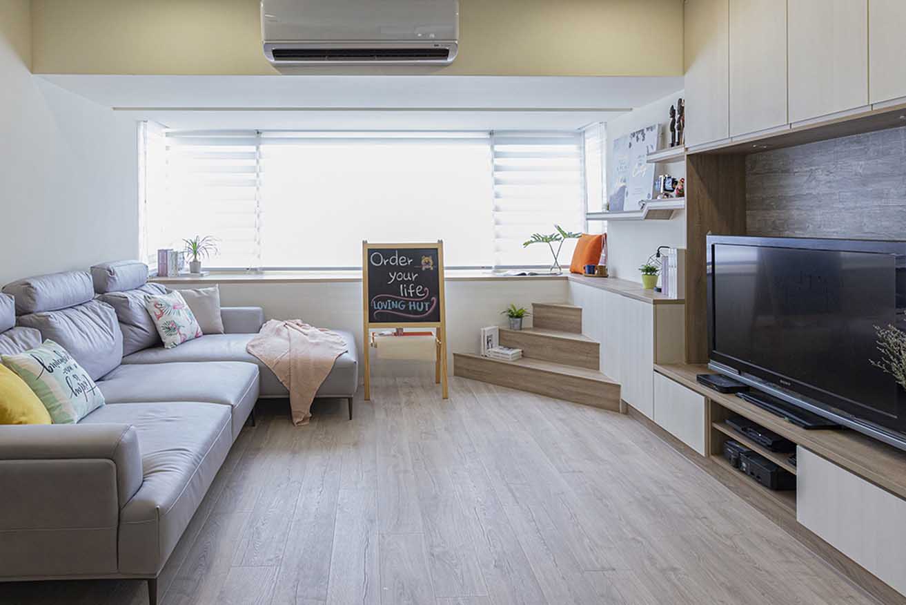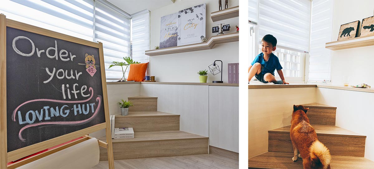 全室以溫潤木地坪取代冰冷磁磚,經由溫煦日光映照,渲染明亮舒適氛圍。被屋主一家捧在手心的球球,特別喜歡跳上窗台觀望外面風景,但在年紀漸長後而略顯吃力,因此夫妻倆希望能將窗台設計改善,讓愛犬輕鬆使用。