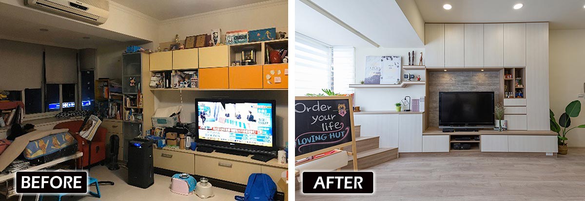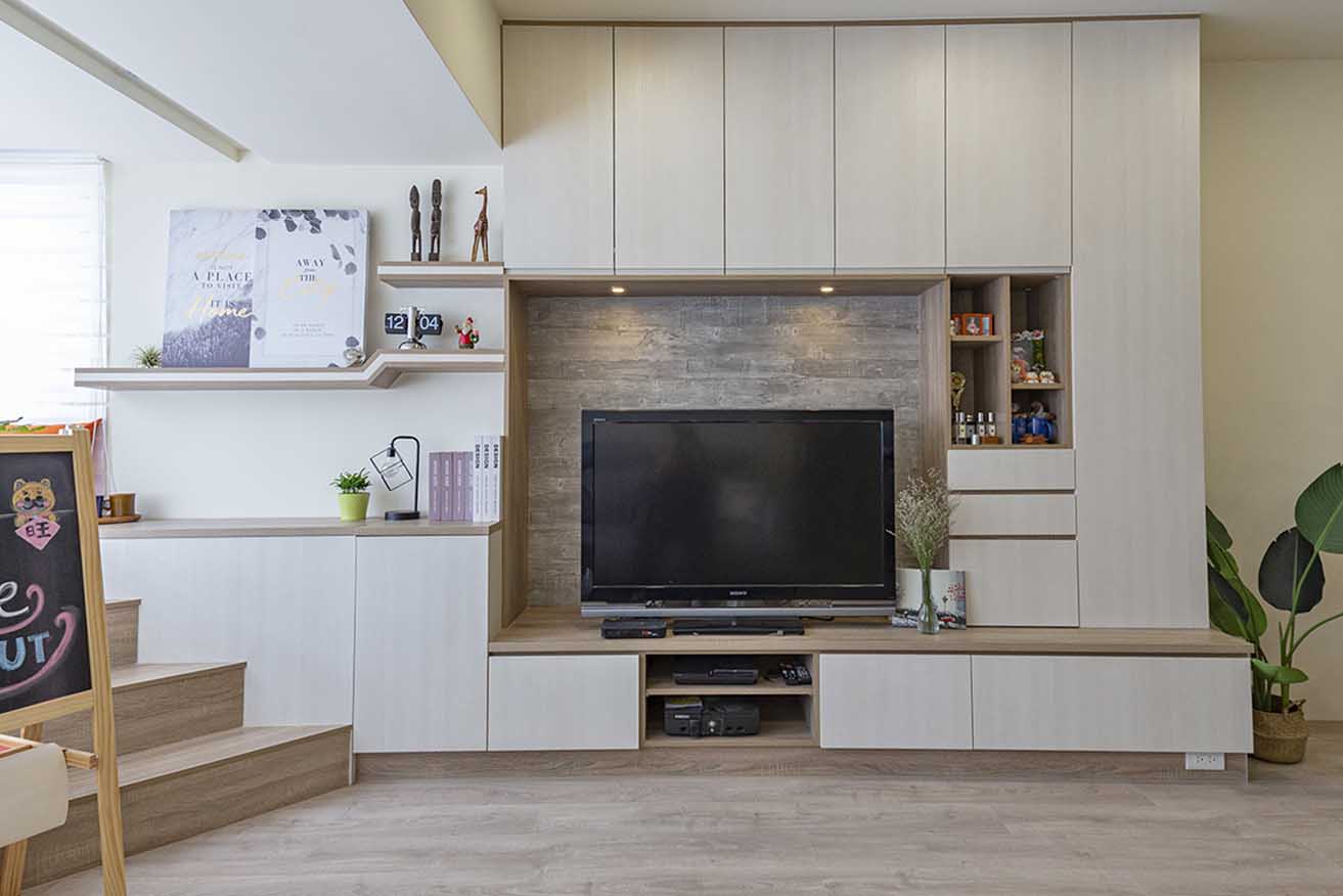 依循窗台轉至電視牆一側,中段受到柱體及配電箱緣故,導致深度相對較淺,於是以上掀櫃設計+開放層架,最大限度地拓增收納機能,而電視櫃則垂直向上增取使用空間,並於正立面規劃展示格櫃,使小孩的獎盃、獎狀得以陳列。