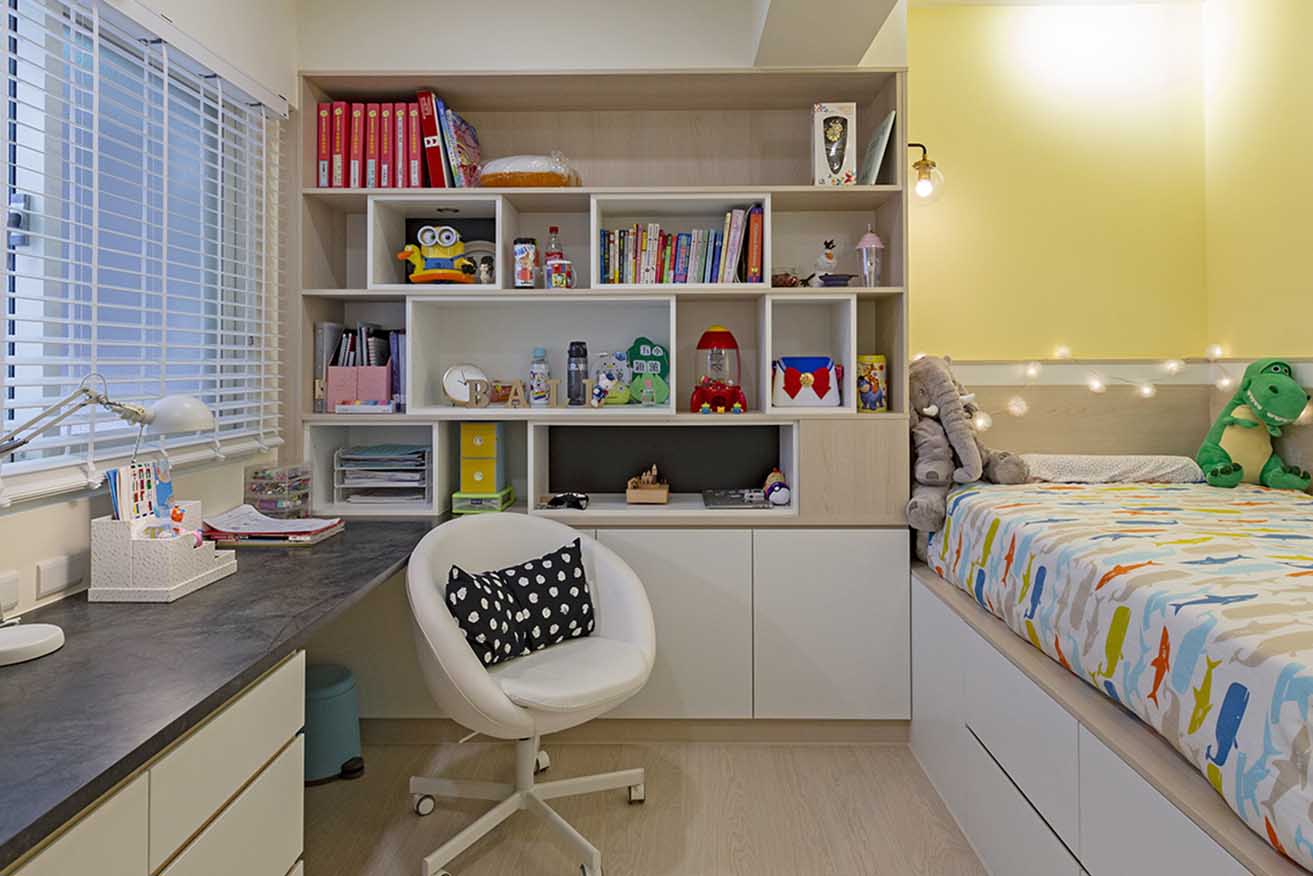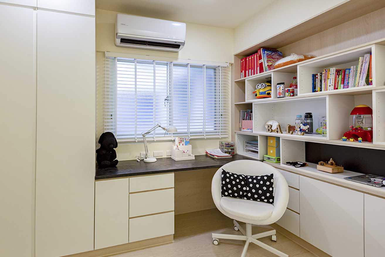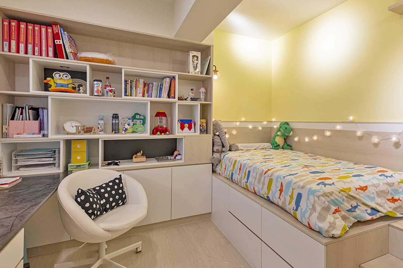 私領域將收納賦予多功能用途,如工作室的書櫃結合衣櫃機能,符合男女主人的衣物量;女兒房則將書櫃、書桌及衣櫃相互整合,並於壁面設置 Z 型層架,使心愛的絨毛玩具得以陳列,藉以發揮坪效最大值。