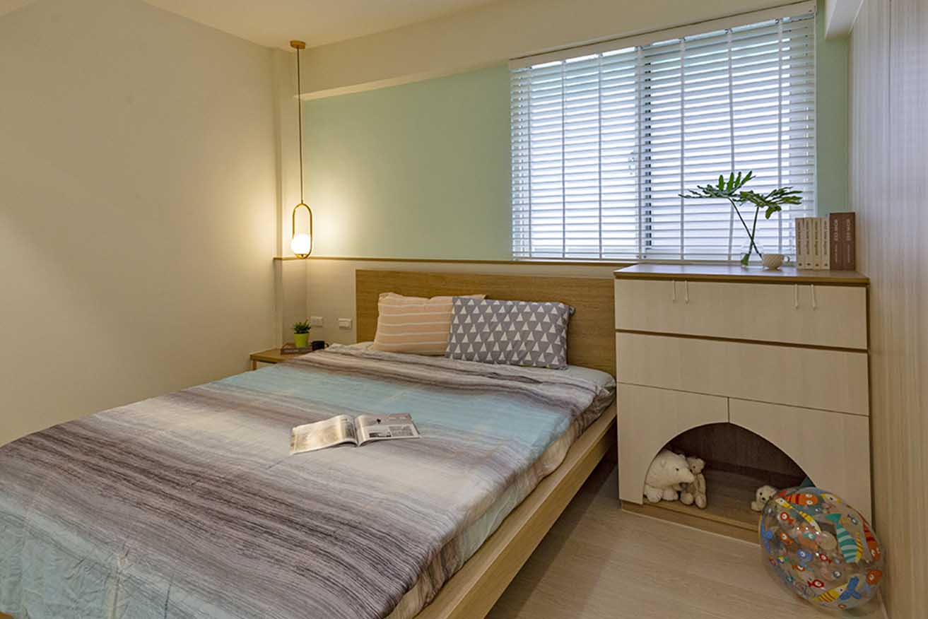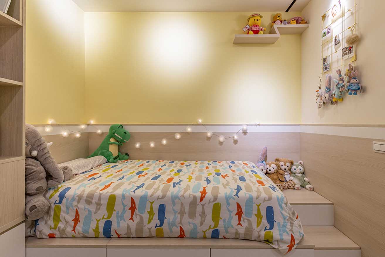 將更衣室移除後,擴展出敞闊寢臥環境,利用系統板材高度彈性優勢,於讓渡出的凹槽砌築兼具收納機能的床架,並且置入一段階梯,滿足屋主女兒希望有「走上去,抵達自己專屬空間」的儀式感。