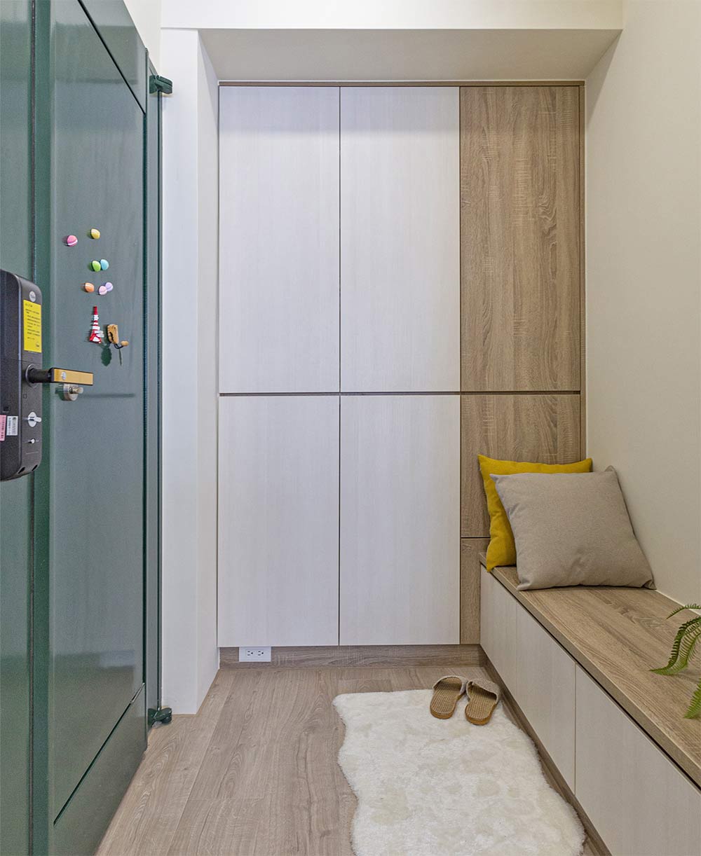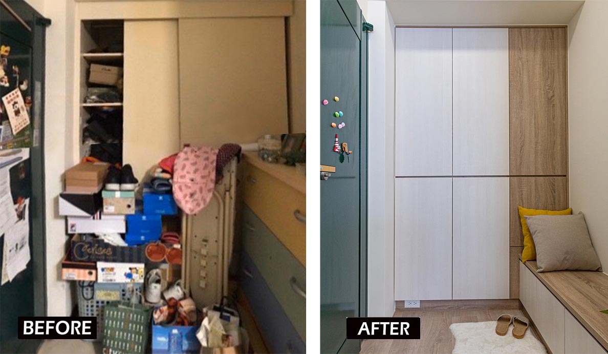 清新透亮,是甫進門後的第一印象。將正對大門、原放置五斗櫃的空間以穿鞋椅取代,透過壓低尺度使視野獲得延伸,消弭既有狹隘壓迫感,使收納機能絲毫不受影響。