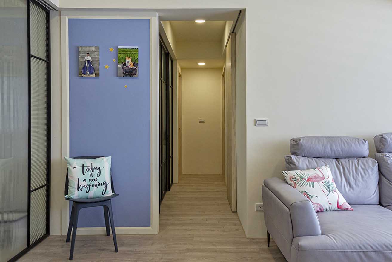 走進工作室前,帶有藍紫色調的壁面形成公私領域間的劃分,經由磁性漆使其能夠張貼生活照,成為一道溫馨回憶牆,也讓喜愛繪畫的女兒有發表創作的小天地。
