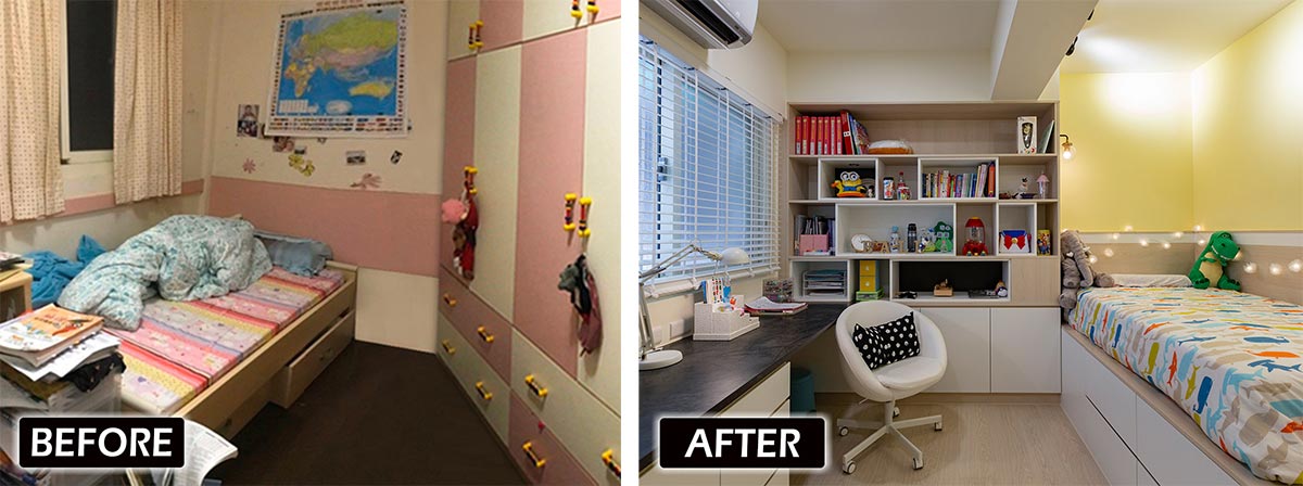 將床組位置挪動後,也間接化解先前床壓樑的情況,並將原有位置規劃成一面揉合了書櫃、書桌與衣櫃的多功能收納傢俱,並悉心根據生活作息與習慣,將書櫃側邊靠床處設置開放格櫃,用以擺放鬧鐘、睡前讀物以及整合插座設備。