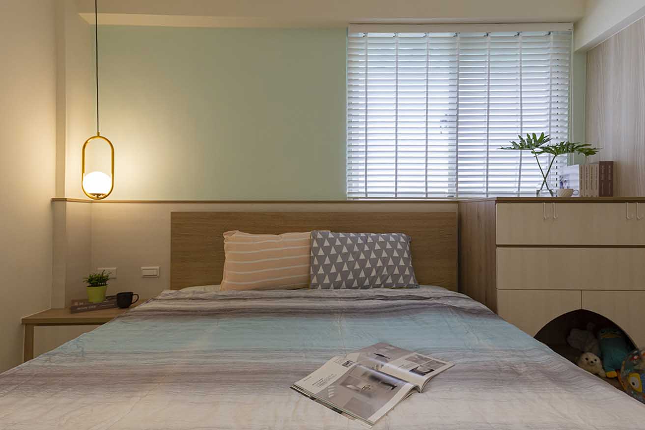 全室透過暖白與原木色調構築自然清爽氛圍,並將男主人所選定的深色橡木板材視作主軸,點綴在客廳電視牆、工作室櫃體,經由細膩調和深淺比例,築構恰到好處的舒適環境。私領域則同樣交由屋主挑選喜愛色調,如主臥室以清新粉綠搭配純白百葉簾,透散天然純淨北歐風氣息;女兒房則以澄淨鵝黃色圍塑明亮活潑調性,使每個空間流露專屬個性。